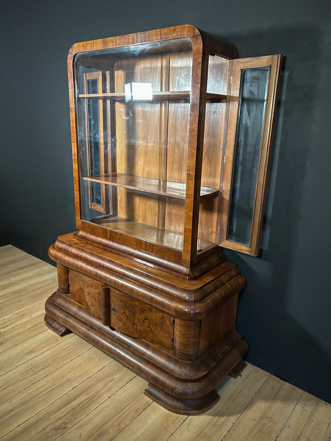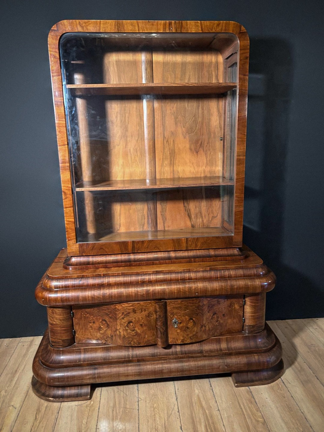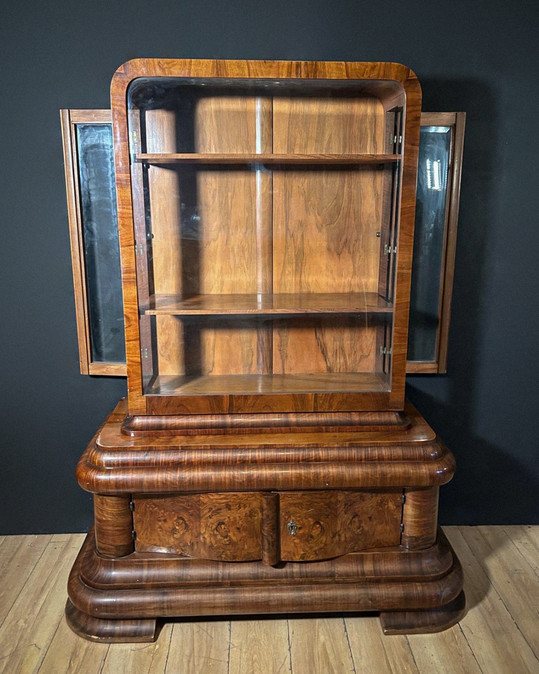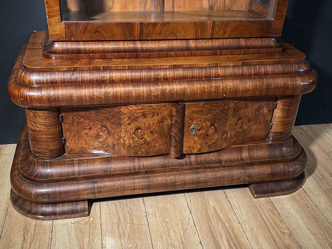 Elegante vetrina Art Déco, di manifattura italiana, realizzata in legno di noce e radica di noce con finitura lucida a gommalacca, databile agli anni ’30 del Novecento.