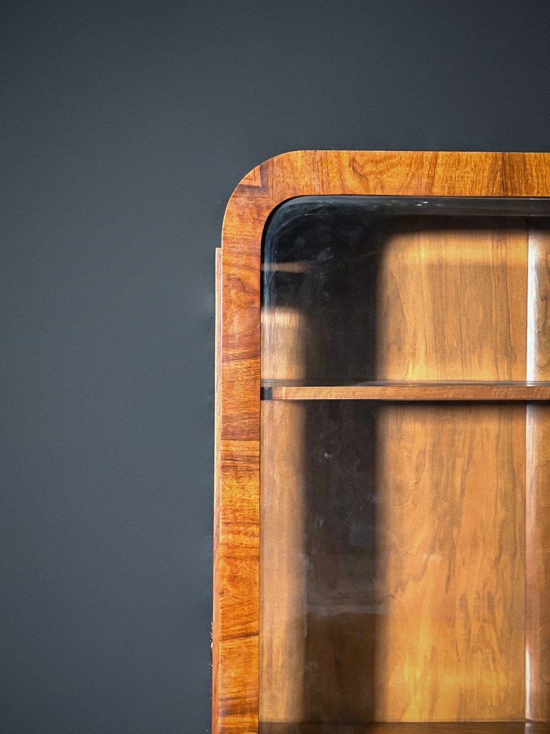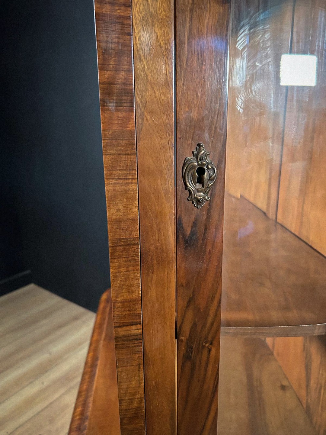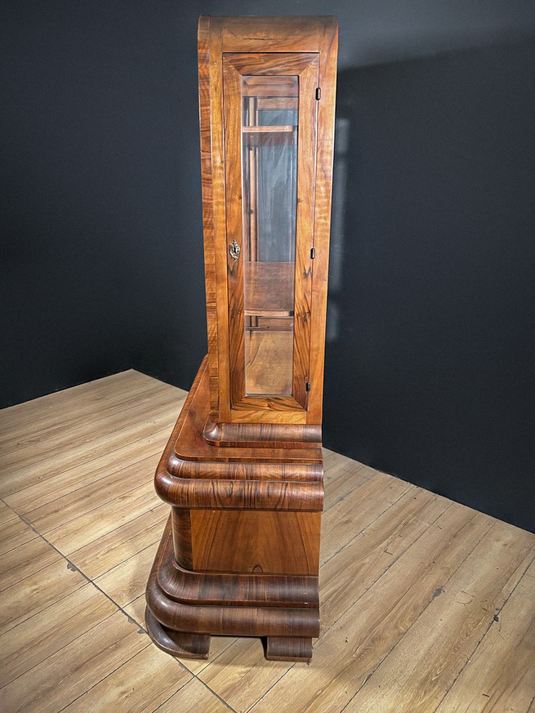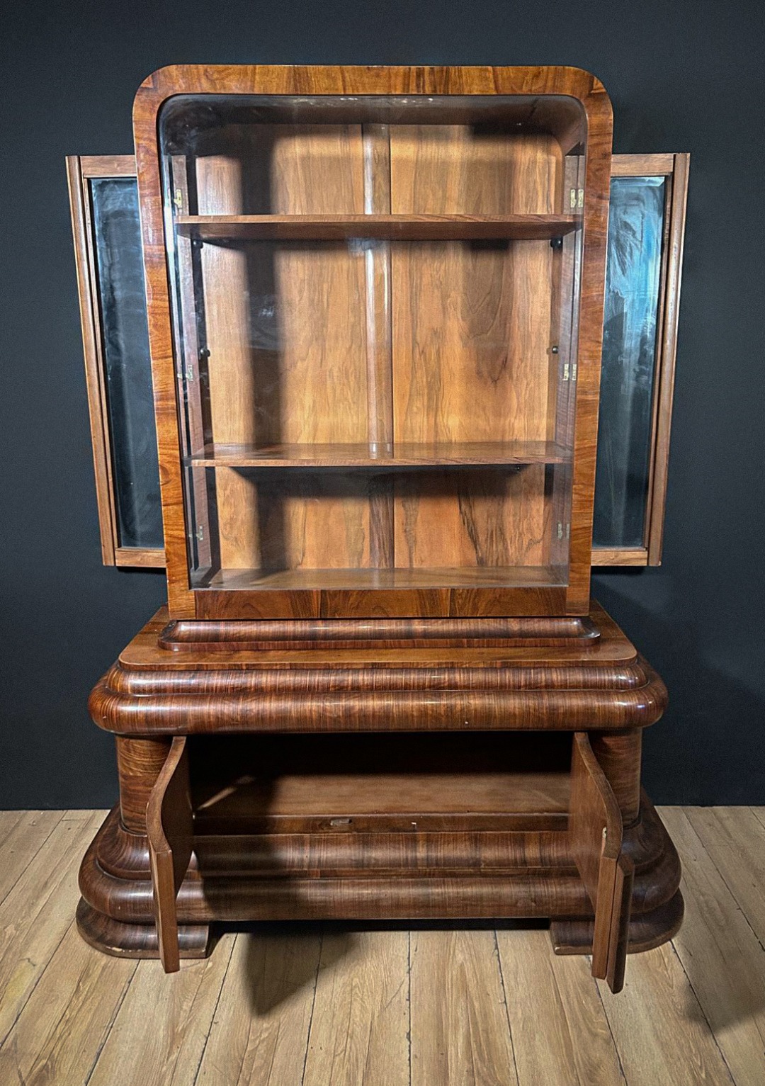 Elegante vetrina Art Déco, di manifattura italiana, realizzata in legno di noce e radica di noce con finitura lucida a gommalacca, databile agli anni ’30 del Novecento.