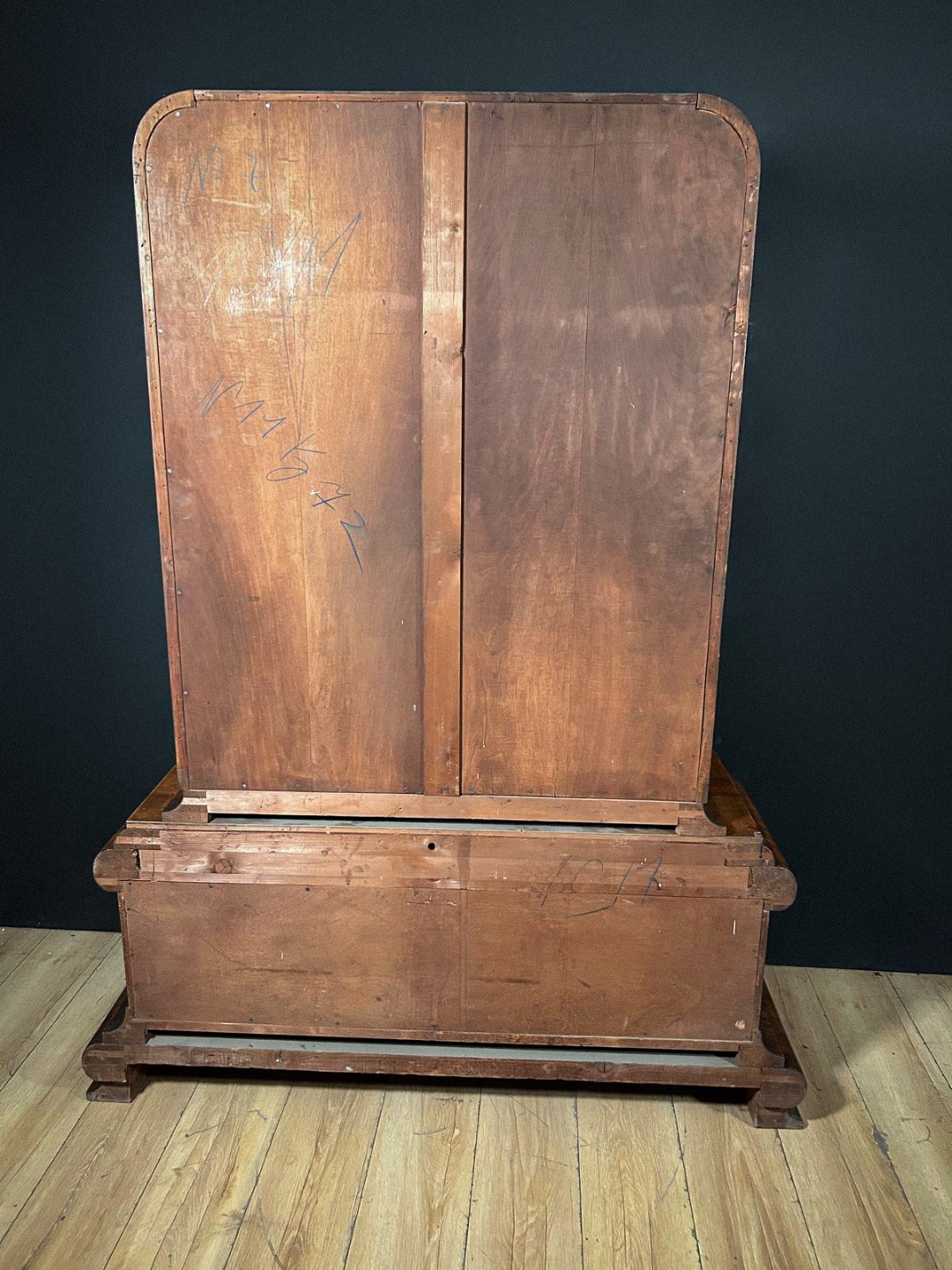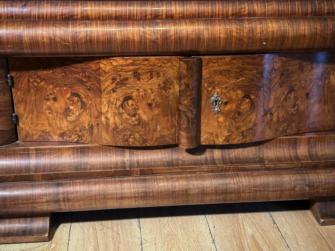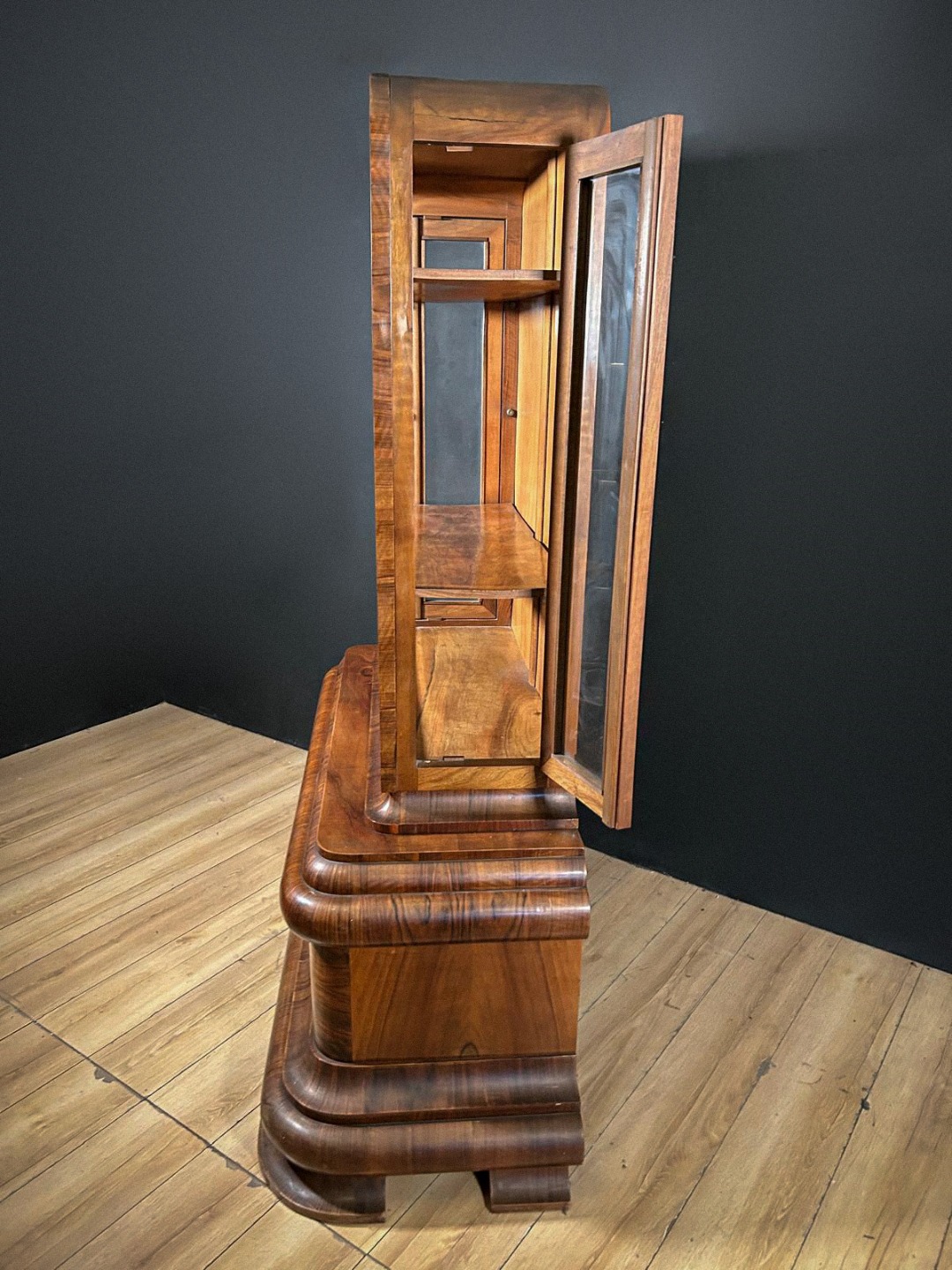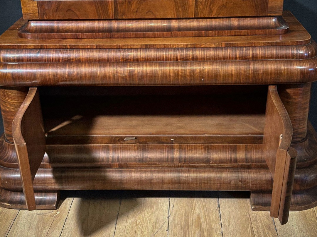 La linea è tipica dello stile déco, con forme bombate e profili arrotondati, espressione del gusto modernista dell’epoca. Il corpo inferiore, massiccio e sagomato, ospita due ante mosse in radica con serratura centrale e spazio interno ampio per la custodia di oggetti o servizi da tavola.