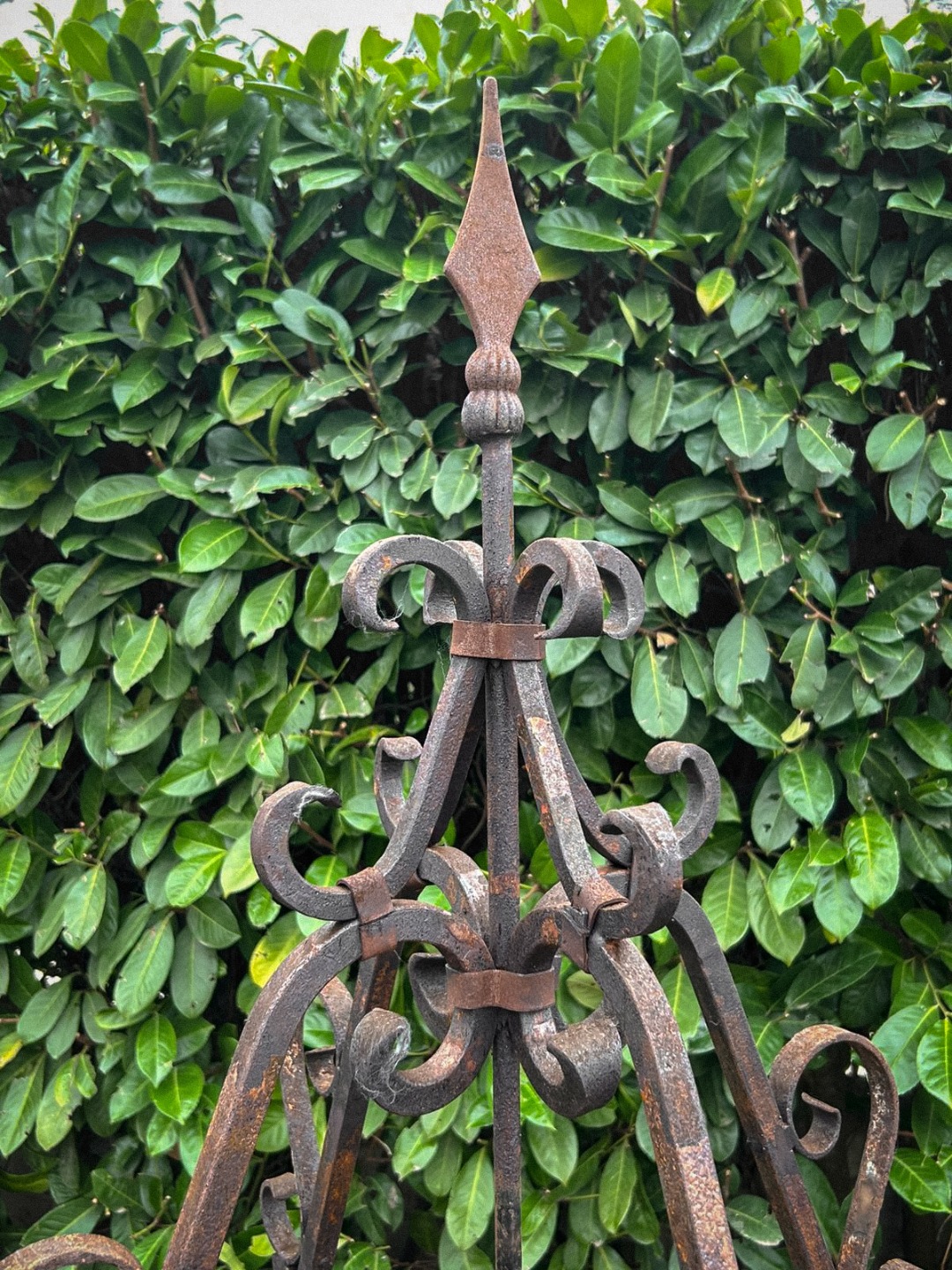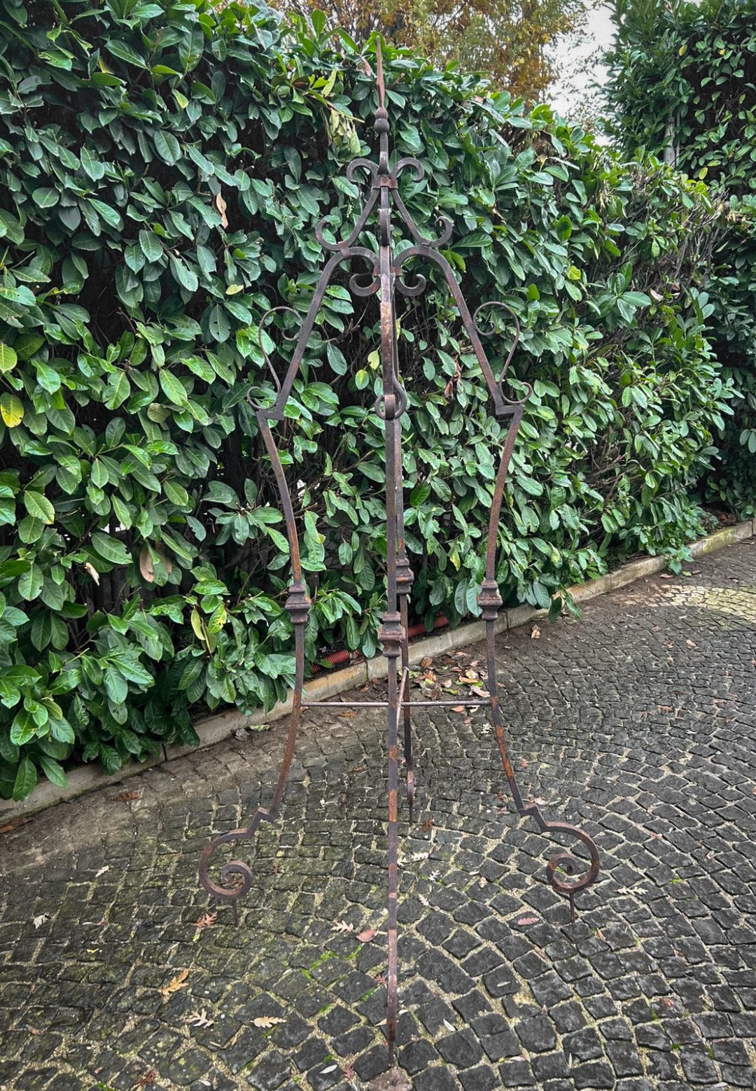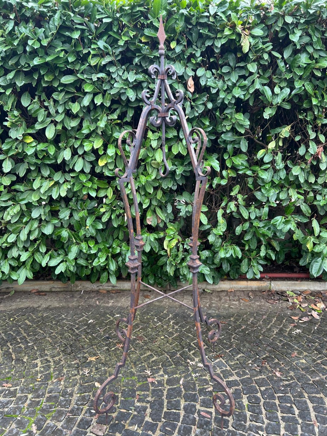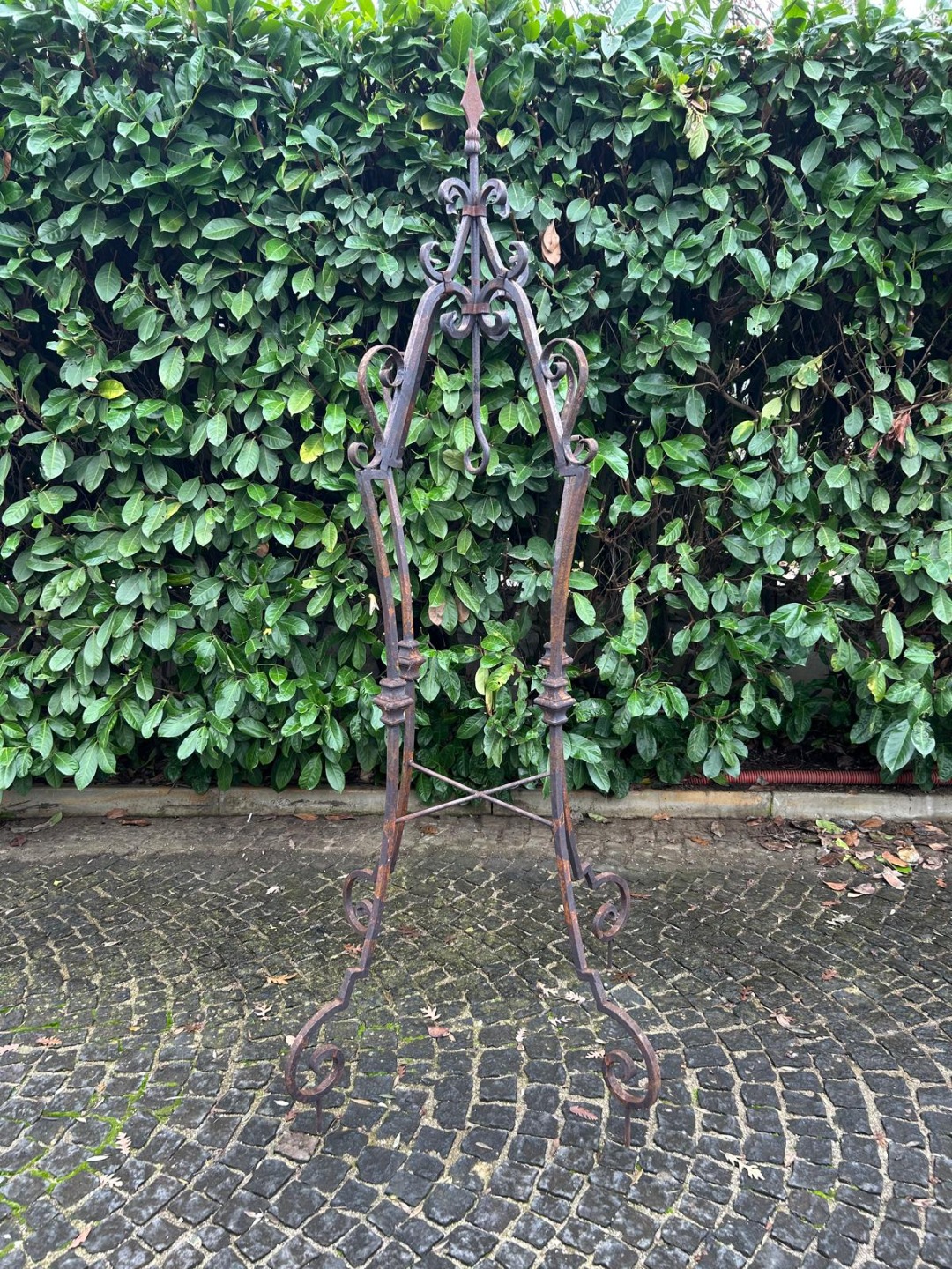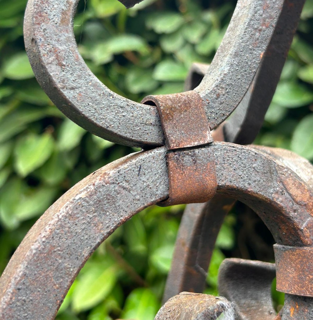 Elegante arco per pozzo realizzato interamente in ferro battuto, appartenente ai primi decenni del Novecento. La struttura, forgiata a mano, presenta linee mosse e sinuose con riccioli ornamentali distribuiti su tutta l’alzata, dettaglio tipico della lavorazione artigianale dell’epoca.