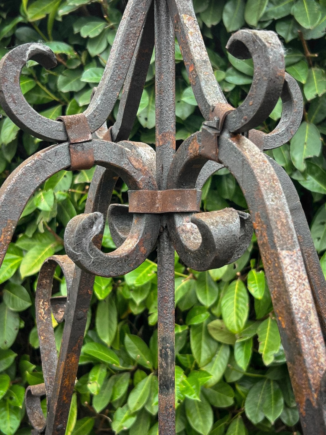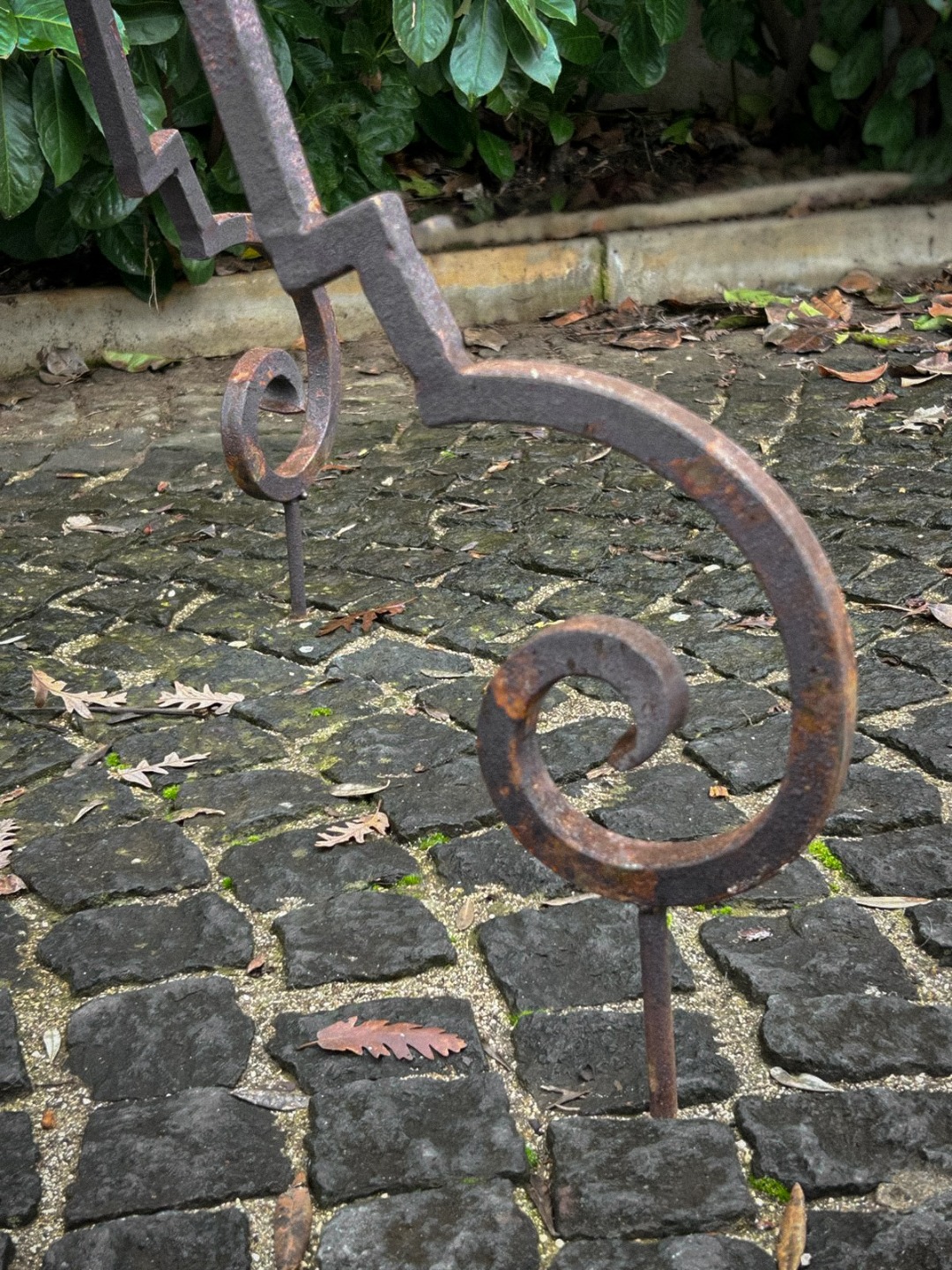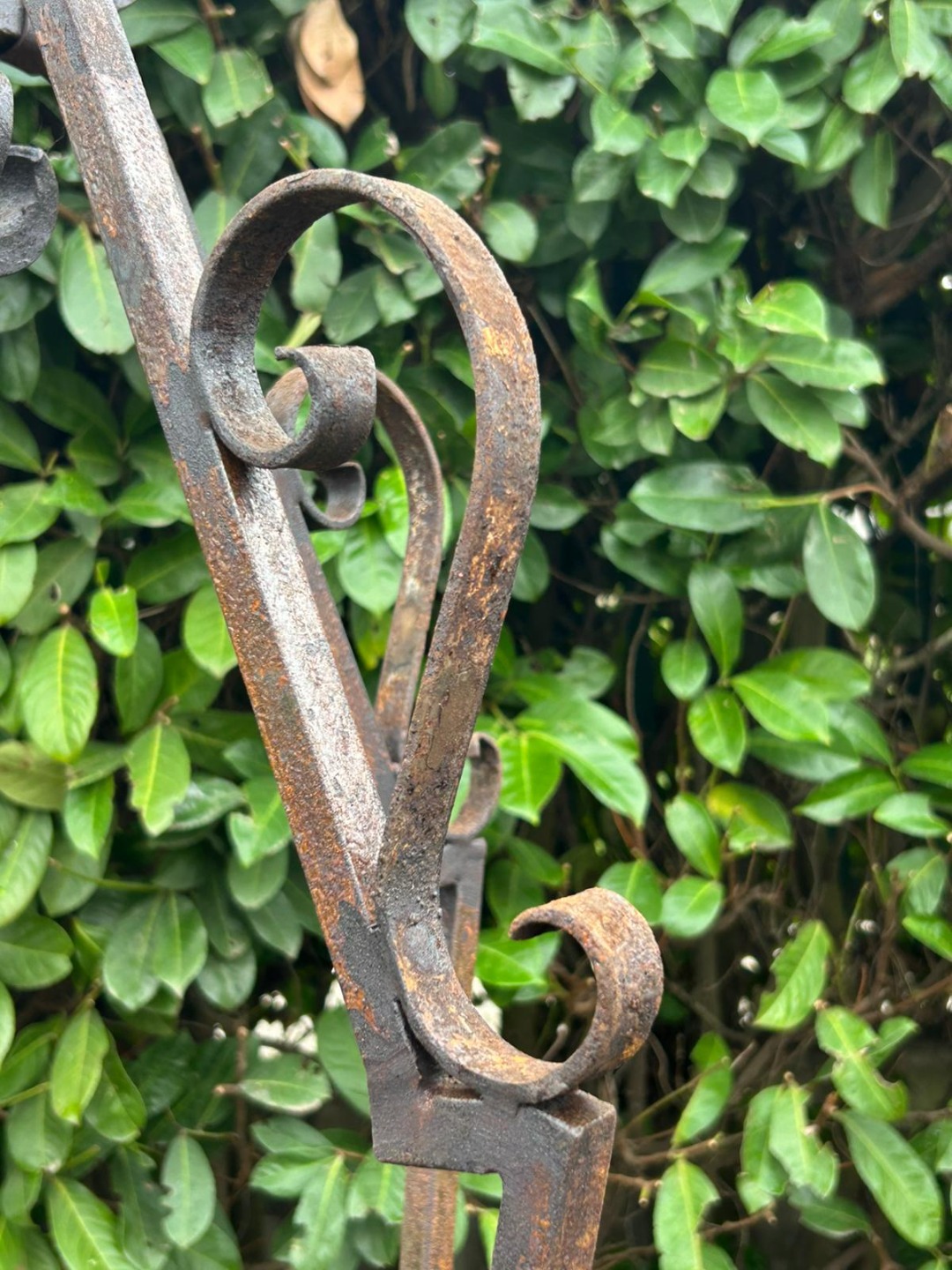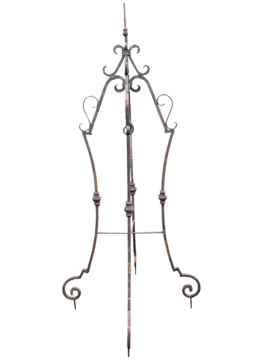 Elegante arco per pozzo realizzato interamente in ferro battuto, appartenente ai primi decenni del Novecento. La struttura, forgiata a mano, presenta linee mosse e sinuose con riccioli ornamentali distribuiti su tutta l’alzata, dettaglio tipico della lavorazione artigianale dell’epoca.
