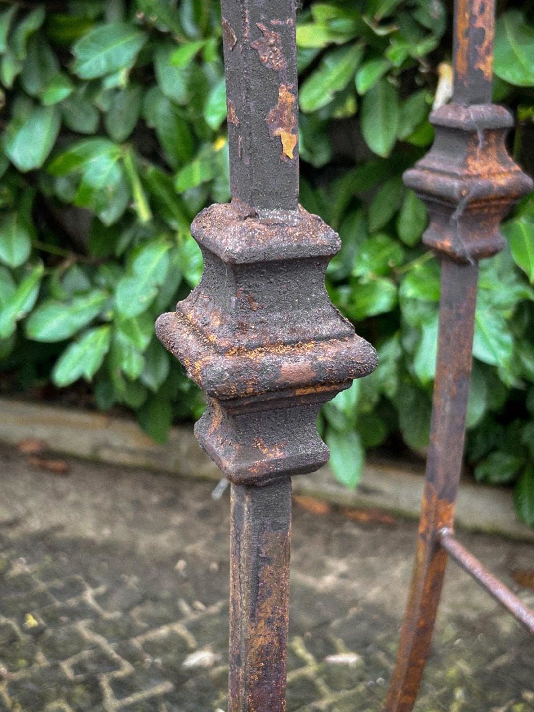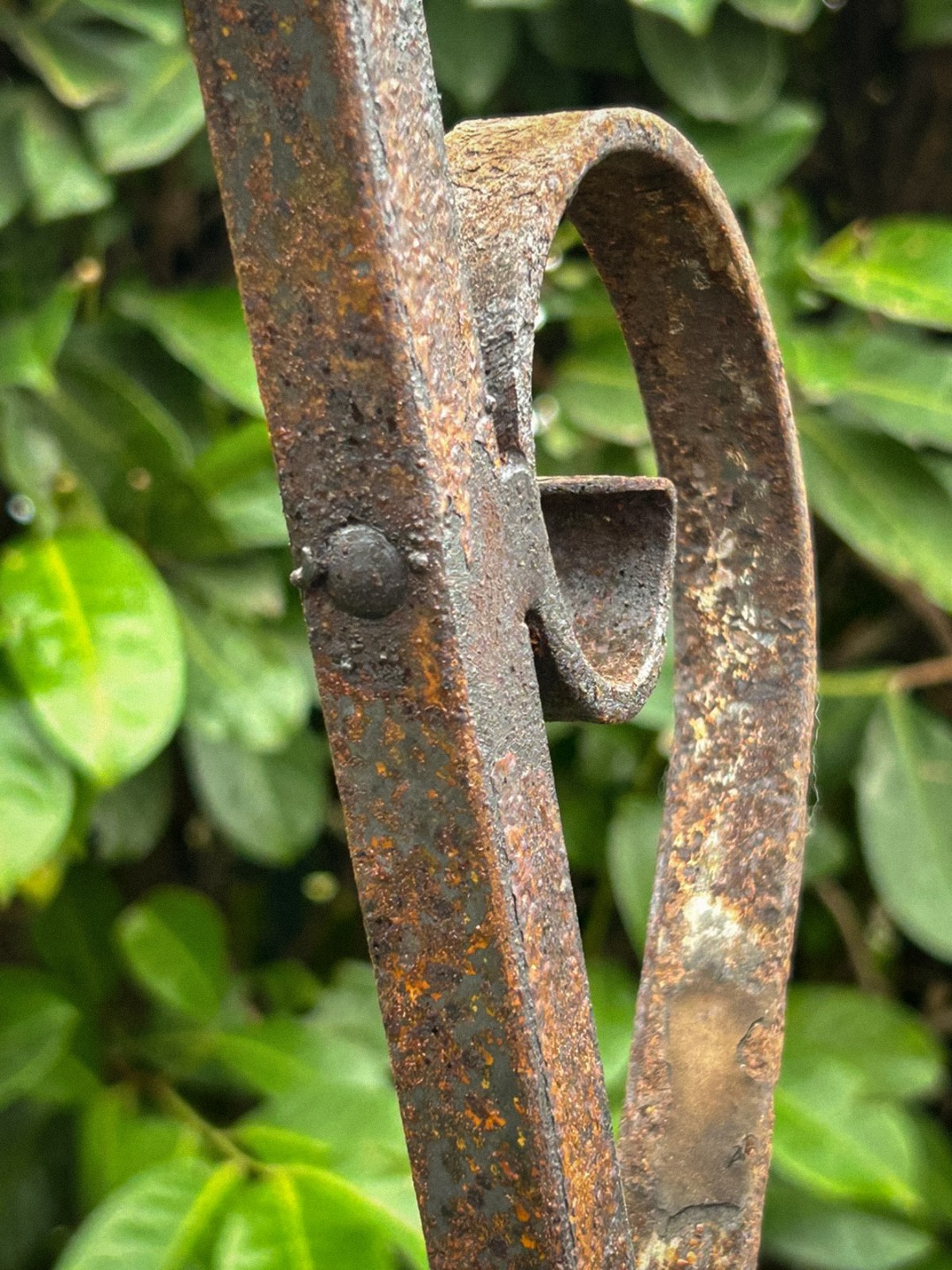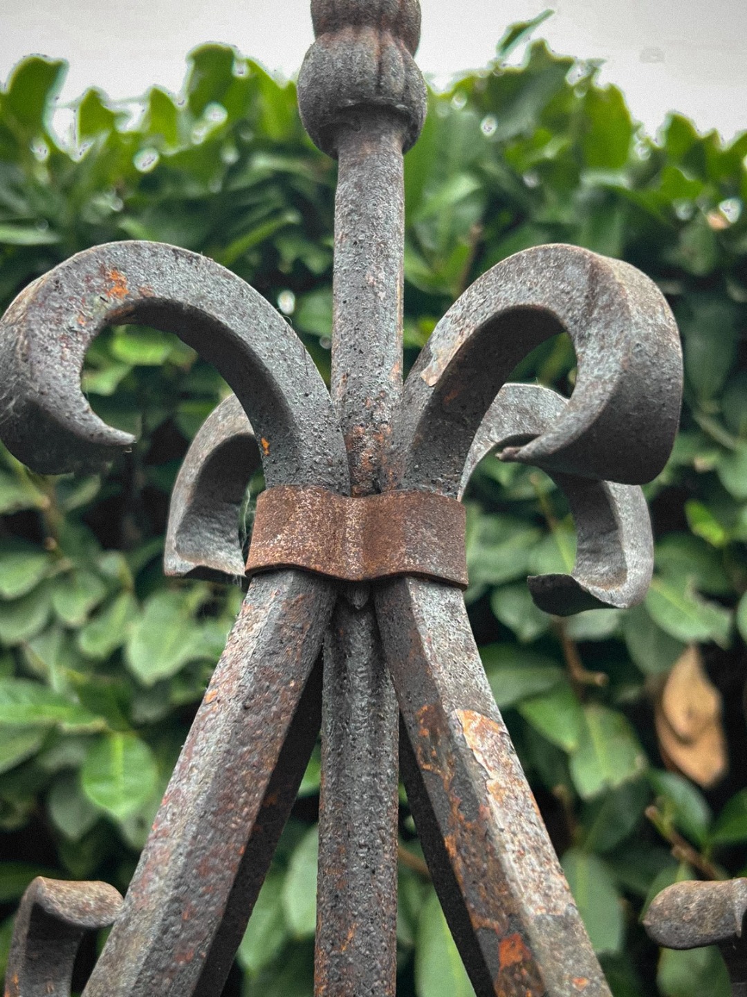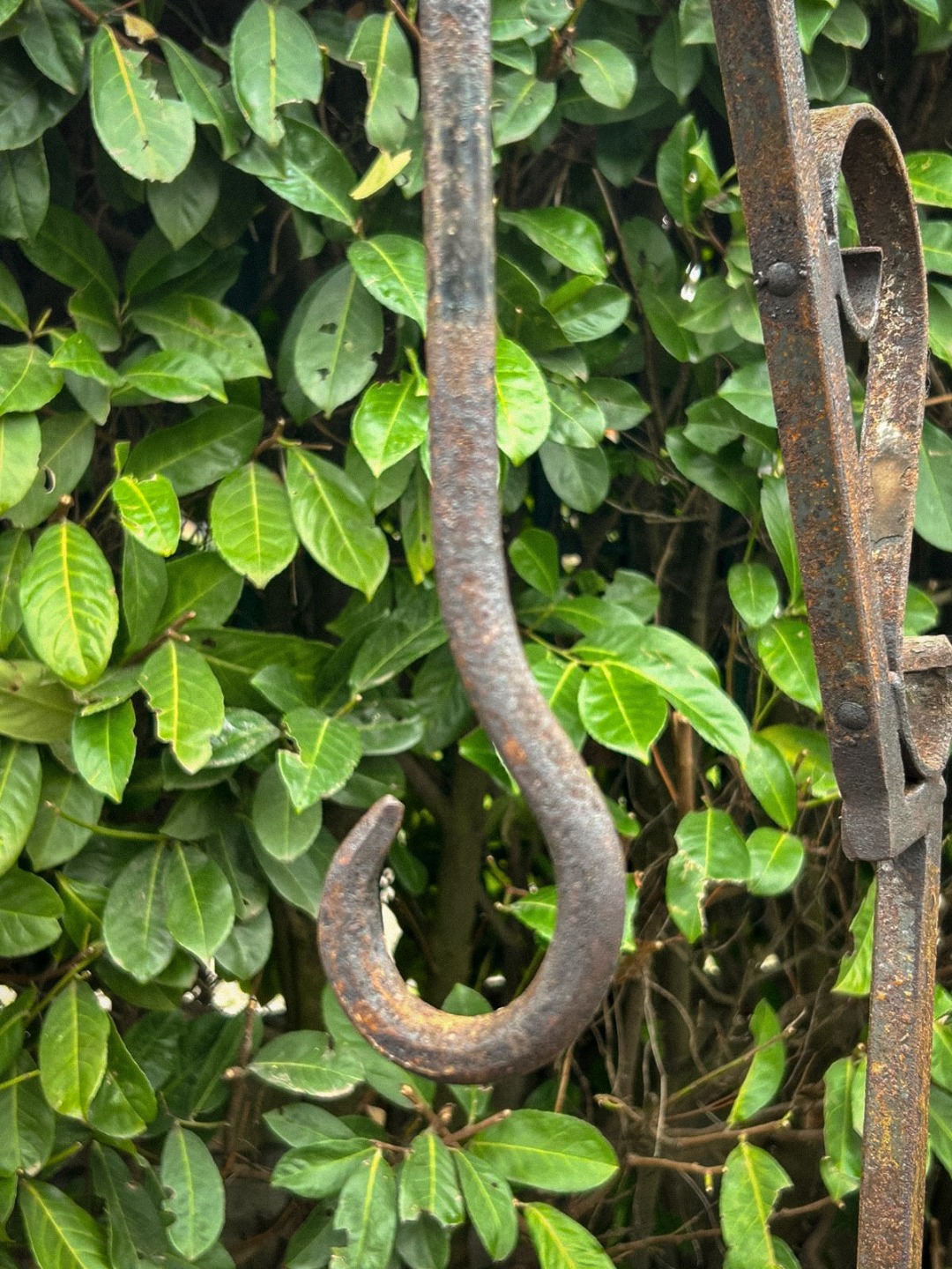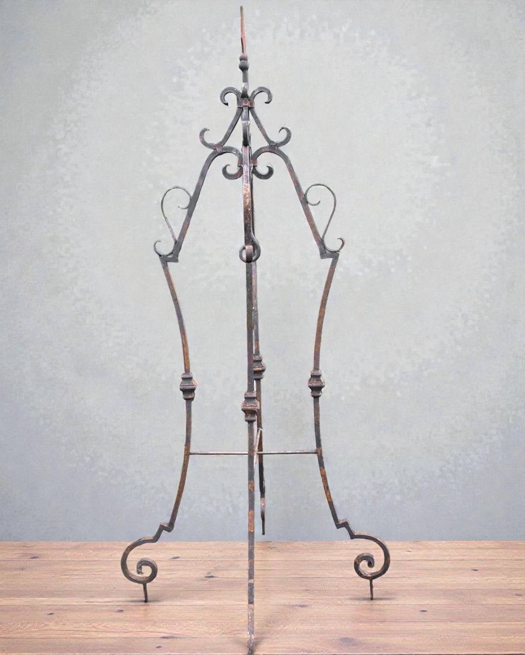 Elegante arco per pozzo realizzato interamente in ferro battuto, appartenente ai primi decenni del Novecento. La struttura, forgiata a mano, presenta linee mosse e sinuose con riccioli ornamentali distribuiti su tutta l’alzata, dettaglio tipico della lavorazione artigianale dell’epoca.