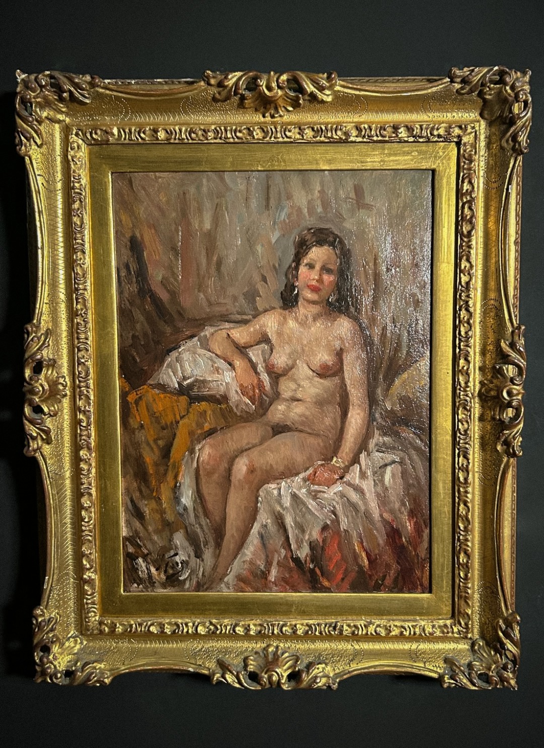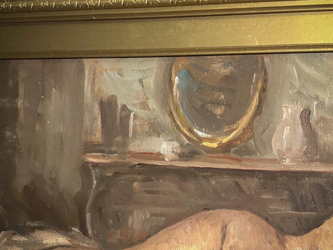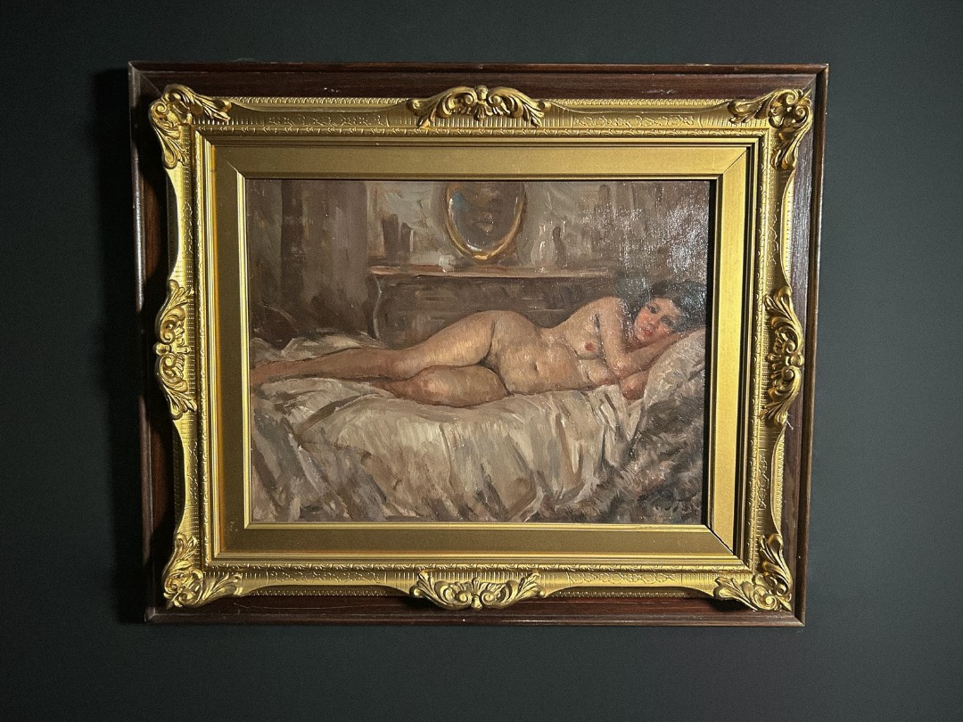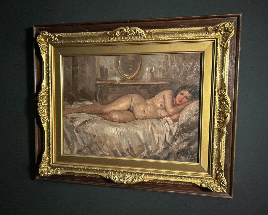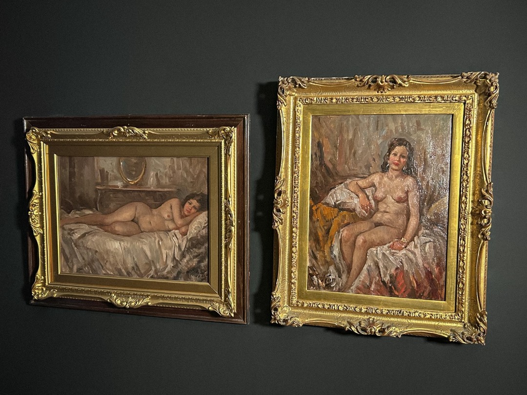 Antica coppia di dipinti a olio su tavola di Attilio Toro. Pennellata densa e toni luminosi esaltano due nudi femminili in pose intime, eleganti e naturalistiche, con cornici importanti che valorizzano l’insieme.