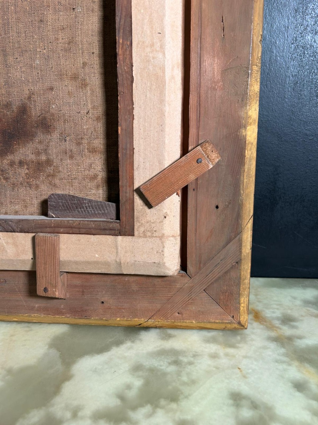 La pittura mostra una stesura accurata e raffinata, tipica della produzione settecentesca, con passaggi tonali armoniosi e una buona profondità prospettica. Il dipinto è corredato da cornice coeva in legno dorato, finemente lavorata, che incornicia l’opera esaltandone il carattere solenne e devozionale. Un’importante testimonianza della pittura religiosa del XVIII secolo, ideale per collezionisti e ambienti di rappresentanza.