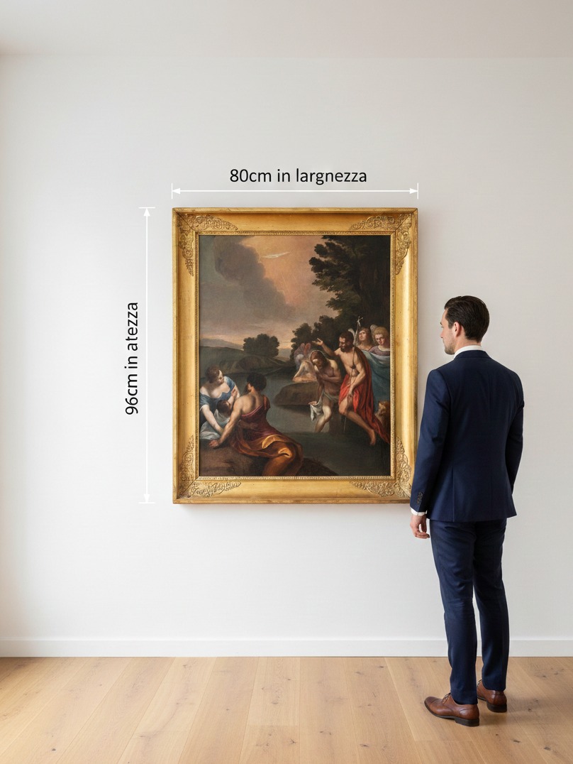 Antico dipinto di epoca XVIII secolo, realizzato con la tecnica dell’olio su tela. L’opera raffigura la scena religiosa del Battesimo di Cristo, ambientata lungo le rive del fiume Giordano. Al centro della composizione è rappresentato Cristo in atteggiamento umile e raccolto, mentre riceve il battesimo da San Giovanni Battista, raffigurato nell’atto benedicente con il bastone e il tradizionale manto rosso.