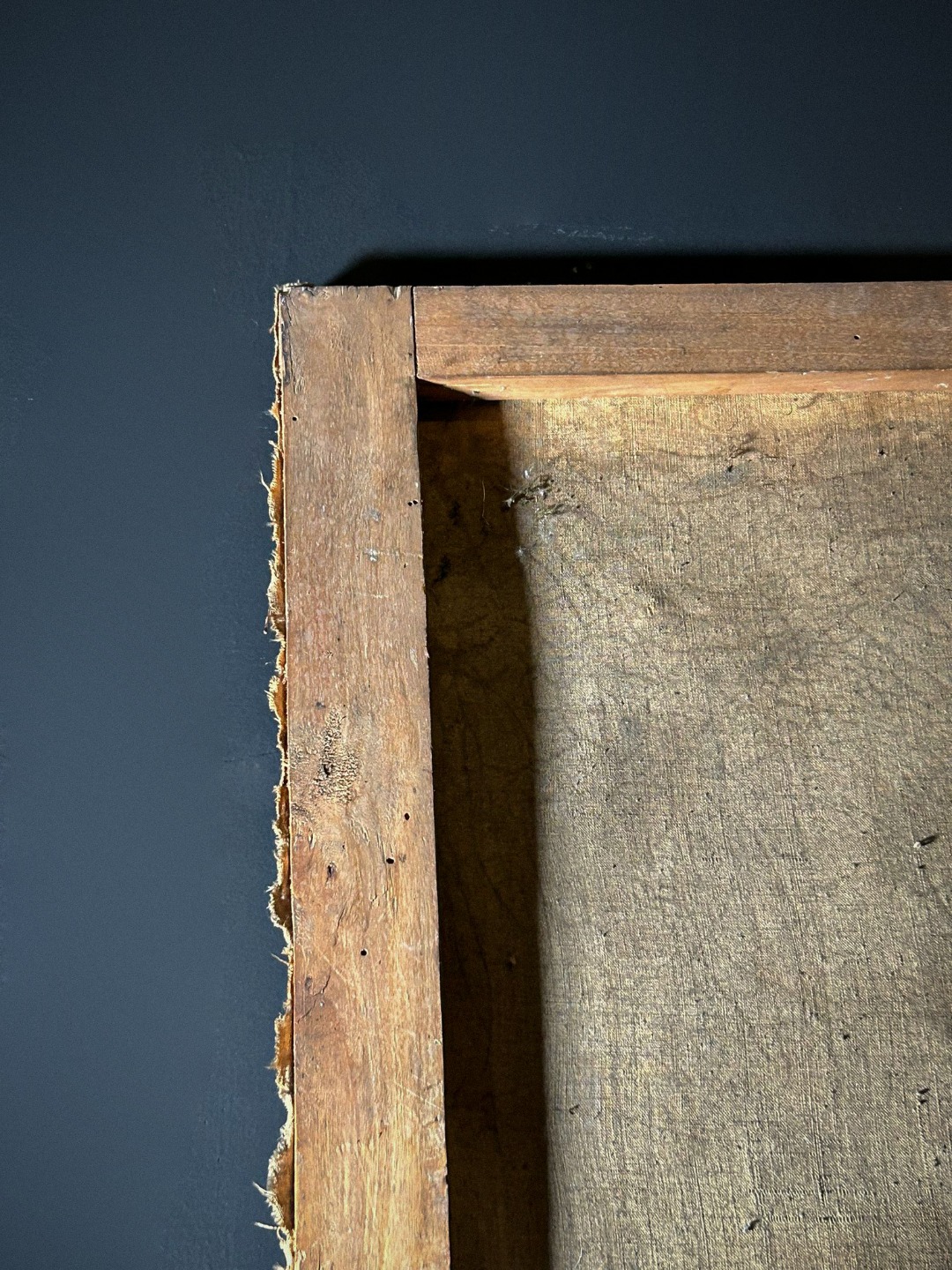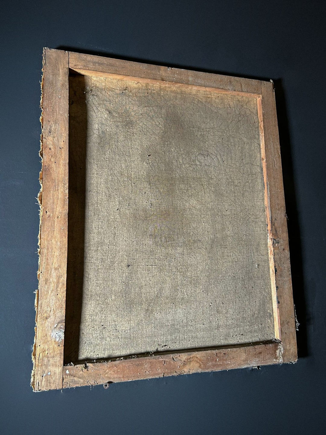 La tela presenta una bella craquelure uniforme, tipica dell’epoca, che conferma la sua antichità. Il retro del telaio originale in legno mostra l’usura naturale del tempo.