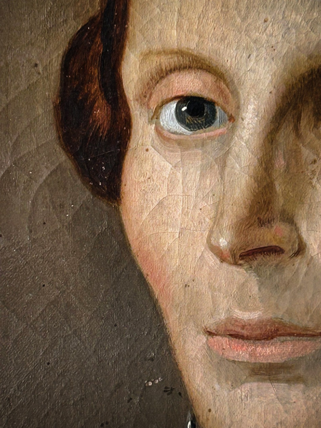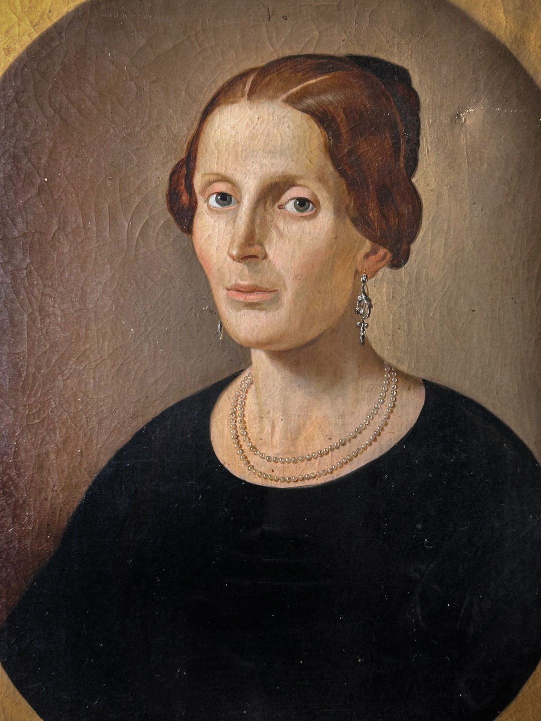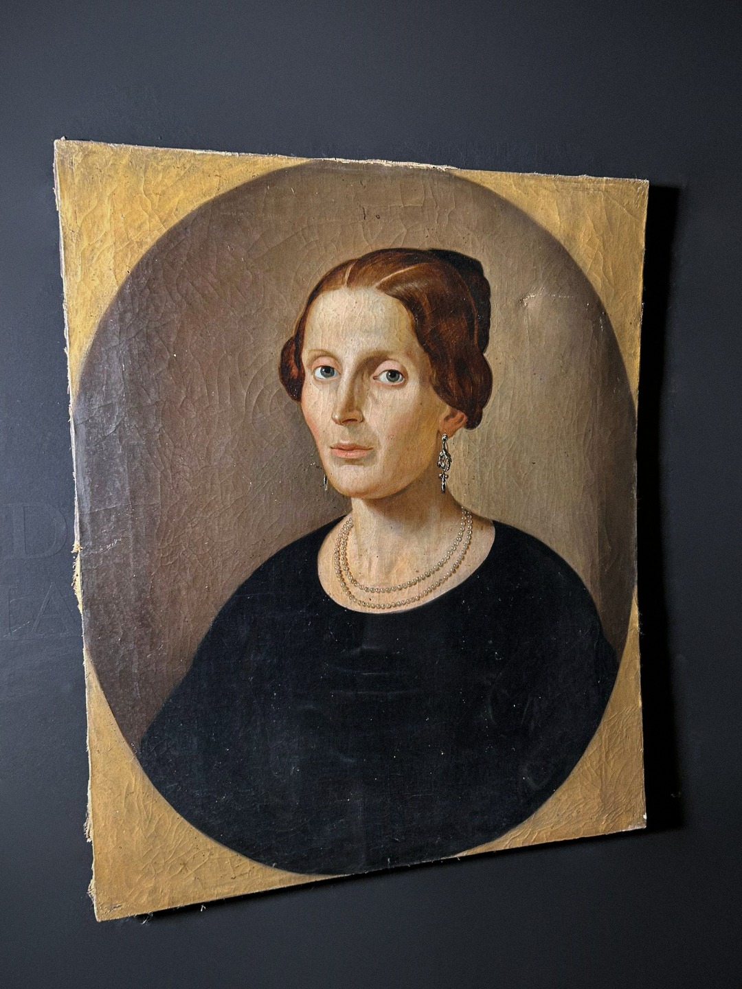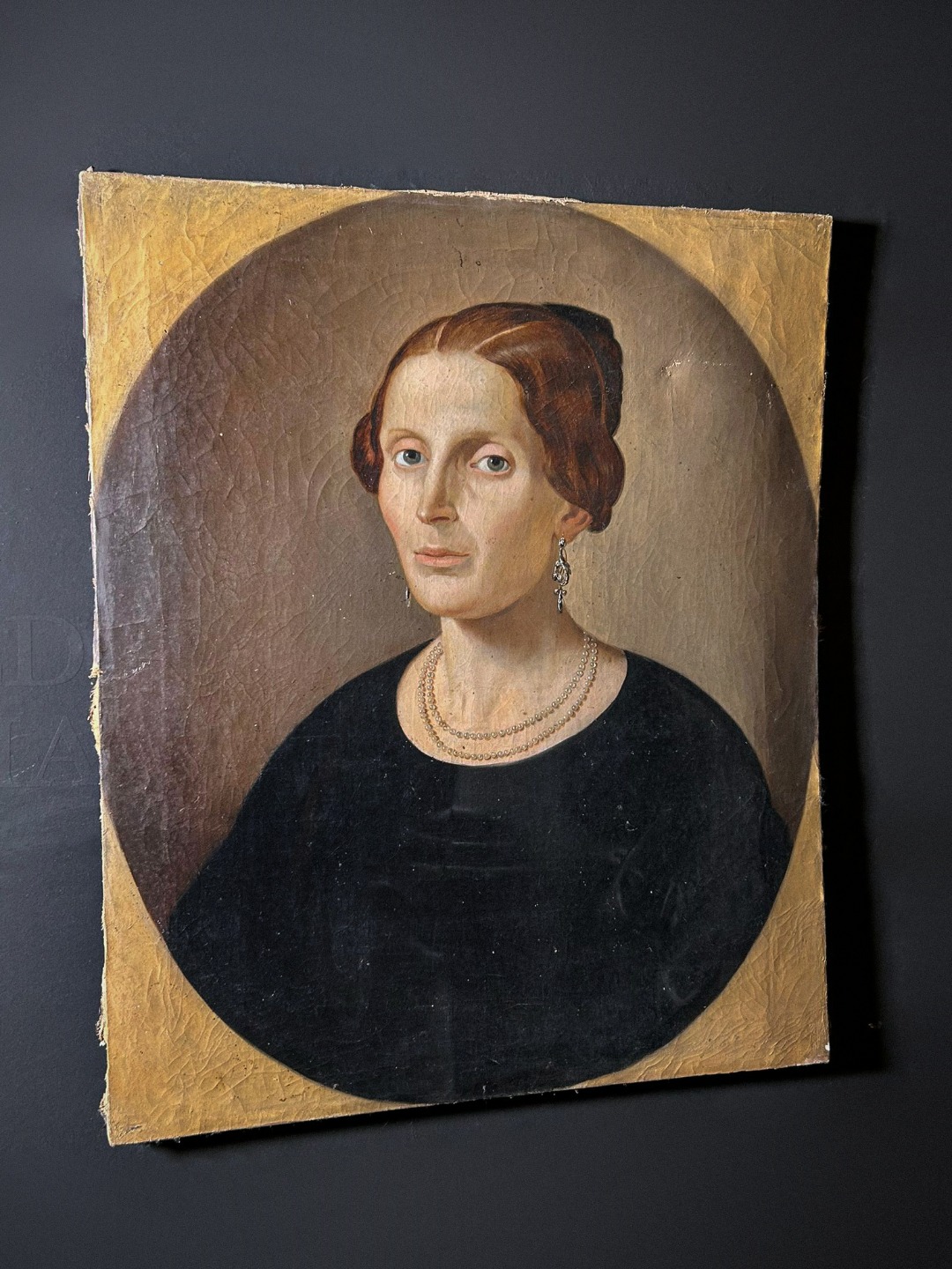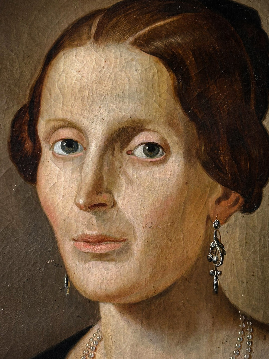 Elegante ritratto femminile realizzato a olio su tela, databile alla metà dell’Ottocento. L’opera raffigura una donna dall’aspetto aristocratico, caratterizzata da lineamenti delicati, incarnato luminoso e sguardo diretto, reso con grande attenzione psicologica. I dettagli del volto – in particolare occhi, labbra e incarnato – mostrano una mano esperta, capace di una modellazione morbida e raffinata.