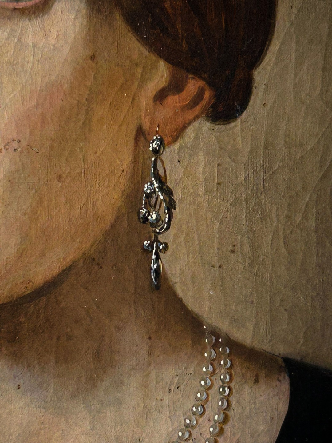 La figura indossa un abito scuro semplice ma elegante, impreziosito da una collana di perle a più fili e da pendenti elaborati, elementi che conferiscono un tono di sobria nobiltà. Lo sfondo, concepito con un effetto ovale in chiaroscuro, incornicia il volto mettendone in risalto l’espressività.