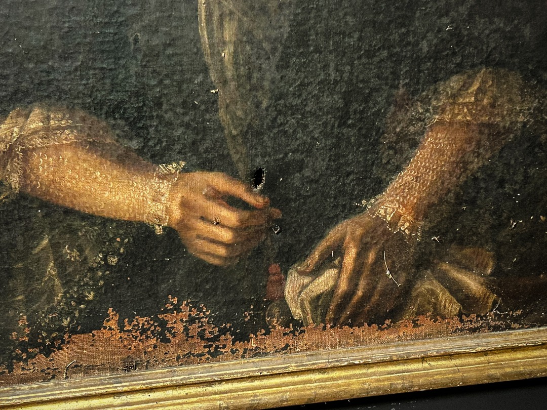 La pittura, dalle tonalità brune e ombrose, è caratterizzata da una stesura materica antica, con visibili craquelure su tutta la superficie, segni del tempo e alcune lacune nella parte inferiore, che aggiungono fascino e autenticità al dipinto.