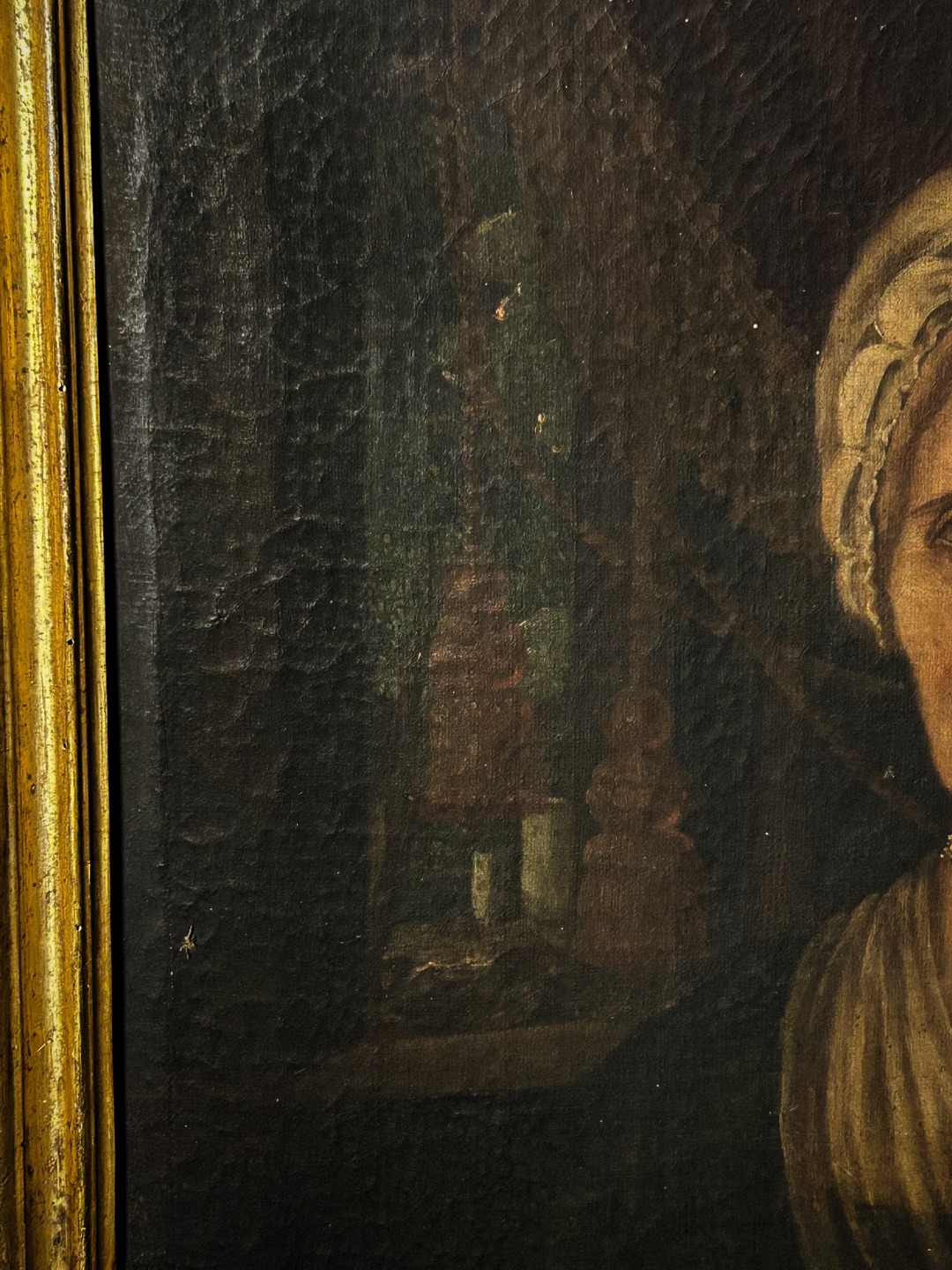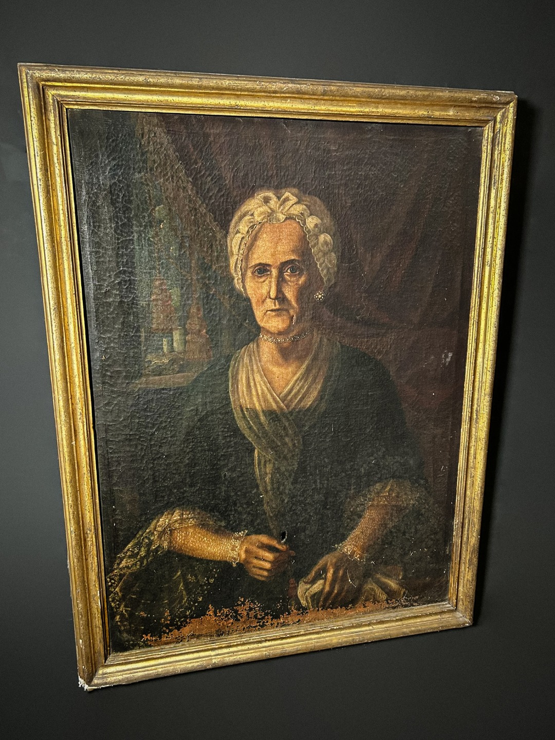 Conserva la sua cornice originale dorata dell’epoca, anch’essa con usura coerente con l’età.