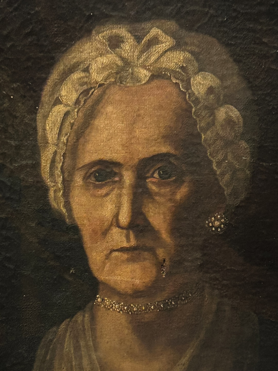 La dama indossa abiti ricchi di dettagli, con merletti finemente dipinti, gioielli al collo e ai polsi e una cuffia elaborata che incornicia il volto. In mano tiene un piccolo oggetto (strofinaccio), mentre l’altra poggia su un panno chiaro.