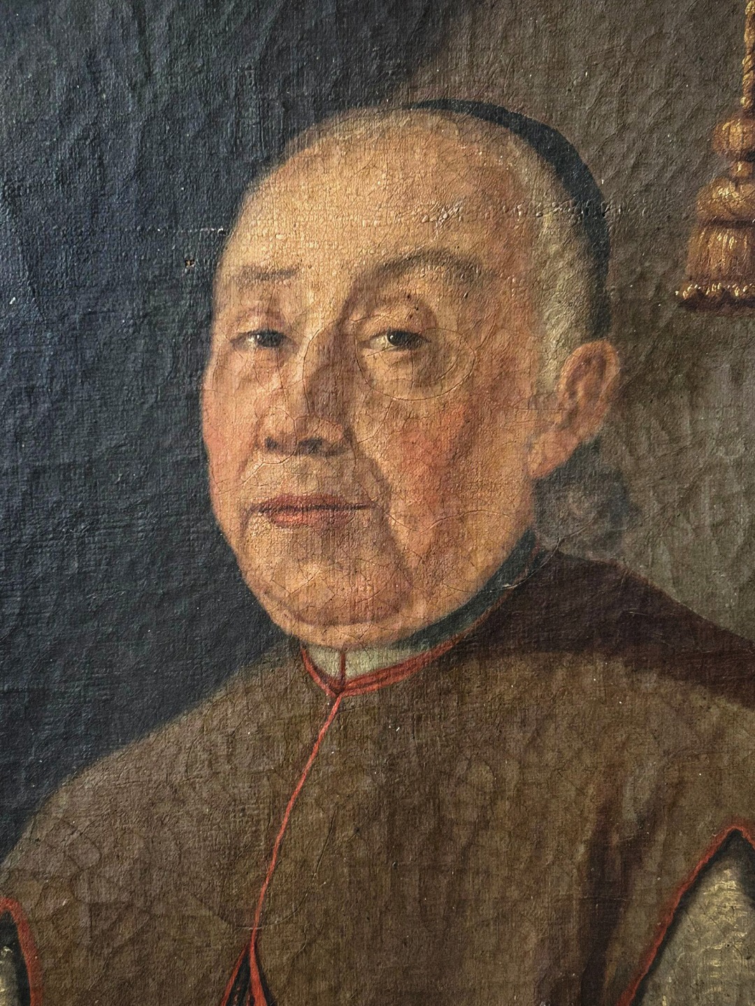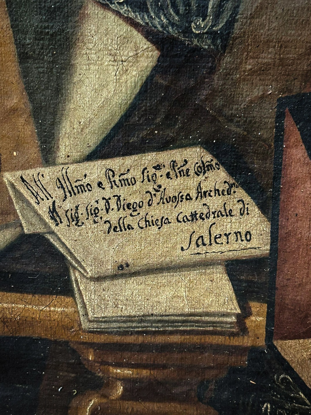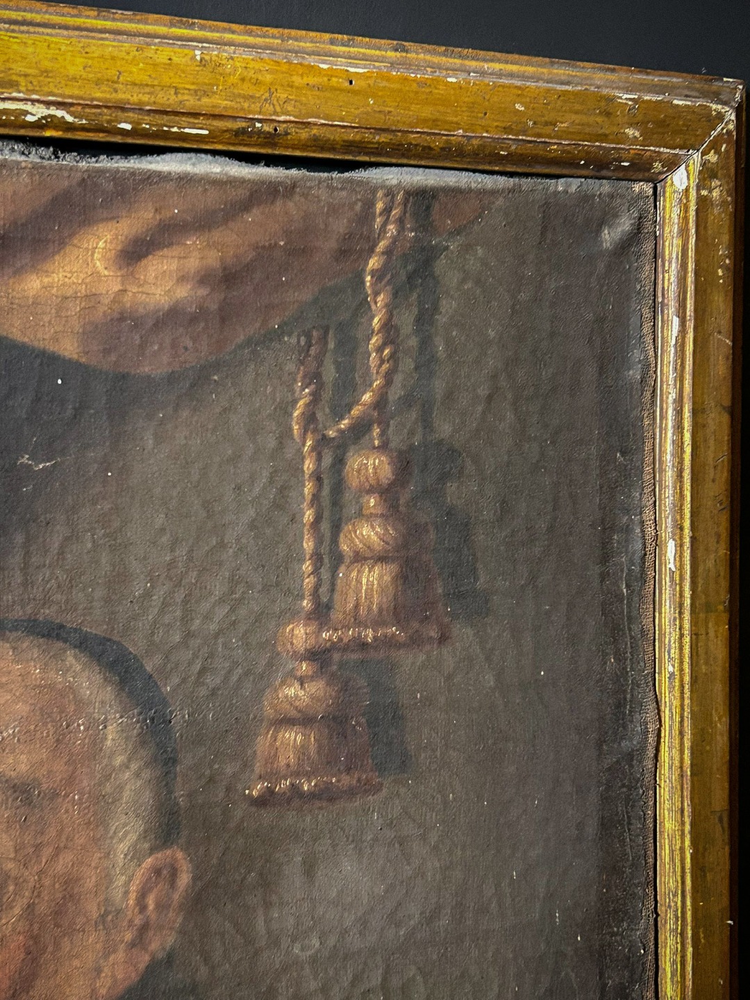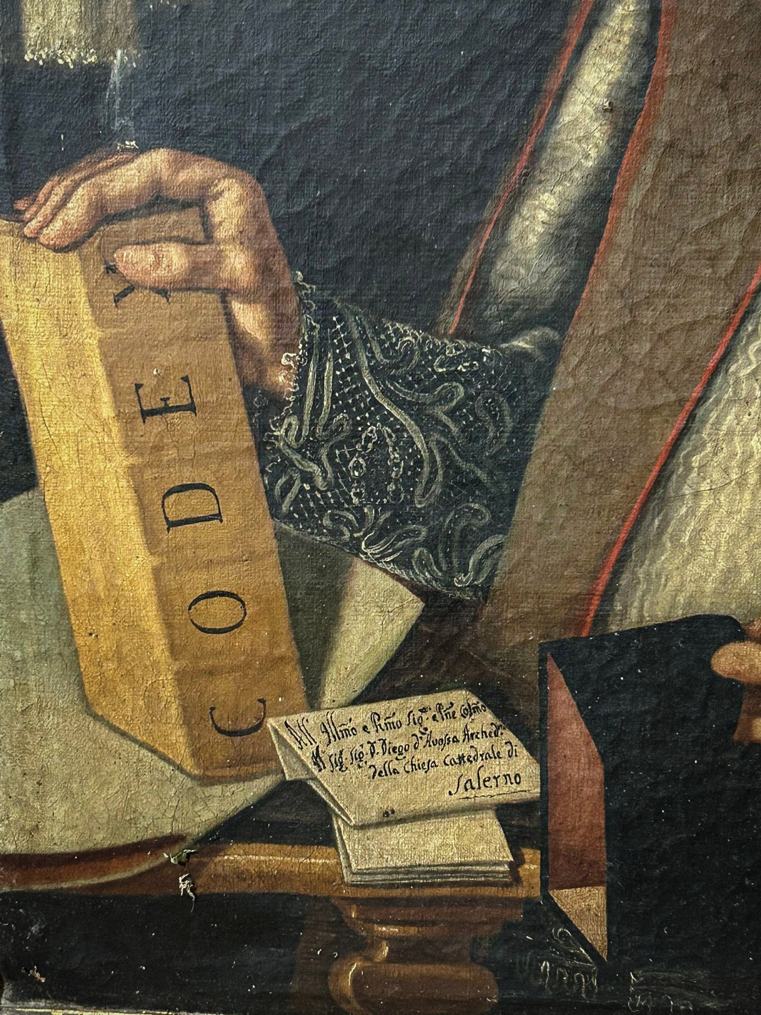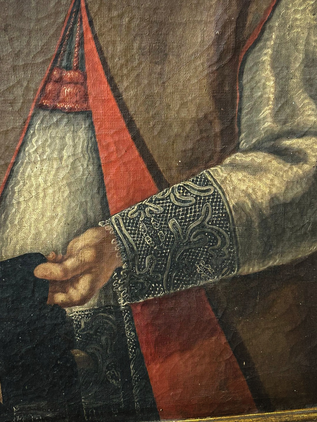 Importante dipinto antico, realizzato a olio su tela, raffigurante un ecclesiastico ritratto a mezzo busto in un ambiente interno arricchito da tendaggi e oggetti simbolici. L’opera, probabilmente databile tra XVIII e XIX secolo, presenta una composizione ricca di dettagli: il soggetto è rappresentato con abiti liturgici finemente descritti, caratterizzati da maniche ornate da complessi motivi decorativi.