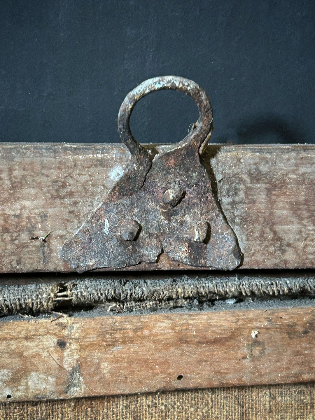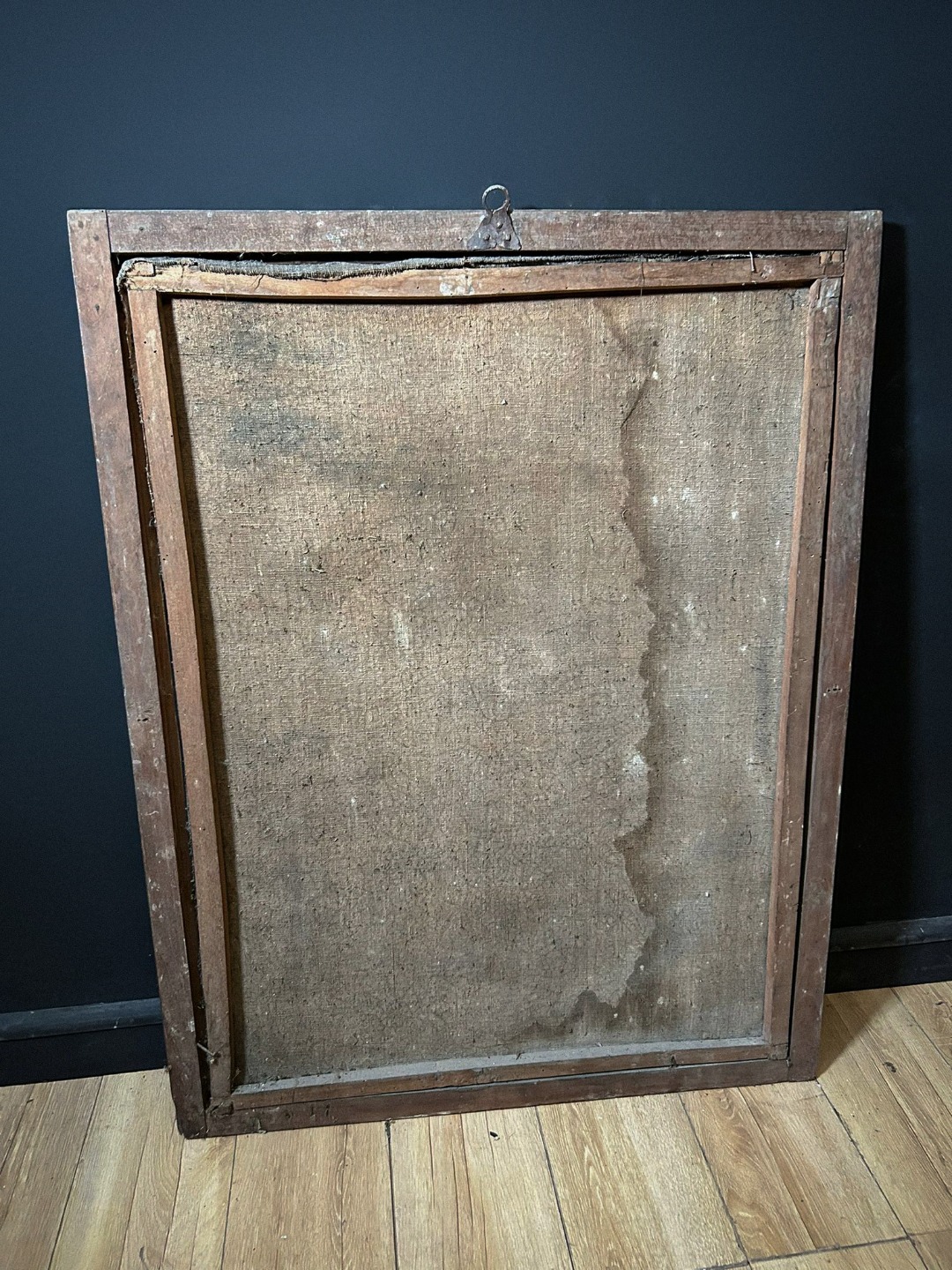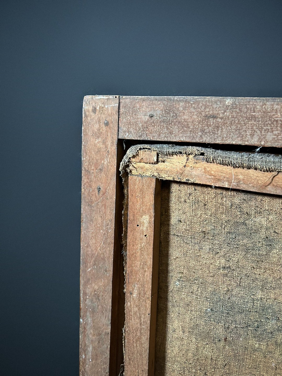 La tela presenta un’invecchiamento coerente con l’epoca, con craquelure diffuse, leggere usure superficiali e segni di deposito del tempo. Il telaio posteriore, originale e inchiodato, mostra le tipiche caratteristiche costruttive antiche. La cornice, coeva o di prima epoca, è in legno dorato con segni di usura che ne confermano l’autenticità storica.