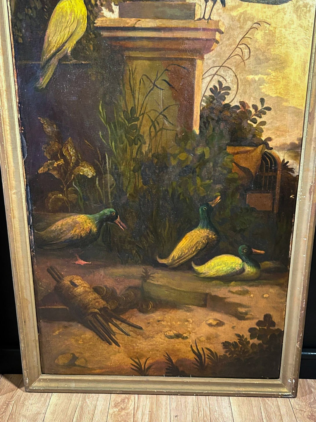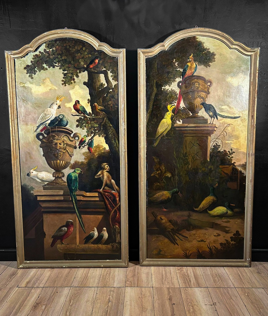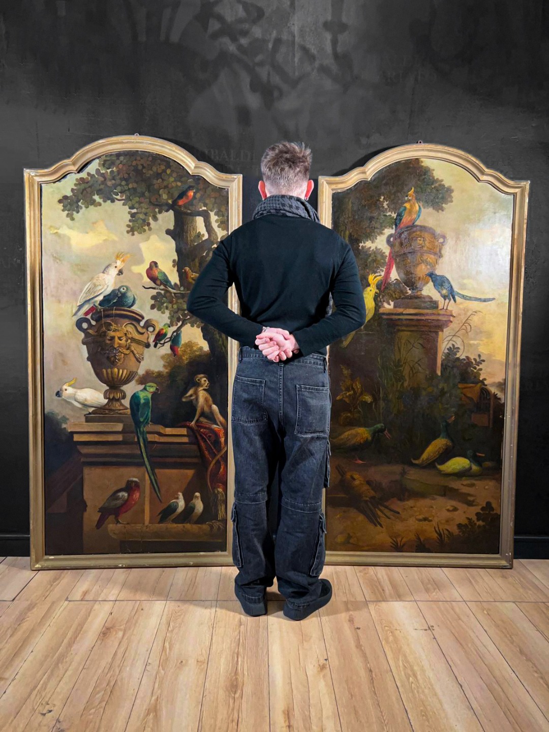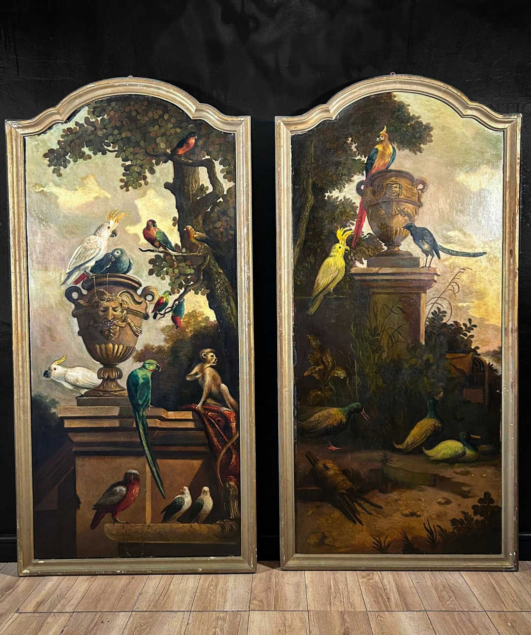 Straordinaria coppia di dipinti francesi a olio su tela, databili tra la fine del XVIII e i primi decenni del XIX secolo, chiaramente ispirati allo stile del celebre pittore olandese Melchior de Hondecoeter, maestro delle raffigurazioni avicole e delle composizioni naturalistiche animate da volatili esotici.