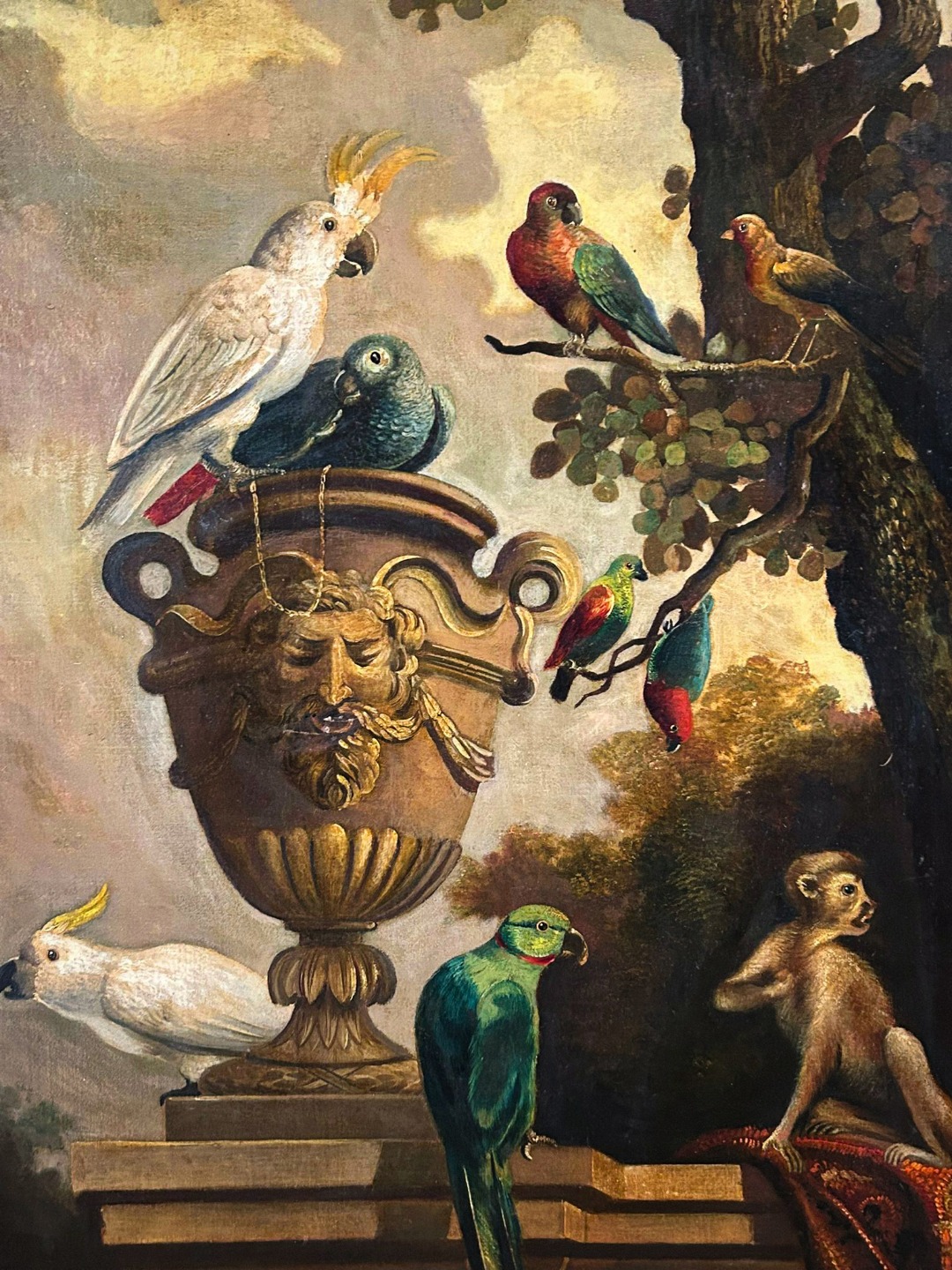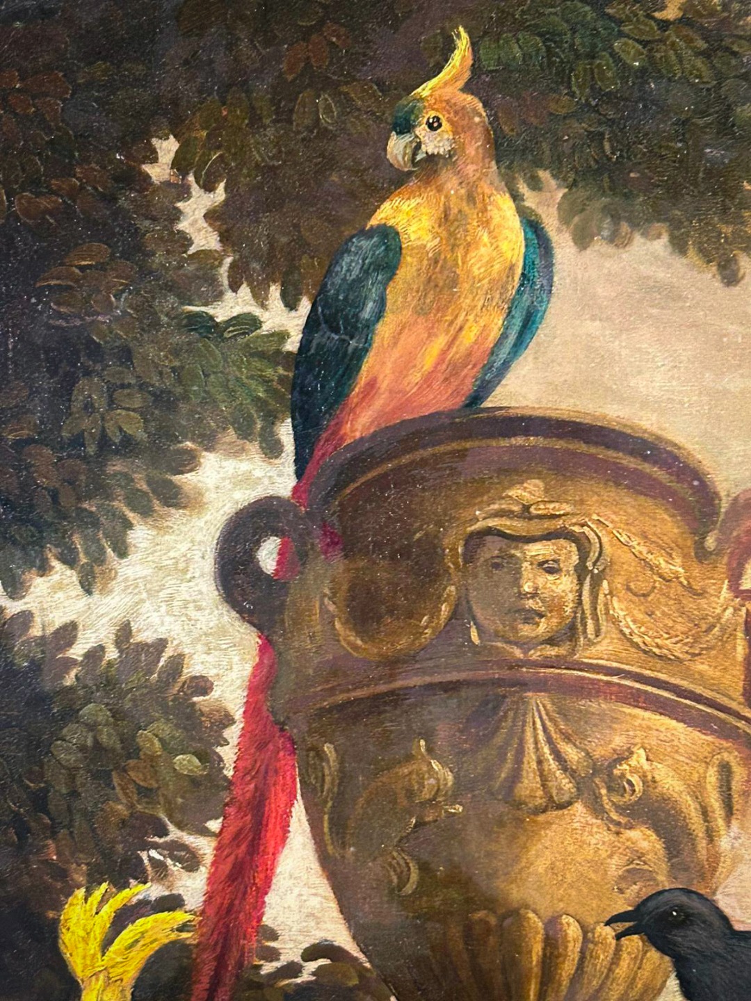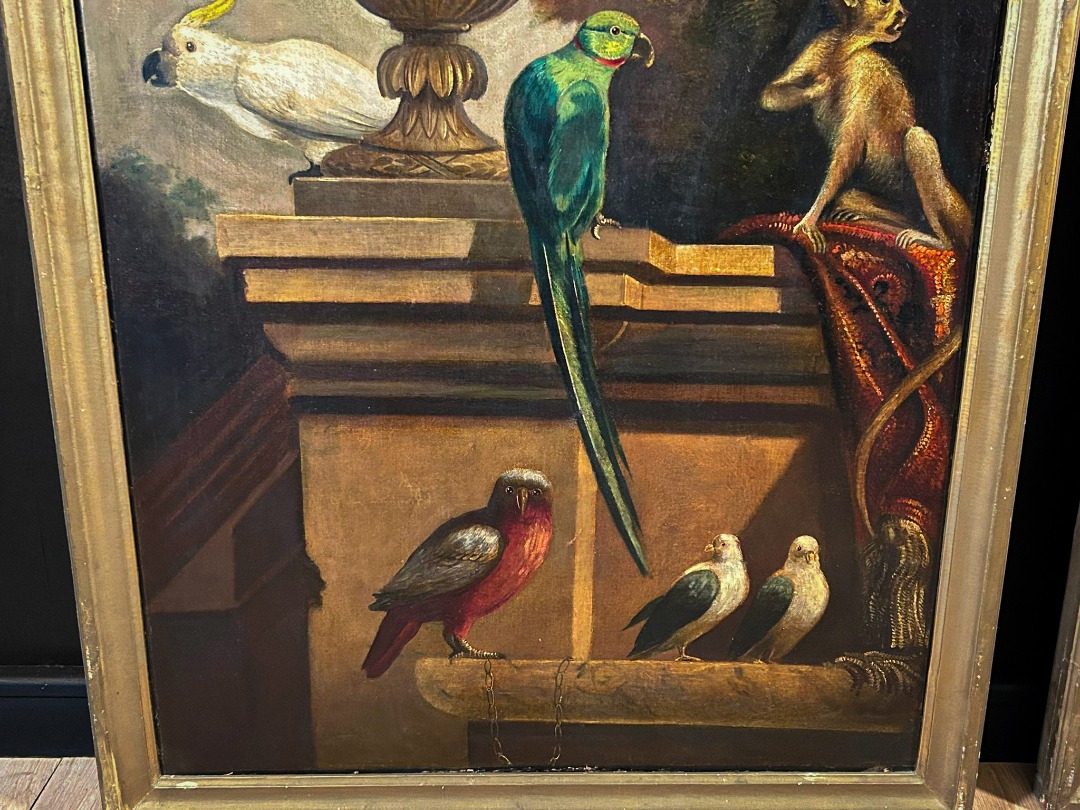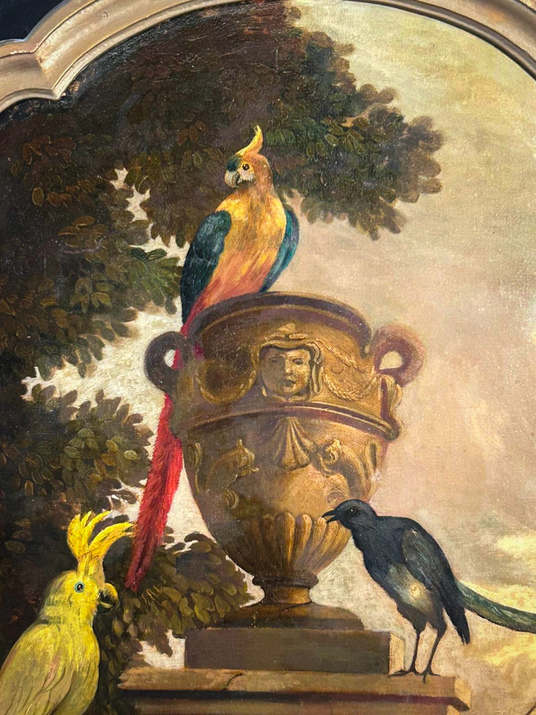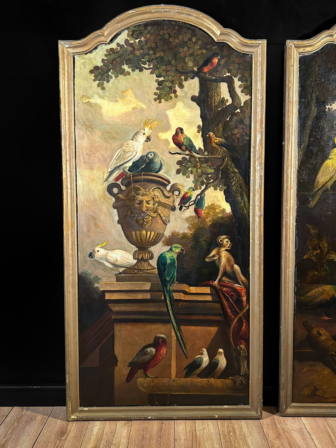 Straordinaria coppia di dipinti francesi a olio su tela, databili tra la fine del XVIII e i primi decenni del XIX secolo, chiaramente ispirati allo stile del celebre pittore olandese Melchior de Hondecoeter, maestro delle raffigurazioni avicole e delle composizioni naturalistiche animate da volatili esotici.