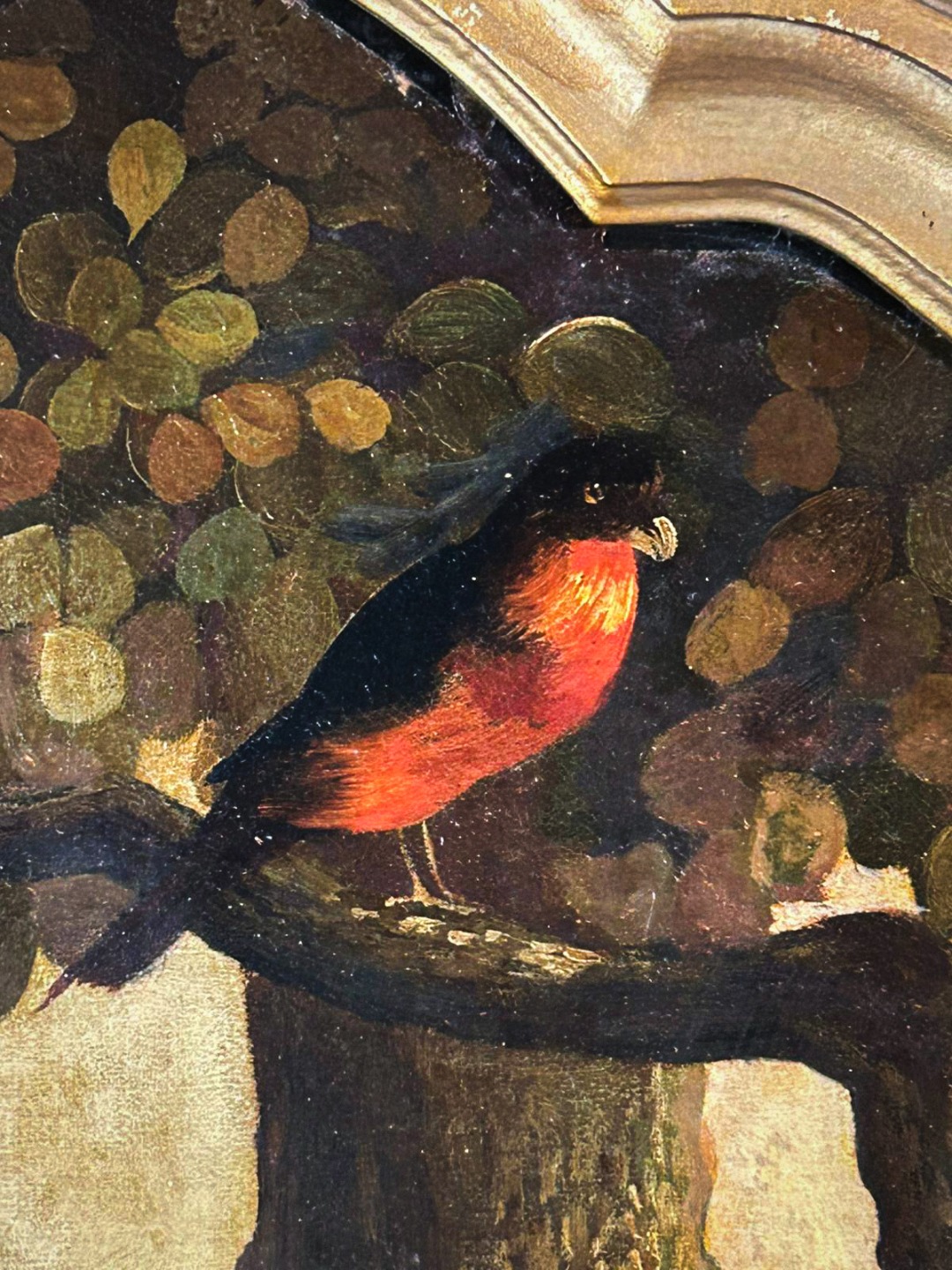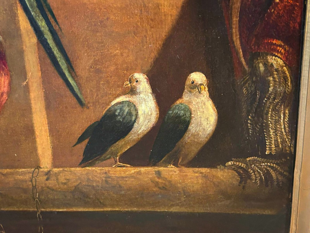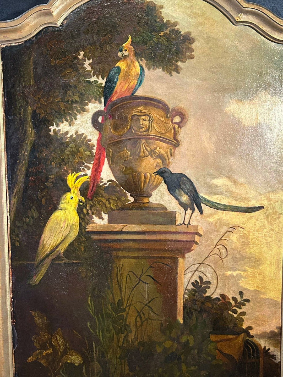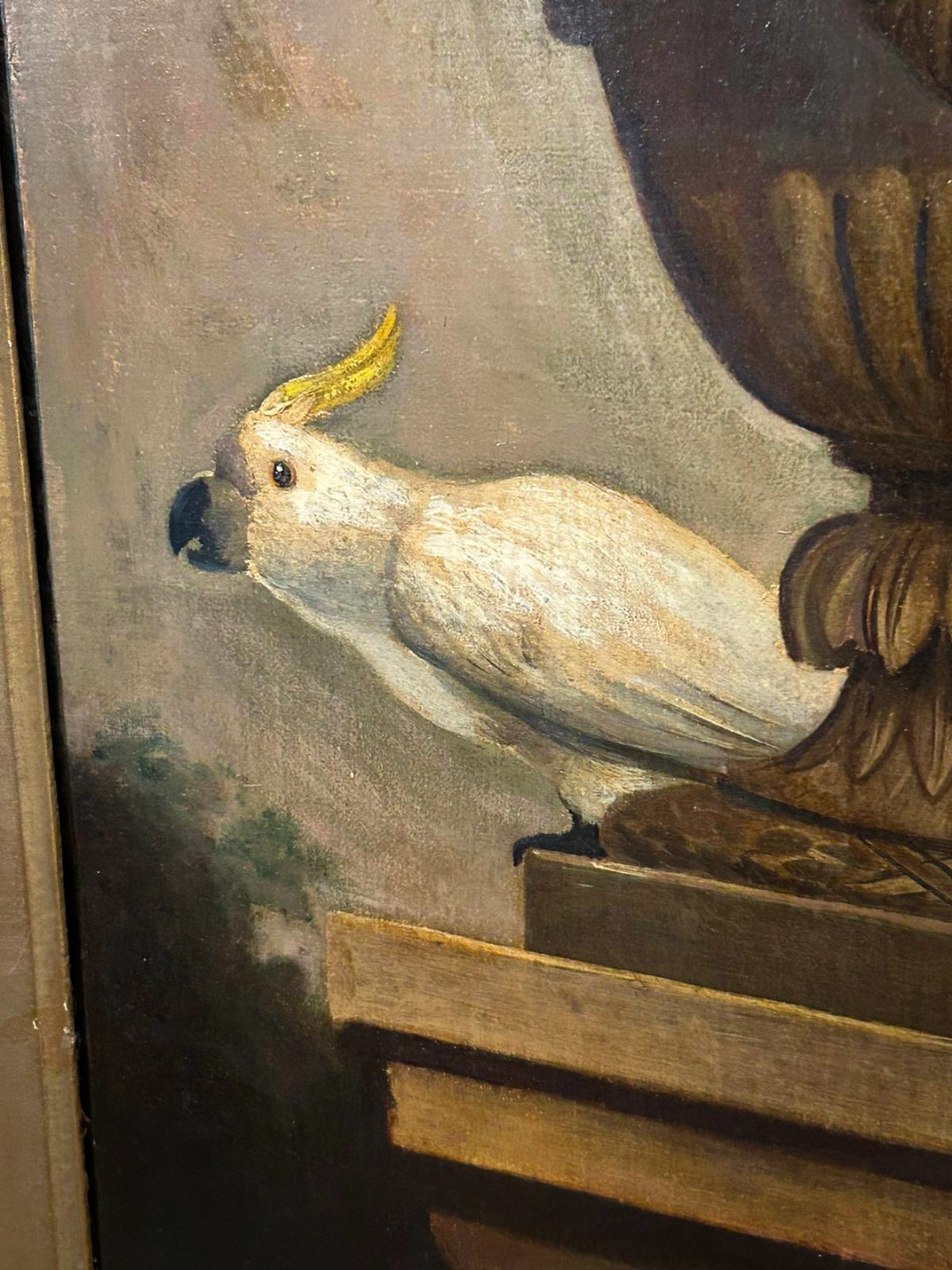 Straordinaria coppia di dipinti francesi a olio su tela, databili tra la fine del XVIII e i primi decenni del XIX secolo, chiaramente ispirati allo stile del celebre pittore olandese Melchior de Hondecoeter, maestro delle raffigurazioni avicole e delle composizioni naturalistiche animate da volatili esotici.