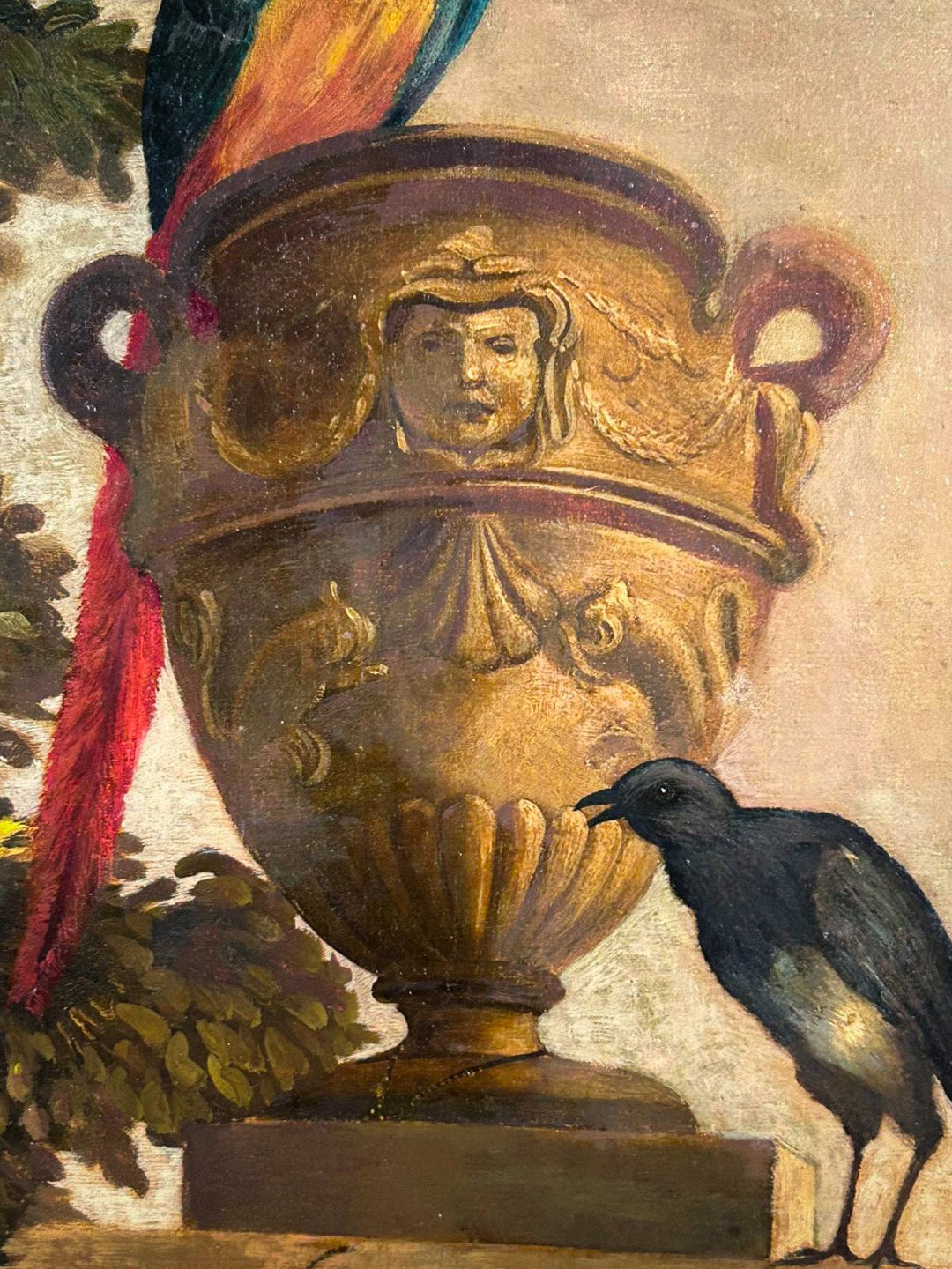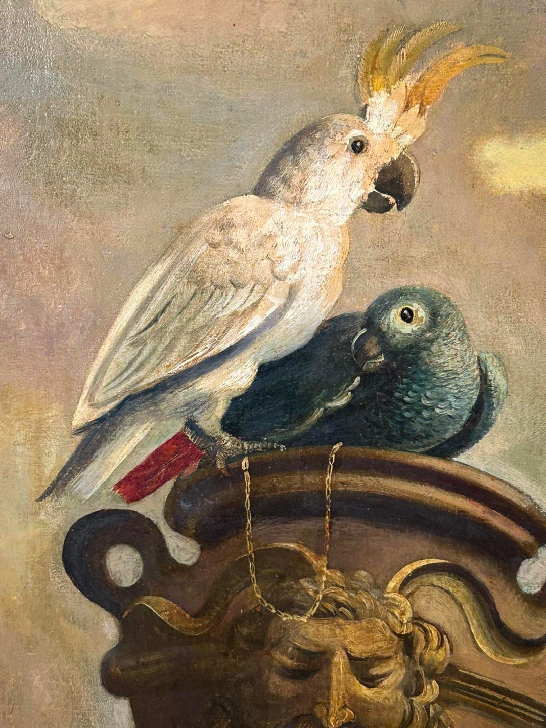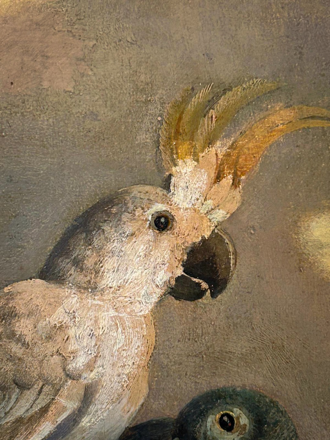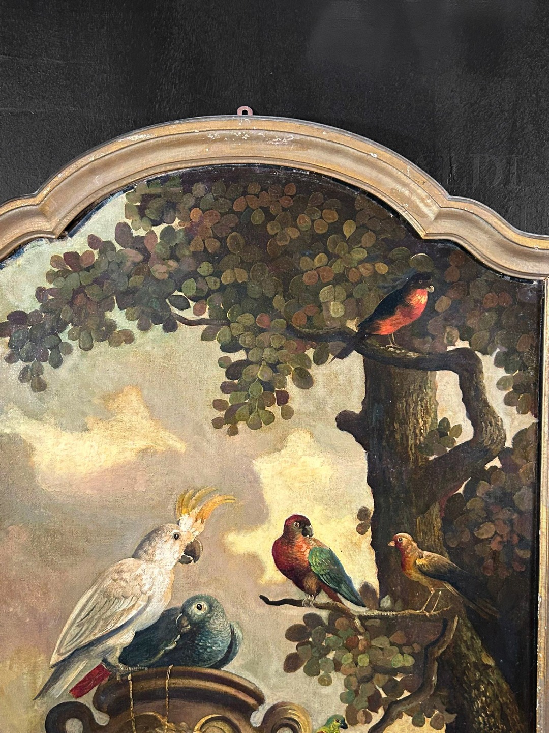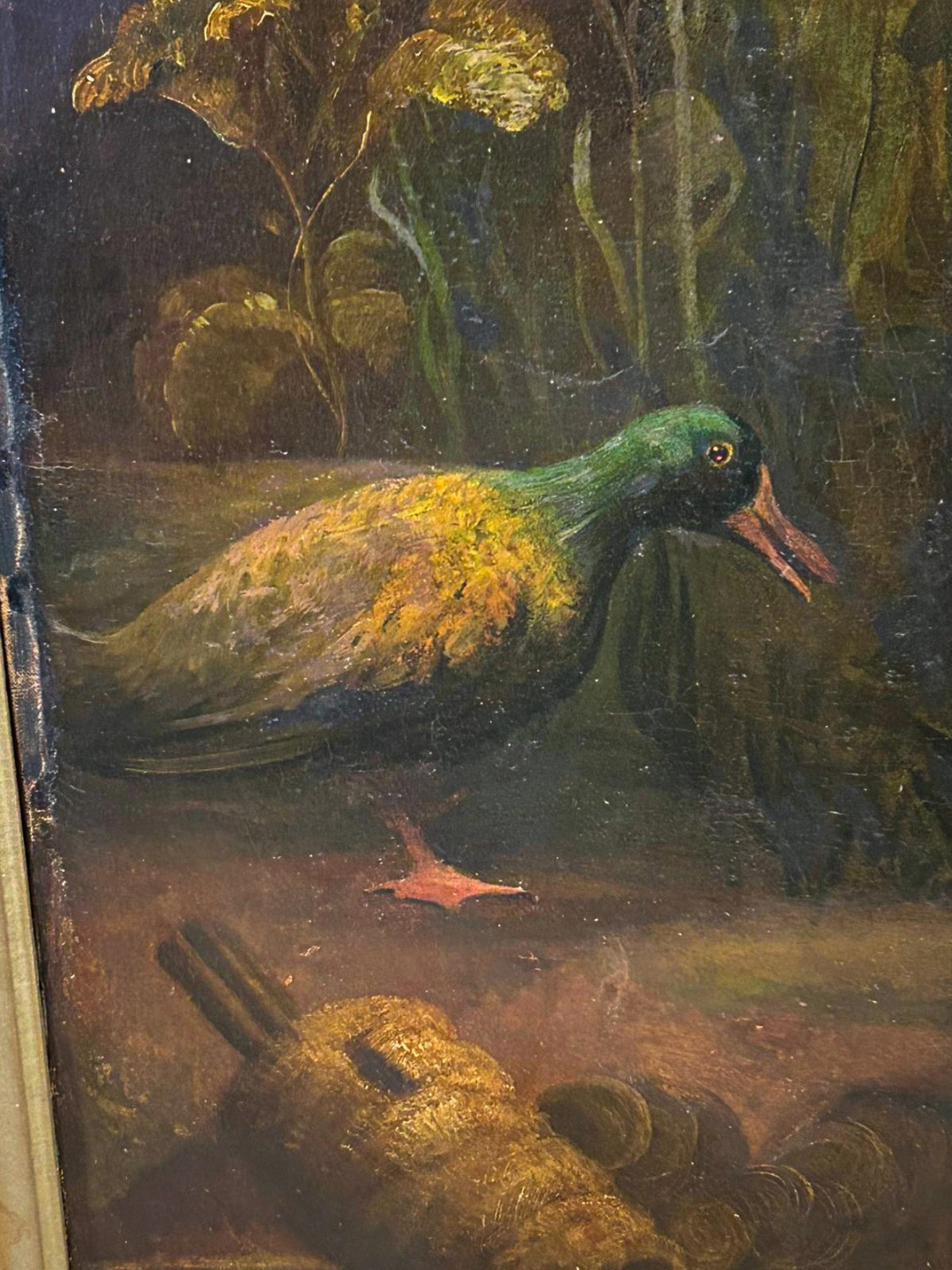 Straordinaria coppia di dipinti francesi a olio su tela, databili tra la fine del XVIII e i primi decenni del XIX secolo, chiaramente ispirati allo stile del celebre pittore olandese Melchior de Hondecoeter, maestro delle raffigurazioni avicole e delle composizioni naturalistiche animate da volatili esotici.