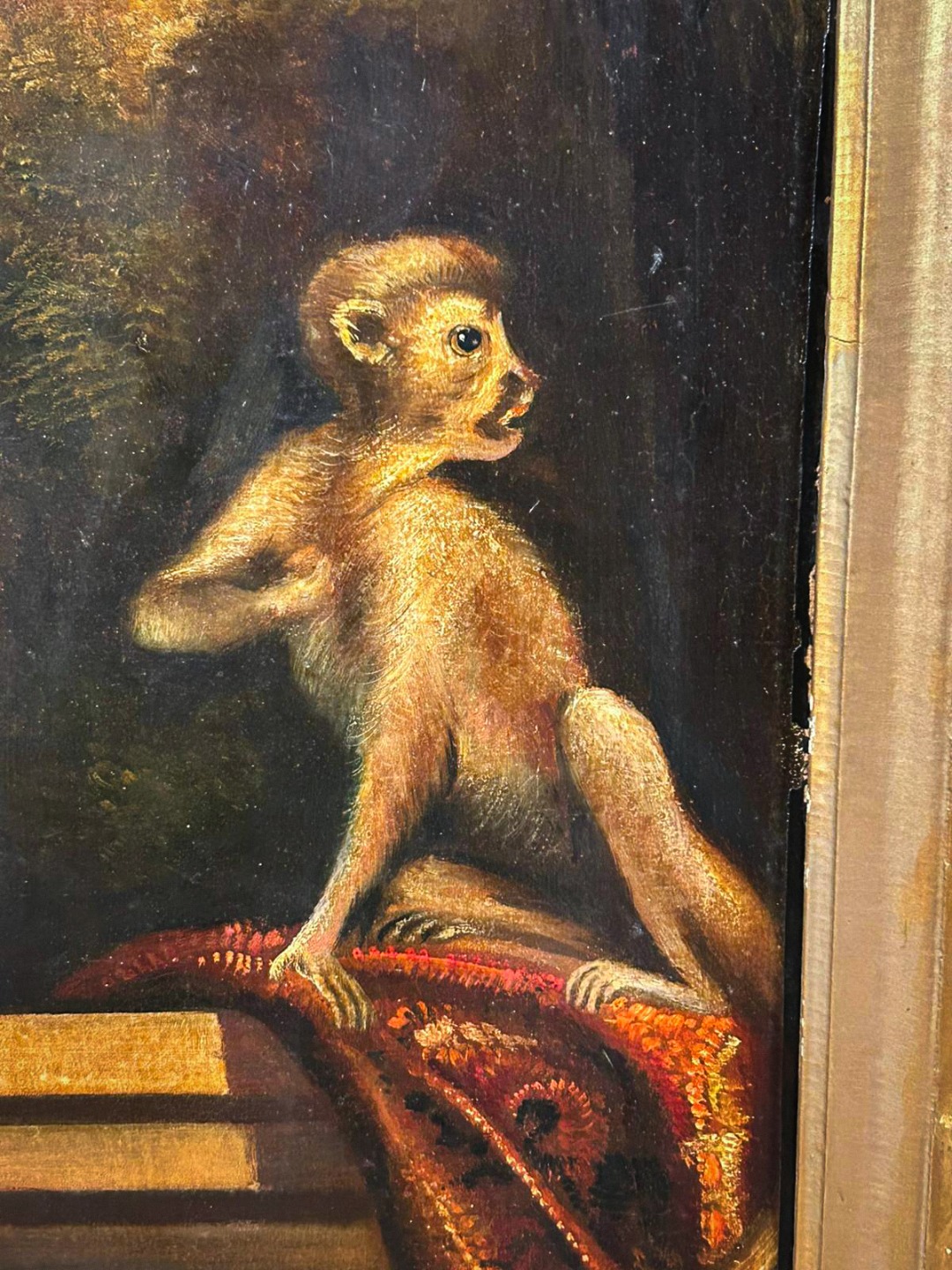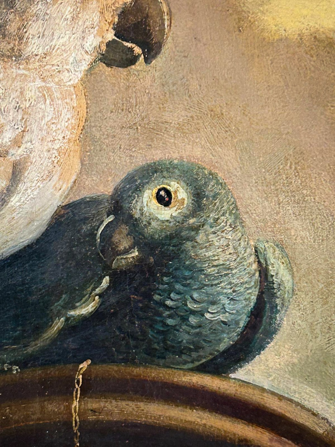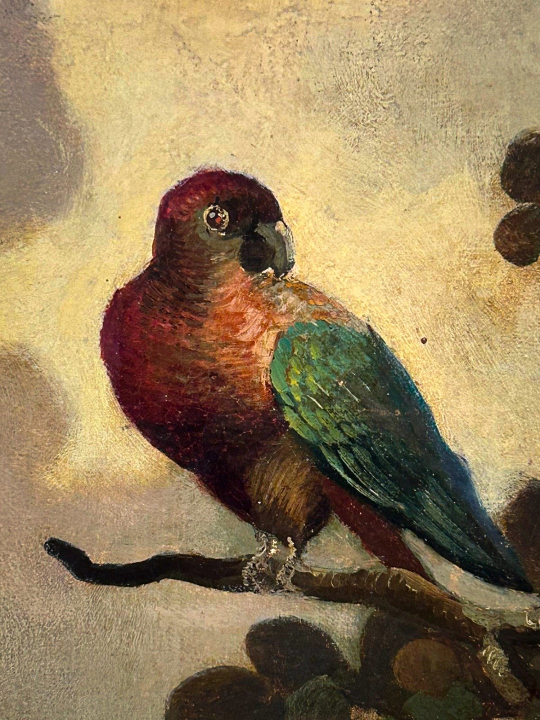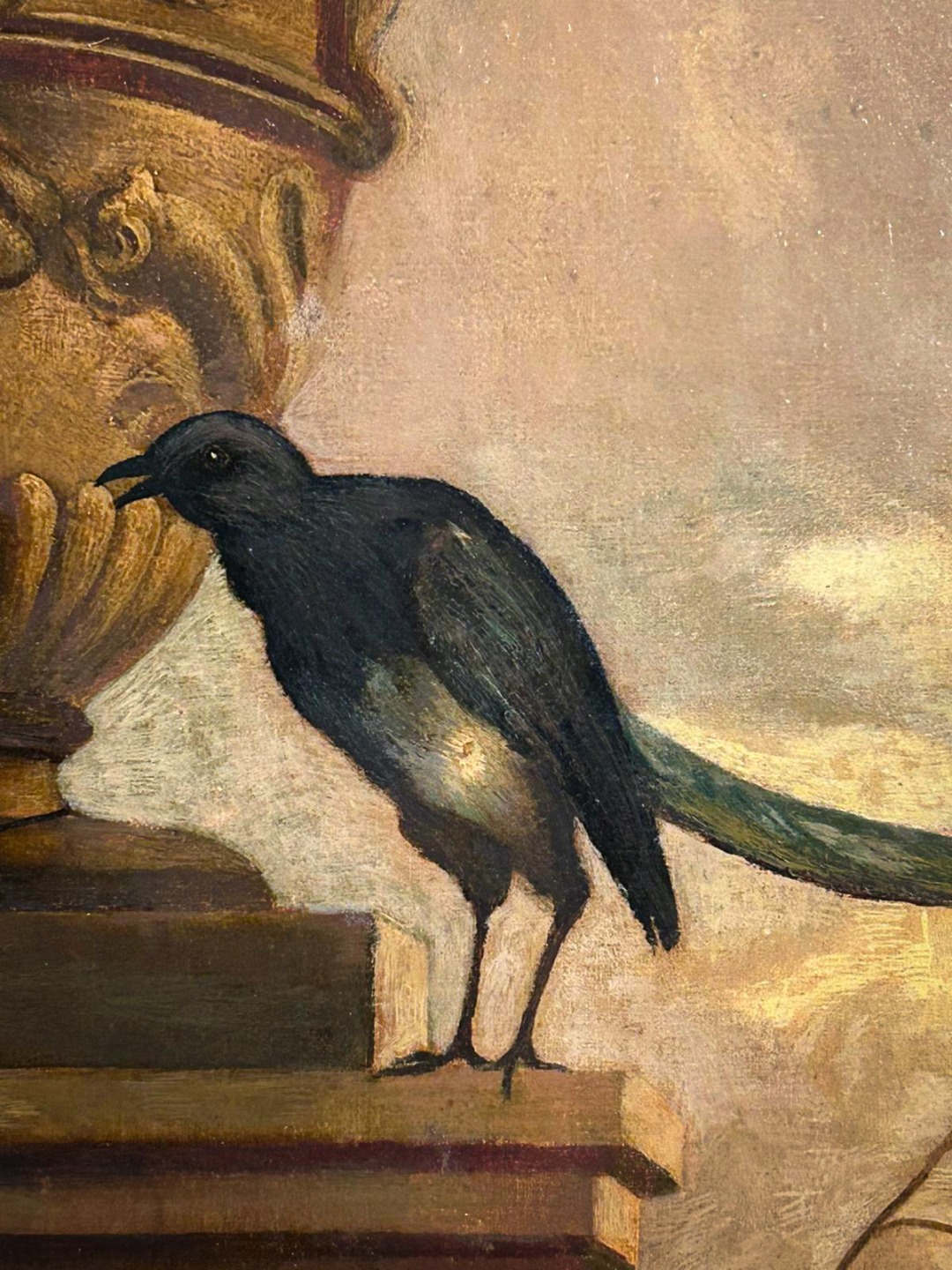 Straordinaria coppia di dipinti francesi a olio su tela, databili tra la fine del XVIII e i primi decenni del XIX secolo, chiaramente ispirati allo stile del celebre pittore olandese Melchior de Hondecoeter, maestro delle raffigurazioni avicole e delle composizioni naturalistiche animate da volatili esotici.