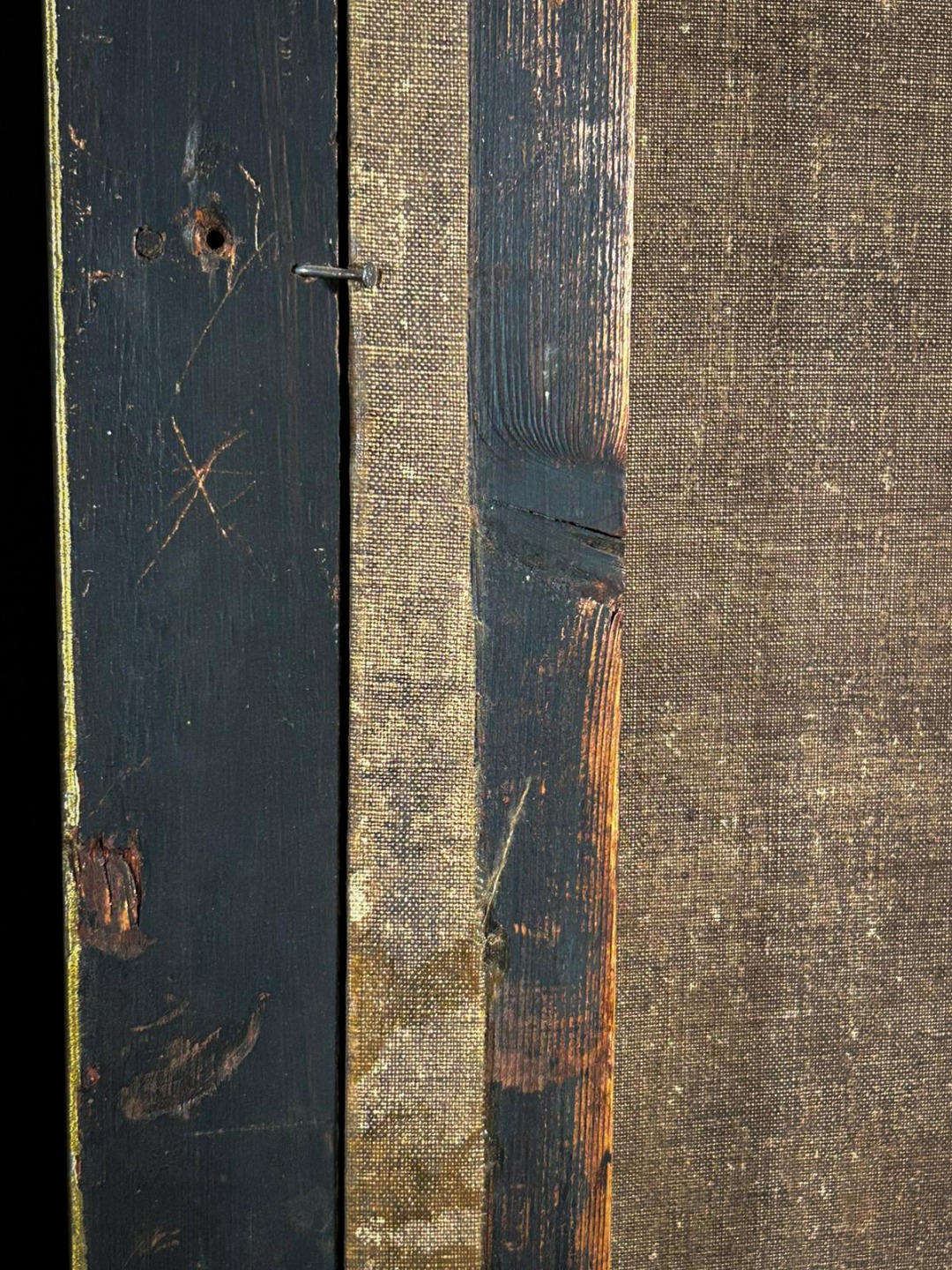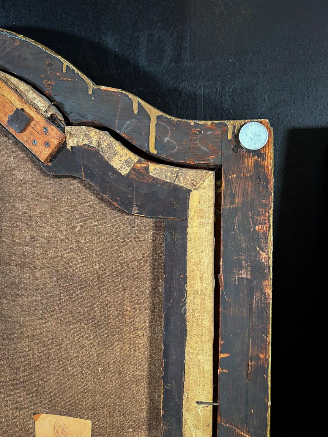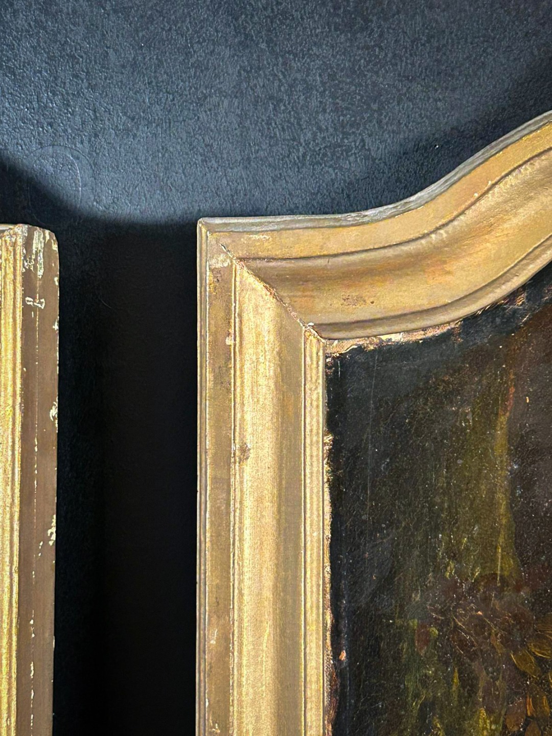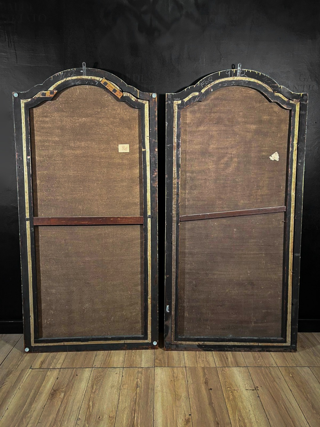 Entrambe le tele sono montate in eleganti cornici sagomate dell’epoca, che seguono l’andamento mistilineo superiore e valorizzano l’importante verticalità dei pannelli. Una coppia decorativa di grande presenza, ideale per ambienti prestigiosi.