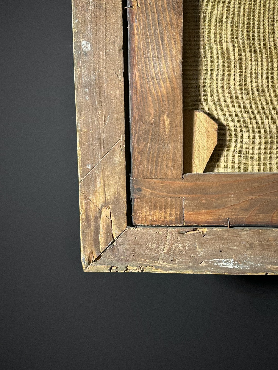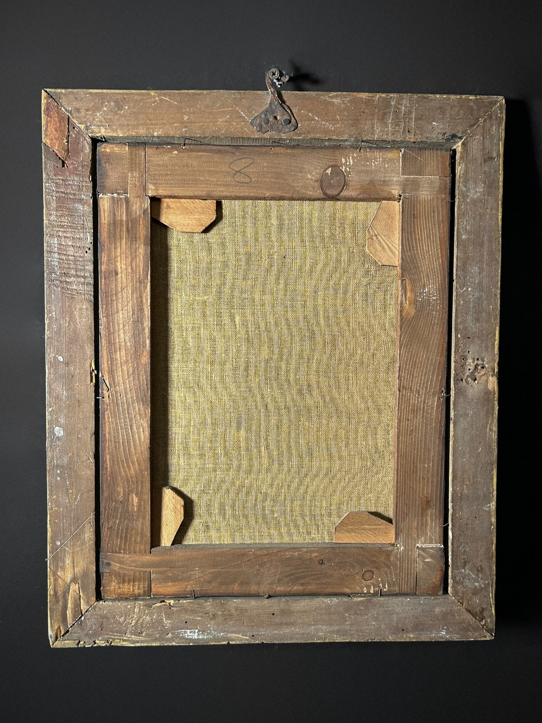 Il quadro è contenuto entro una cornice antica dorata, anch’essa coeva al dipinto, con piacevole patina del tempo.