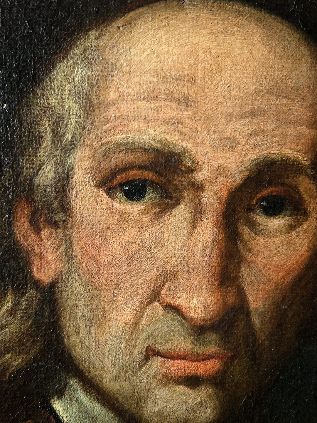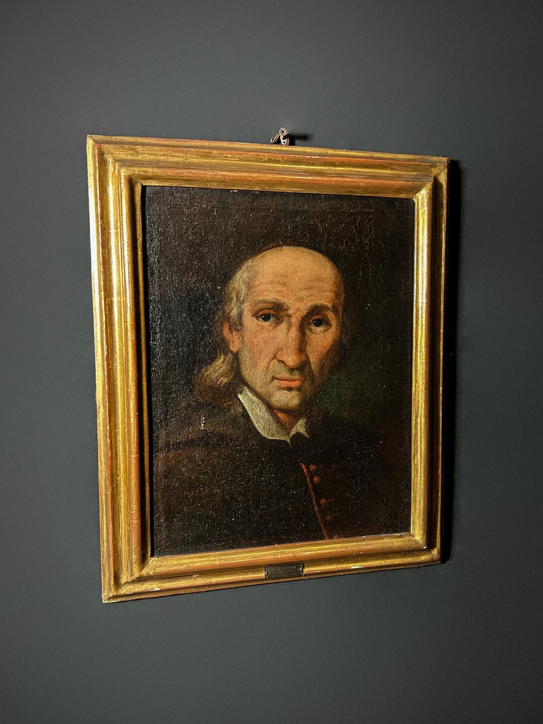 La figura, colta a mezzo busto, presenta un volto dagli sguardi intensi e profondi, reso con toni caldi e modellazione accurata. L’abbigliamento ecclesiastico è definito nei dettagli, con particolare attenzione alla veste scura ornata da bottoni rossi e al colletto bianco. La superficie pittorica mostra una craquelure omogenea su tutta la tela, coerente con l’età del manufatto.