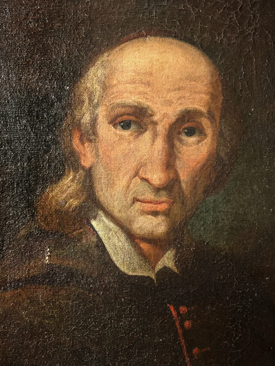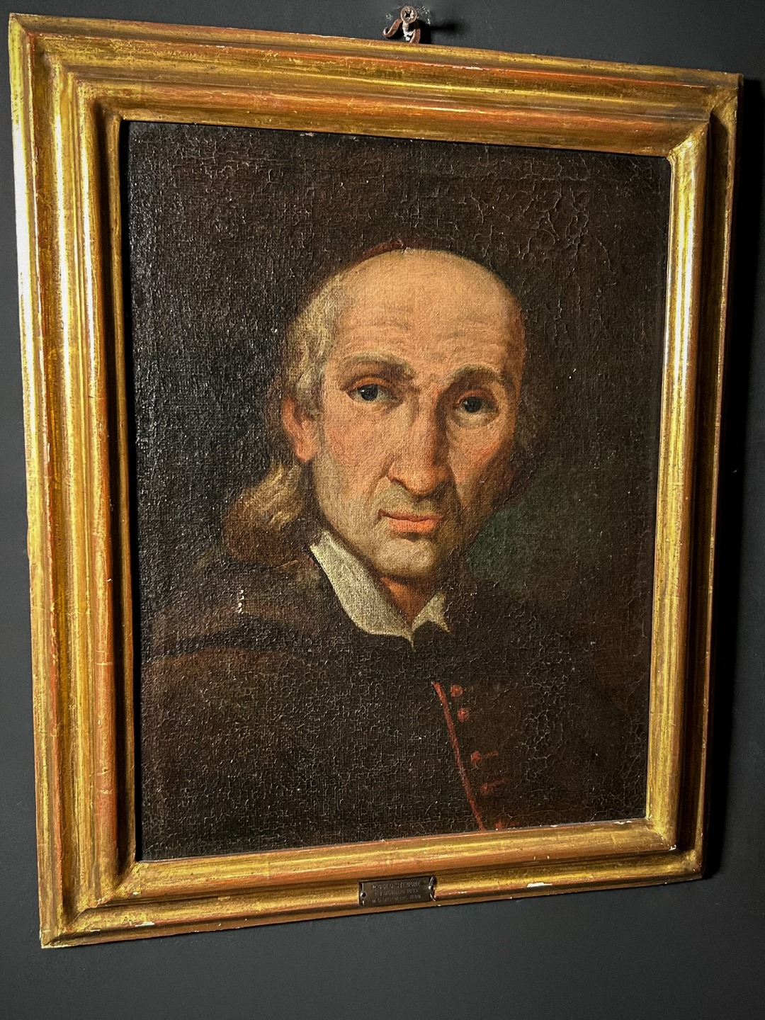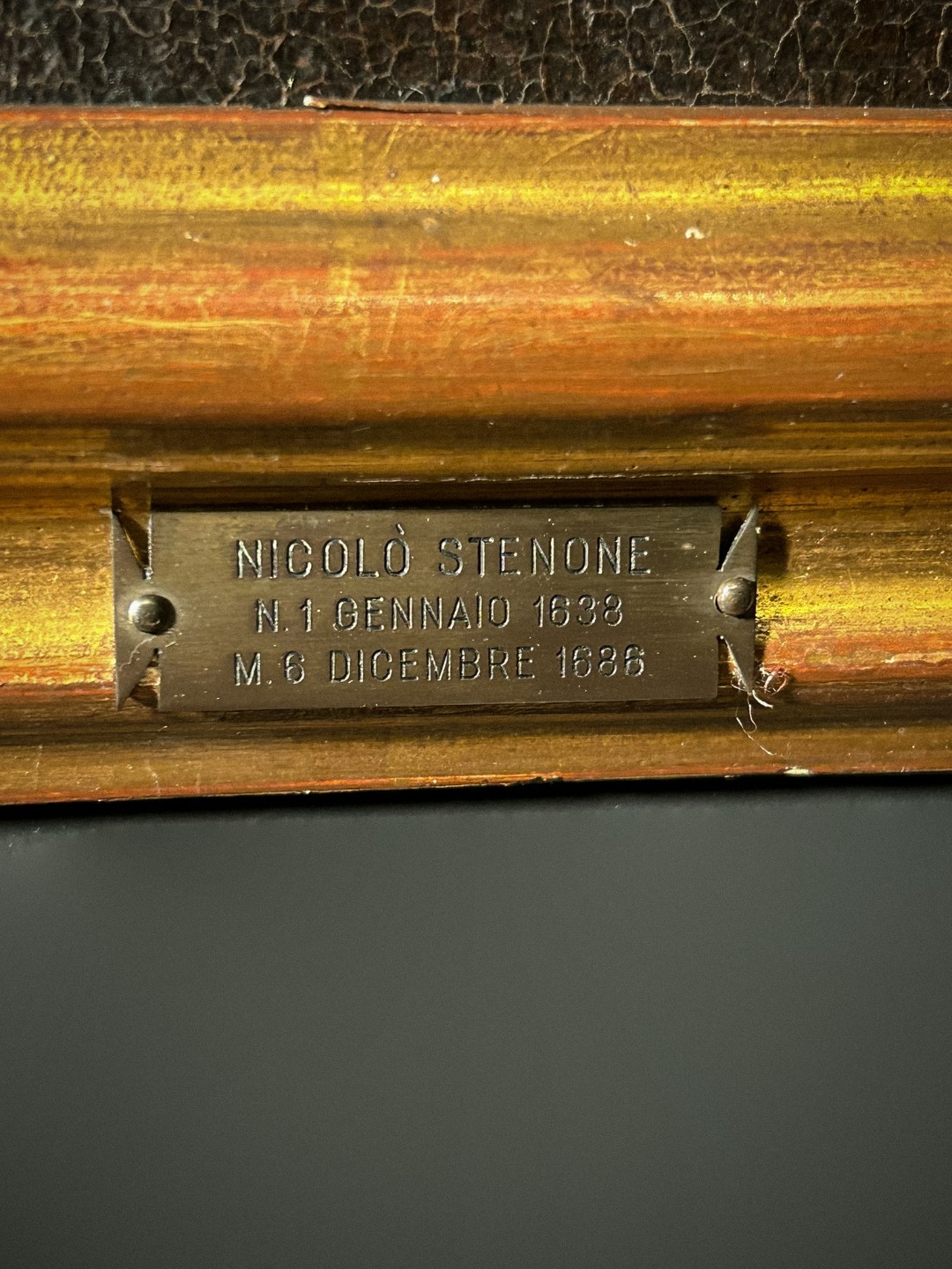 Elegante dipinto ad olio su tela raffigurante un ecclesiastico, con iscrizione identificativa “Nicolò Stenone – N. 1 Gennaio 1638 / M. 6 Dicembre 1686” applicata sulla cornice. Il ritratto, tuttavia, per stile pittorico, cromie e caratteristiche materiche, è riconducibile alla seconda metà del XIX secolo, e non al XVII secolo, trattandosi quindi di un’opera realizzata in omaggio o riproduzione storica del personaggio.