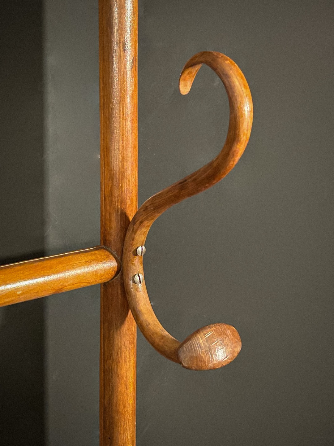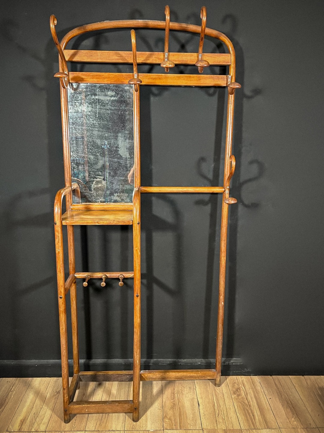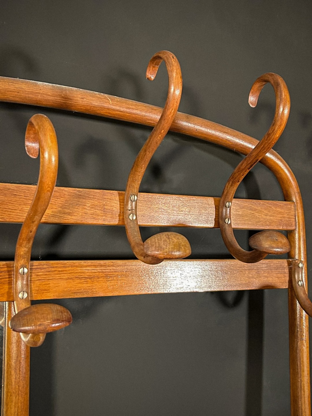 Elegante appendiabiti d’epoca in legno curvato, completo di specchio originale e ganci in stile Liberty. Linee armoniose e design funzionale, ideale per ingressi o ambienti arredati con gusto vintage o classico.