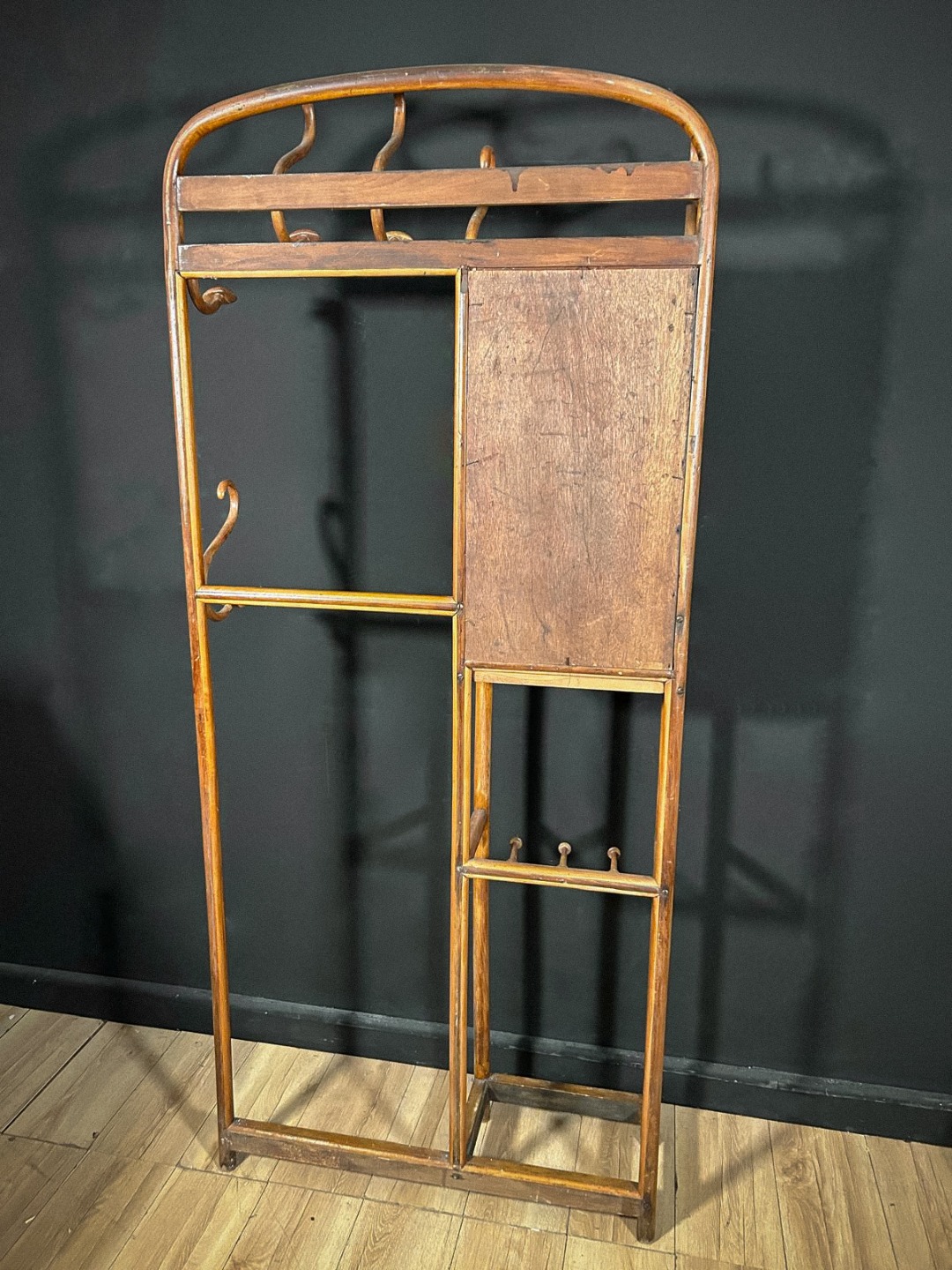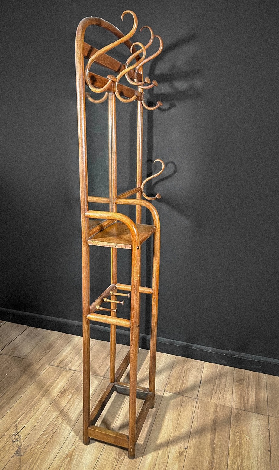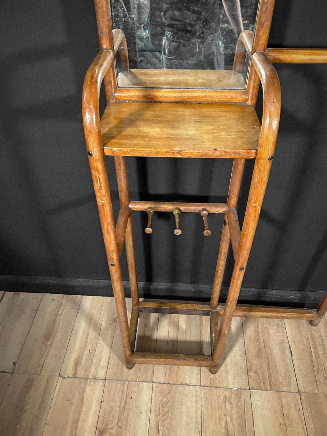Elegante appendiabiti d’epoca in legno curvato, completo di specchio originale e ganci in stile Liberty. Linee armoniose e design funzionale, ideale per ingressi o ambienti arredati con gusto vintage o classico.