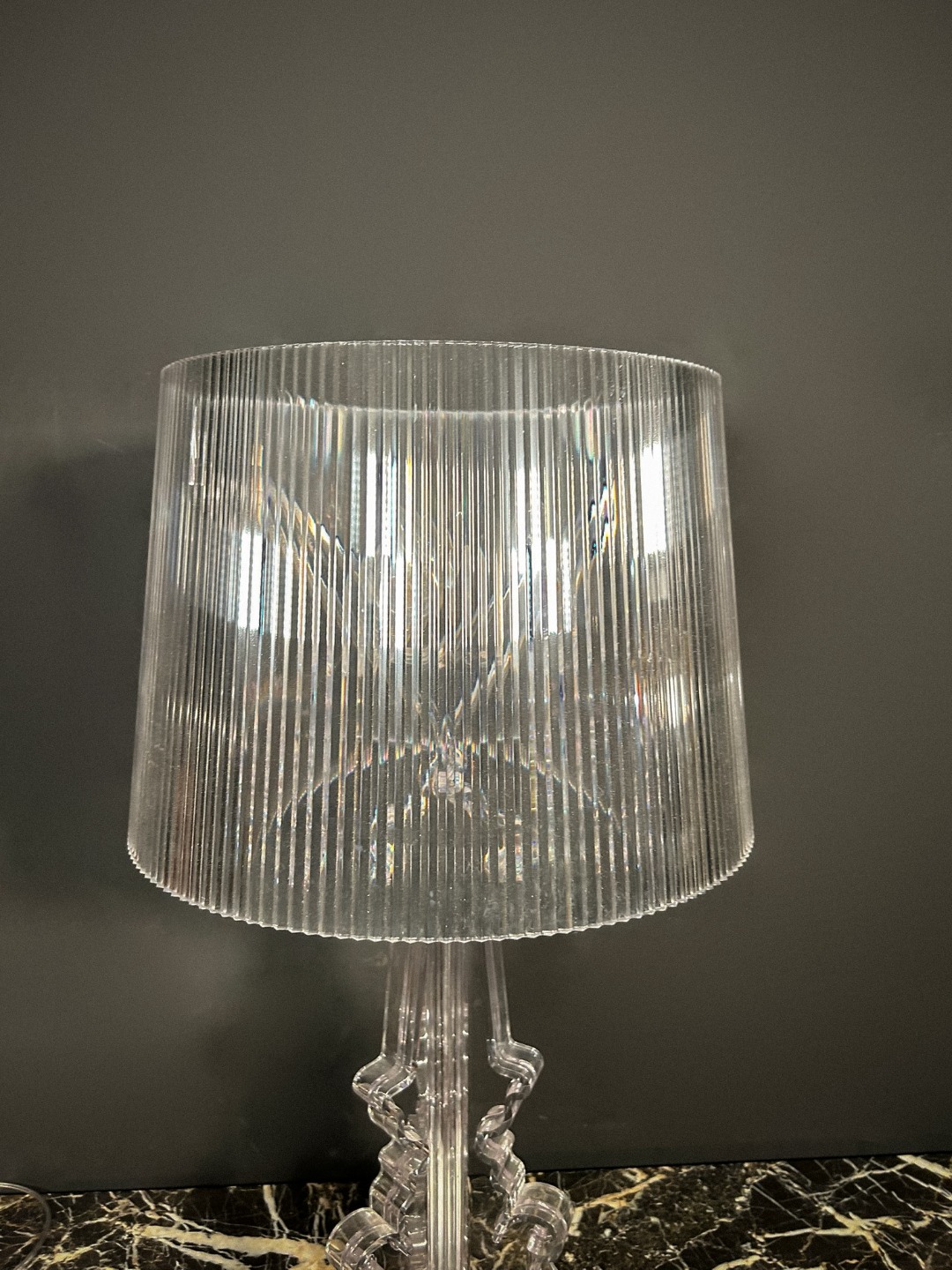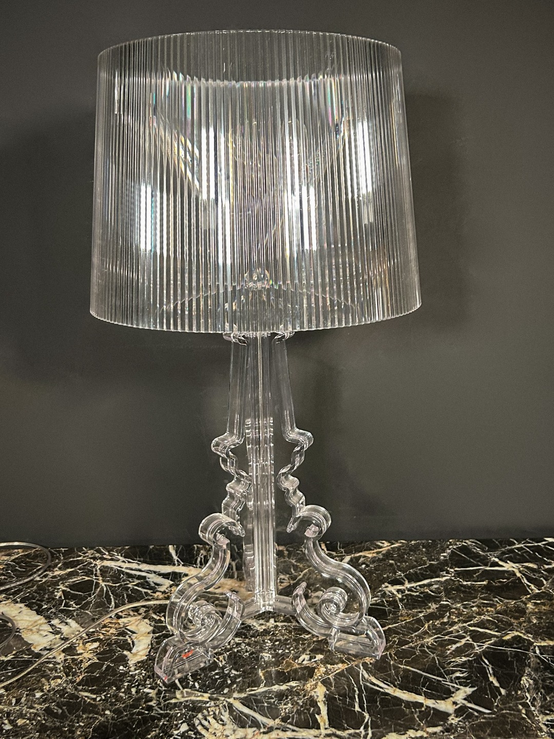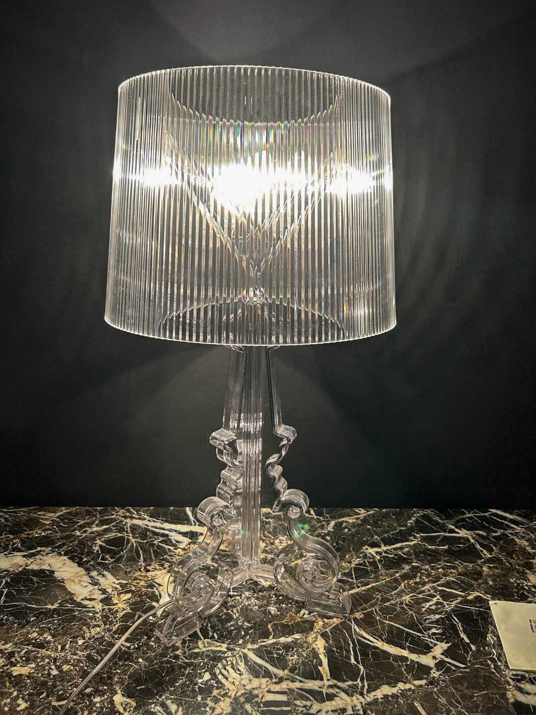Iconica lampada da tavolo modello Bourgie, prodotta da Kartell e firmata dal designer Ferruccio Laviani. Realizzata in policarbonato trasparente, presenta un’elegante struttura barocca reinterpretata in chiave moderna, con base a tre elementi curvilinei sovrapposti e paralume plissettato che permette raffinati giochi di luce e riflessi.