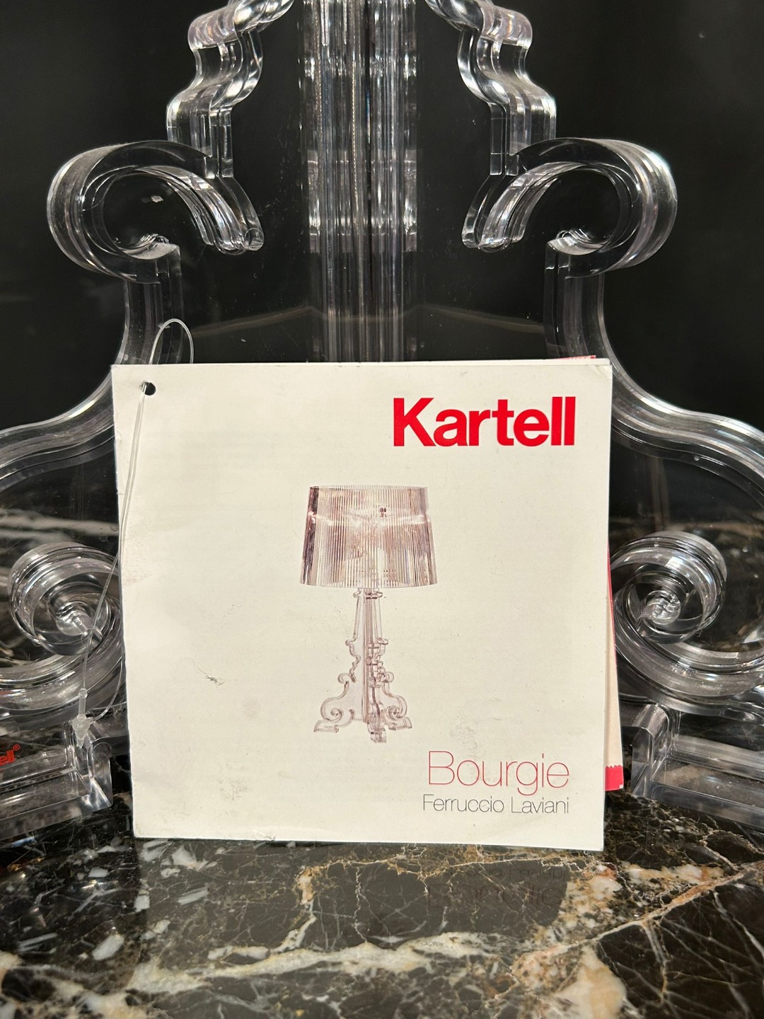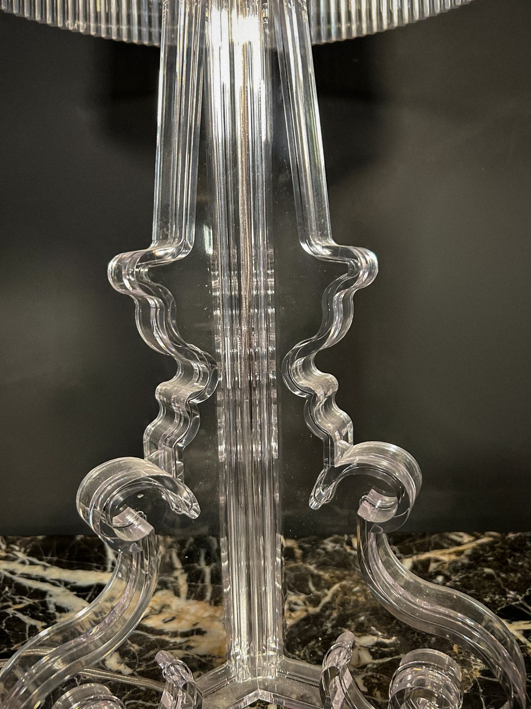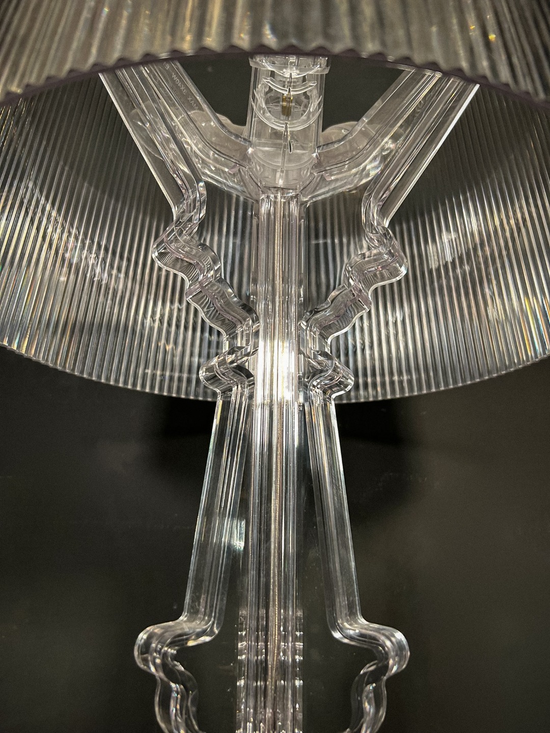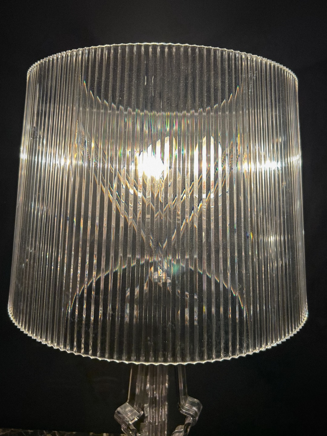 Iconica lampada da tavolo modello Bourgie, prodotta da Kartell e firmata dal designer Ferruccio Laviani. Realizzata in policarbonato trasparente, presenta un’elegante struttura barocca reinterpretata in chiave moderna, con base a tre elementi curvilinei sovrapposti e paralume plissettato che permette raffinati giochi di luce e riflessi.