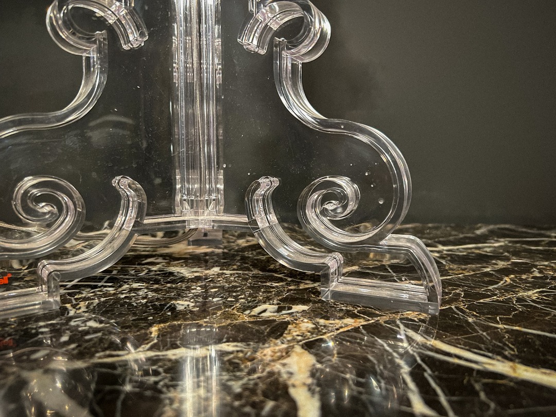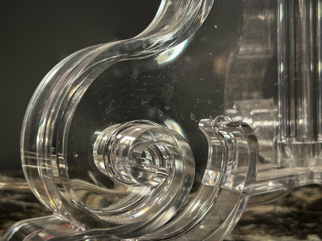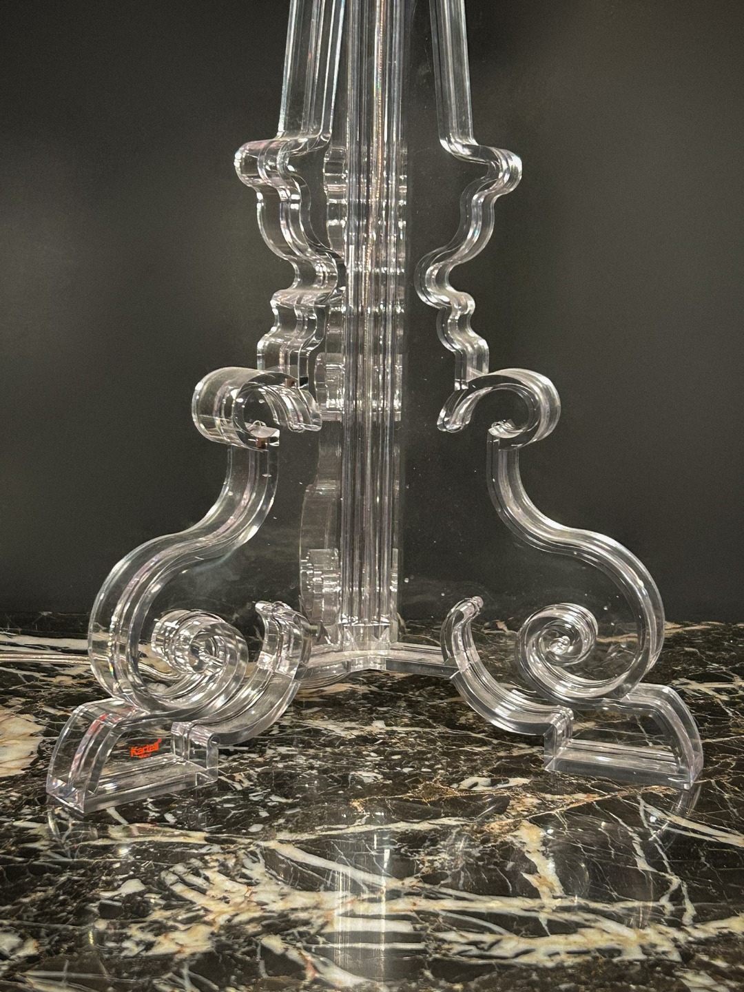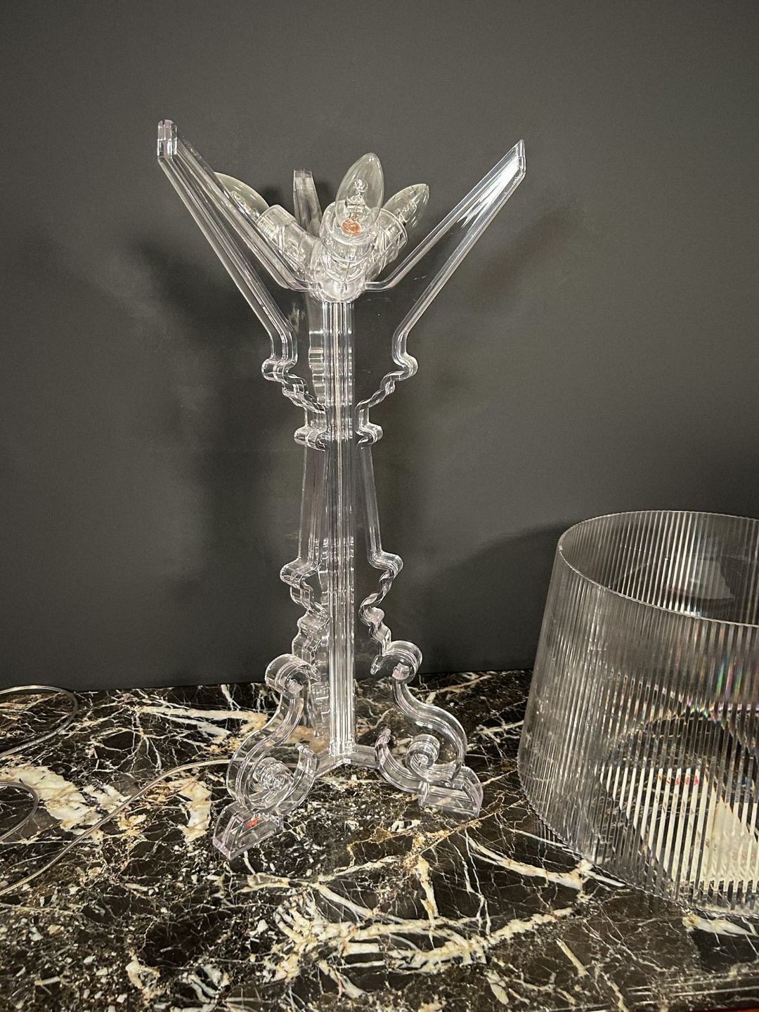 Iconica lampada da tavolo modello Bourgie, prodotta da Kartell e firmata dal designer Ferruccio Laviani. Realizzata in policarbonato trasparente, presenta un’elegante struttura barocca reinterpretata in chiave moderna, con base a tre elementi curvilinei sovrapposti e paralume plissettato che permette raffinati giochi di luce e riflessi.