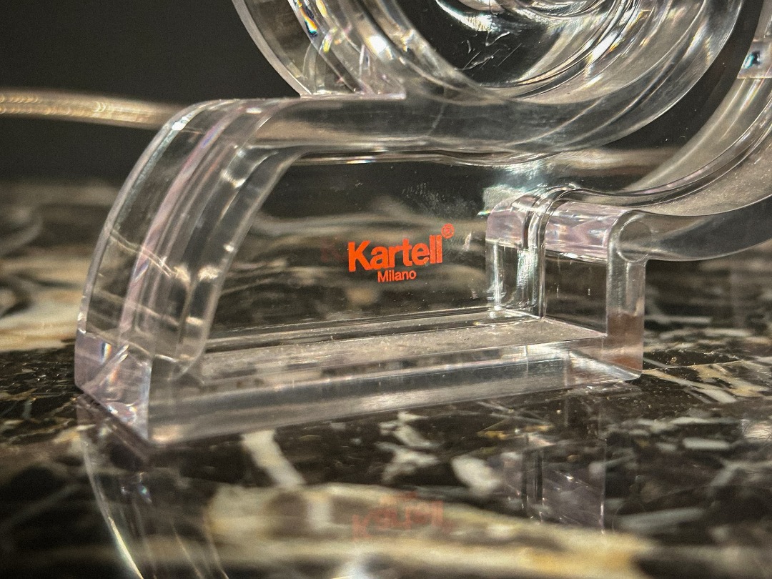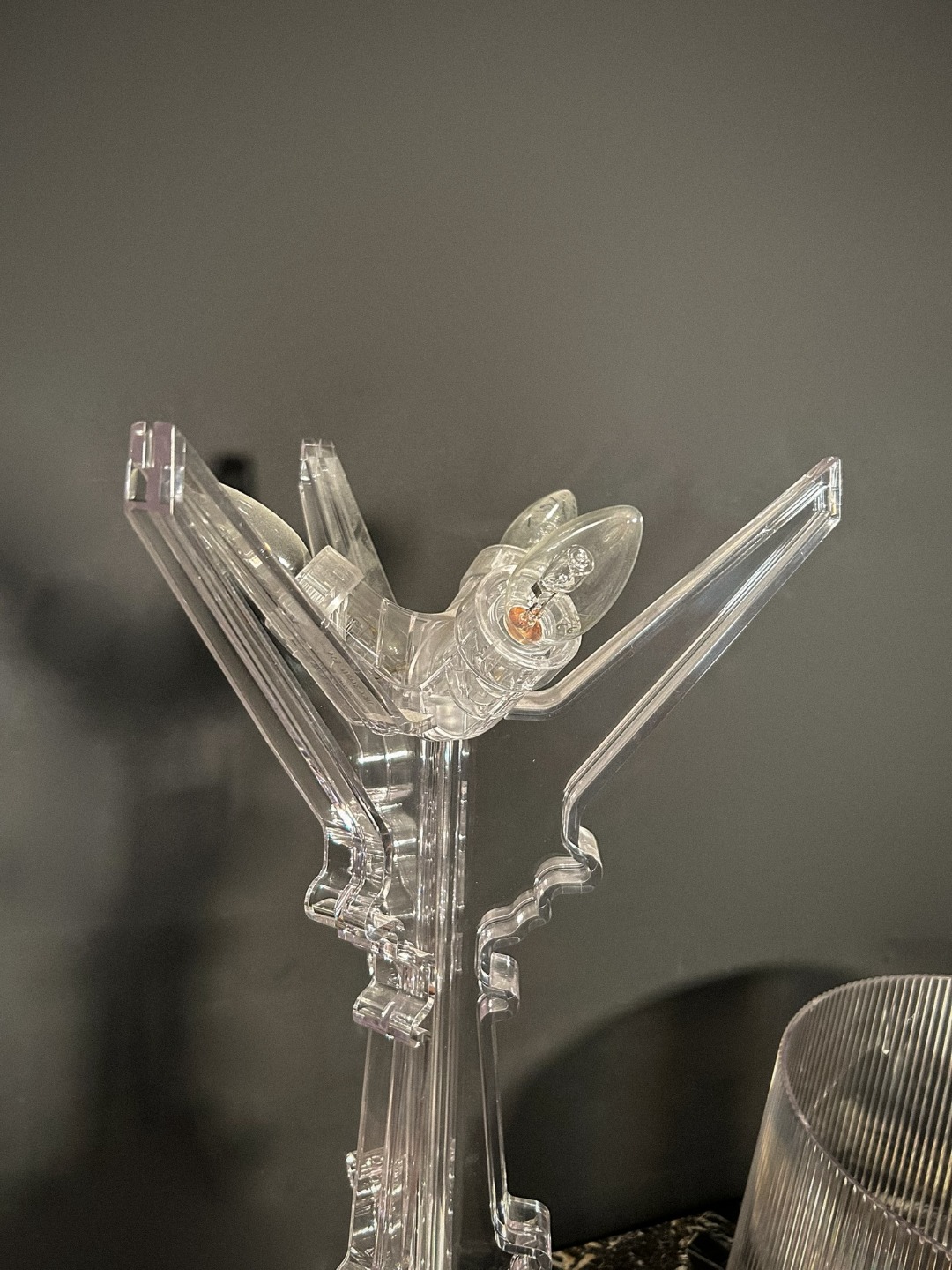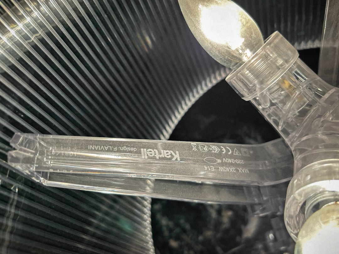 Il design, divenuto un classico del contemporaneo, unisce ricercatezza estetica e funzionalità, risultando perfetto per ambienti moderni, eclettici o classici rivisitati. La lampada monta tre punti luce interni ed è completa di marchio Kartell e librettino originale.