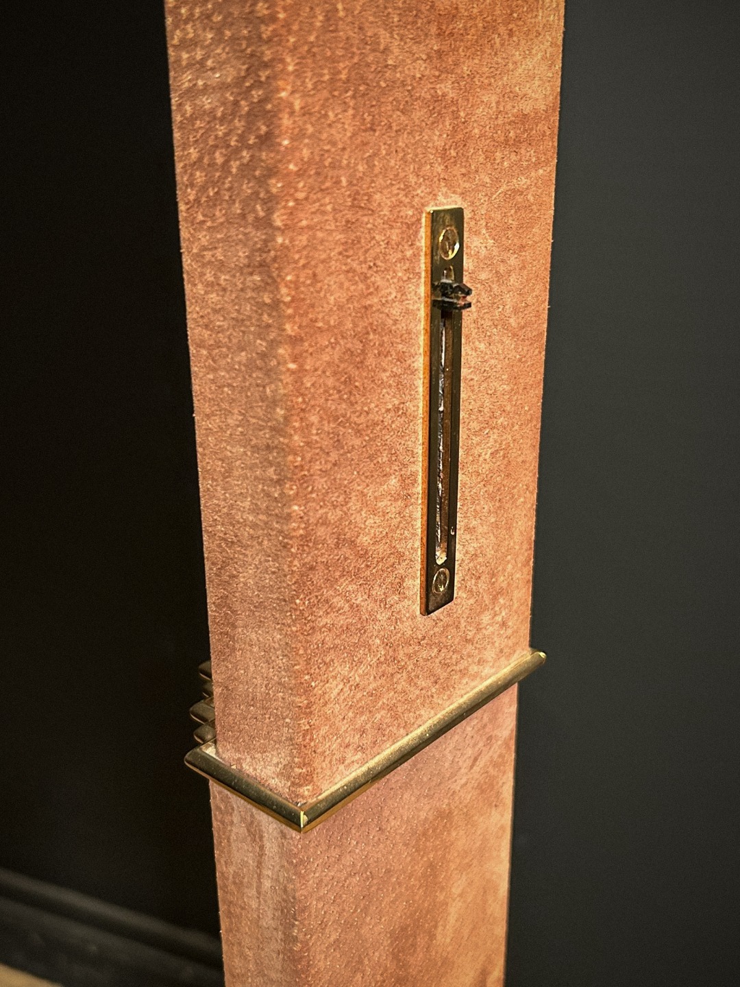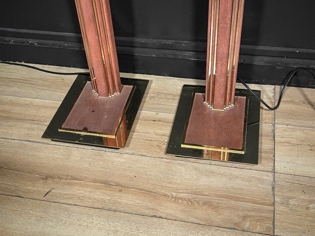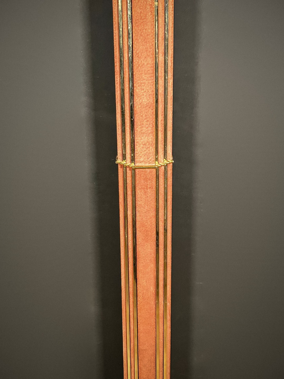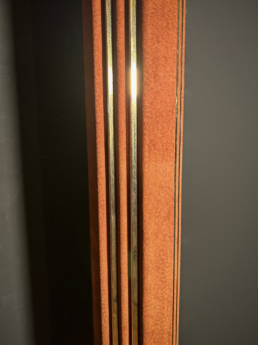 Elegante coppia di lampade da terra dal design vintage, caratterizzate da un raffinato rivestimento in alcantara color terracotta e da inserti e profili in ottone lucido, che conferiscono un aspetto lussuoso e scenografico.