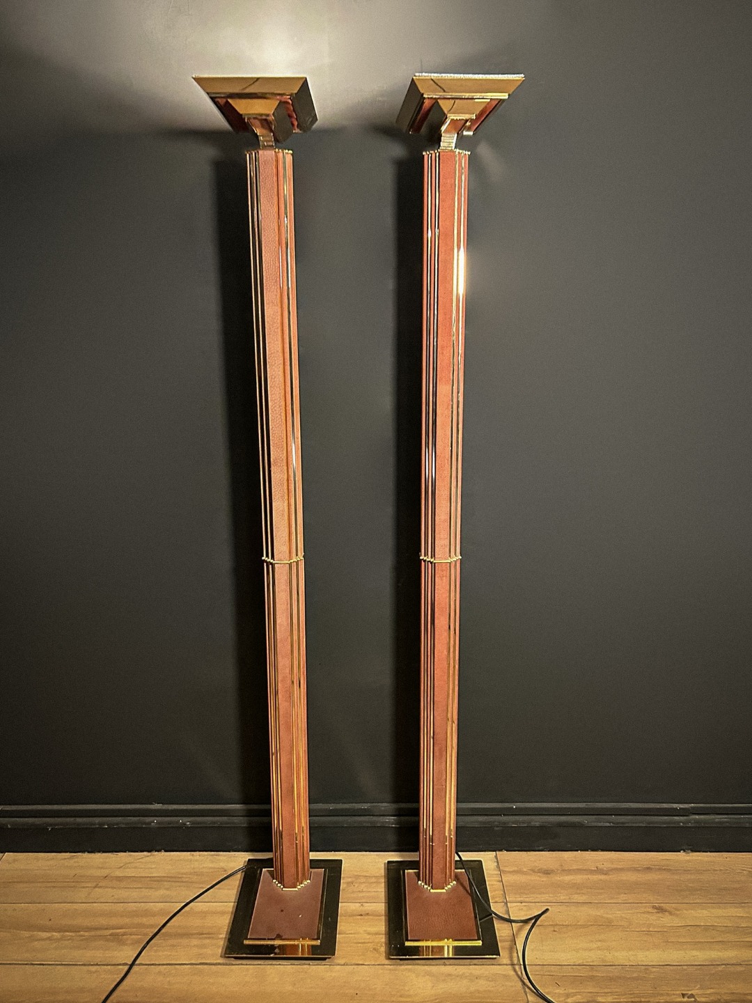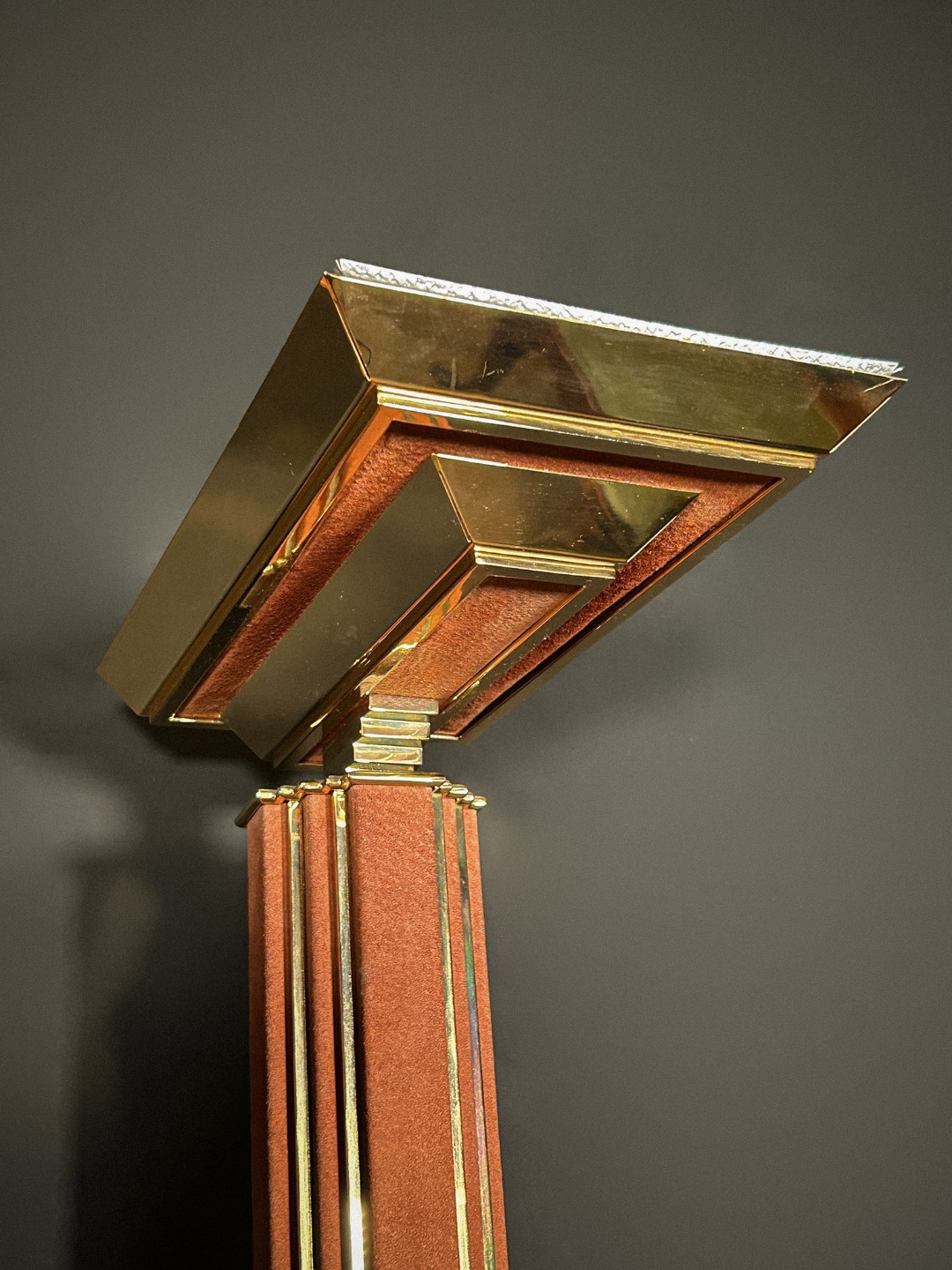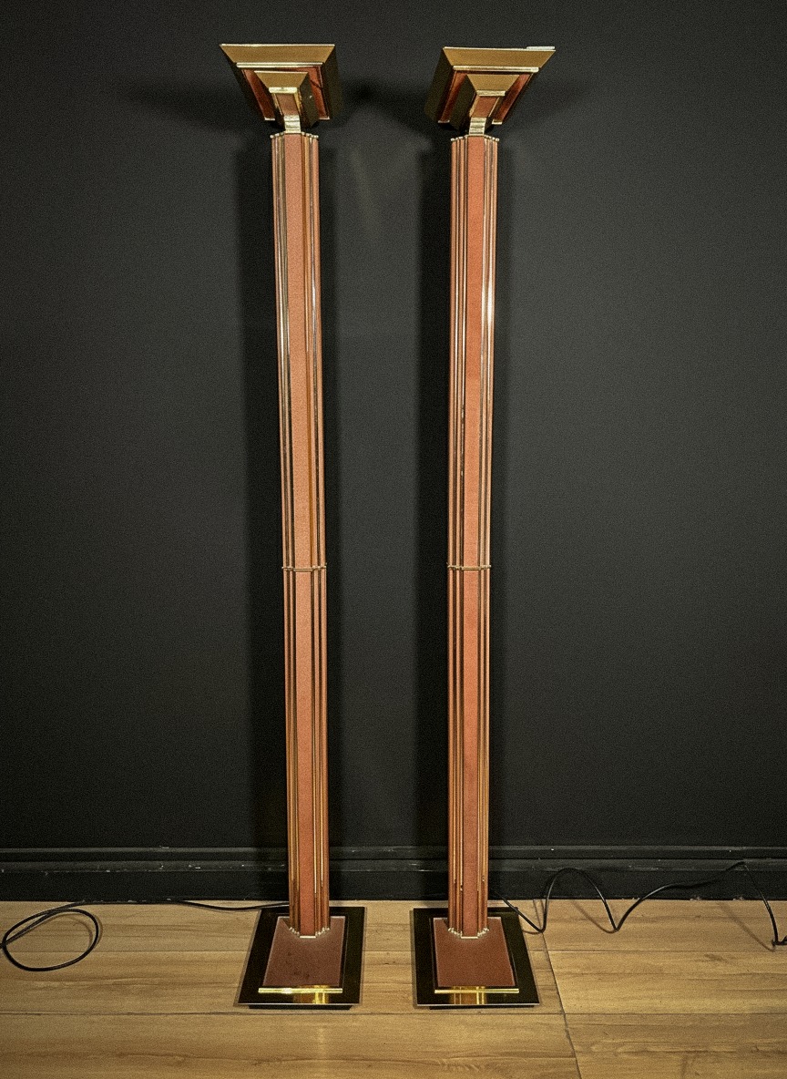 Elegante coppia di lampade da terra dal design vintage, caratterizzate da un raffinato rivestimento in alcantara color terracotta e da inserti e profili in ottone lucido, che conferiscono un aspetto lussuoso e scenografico.