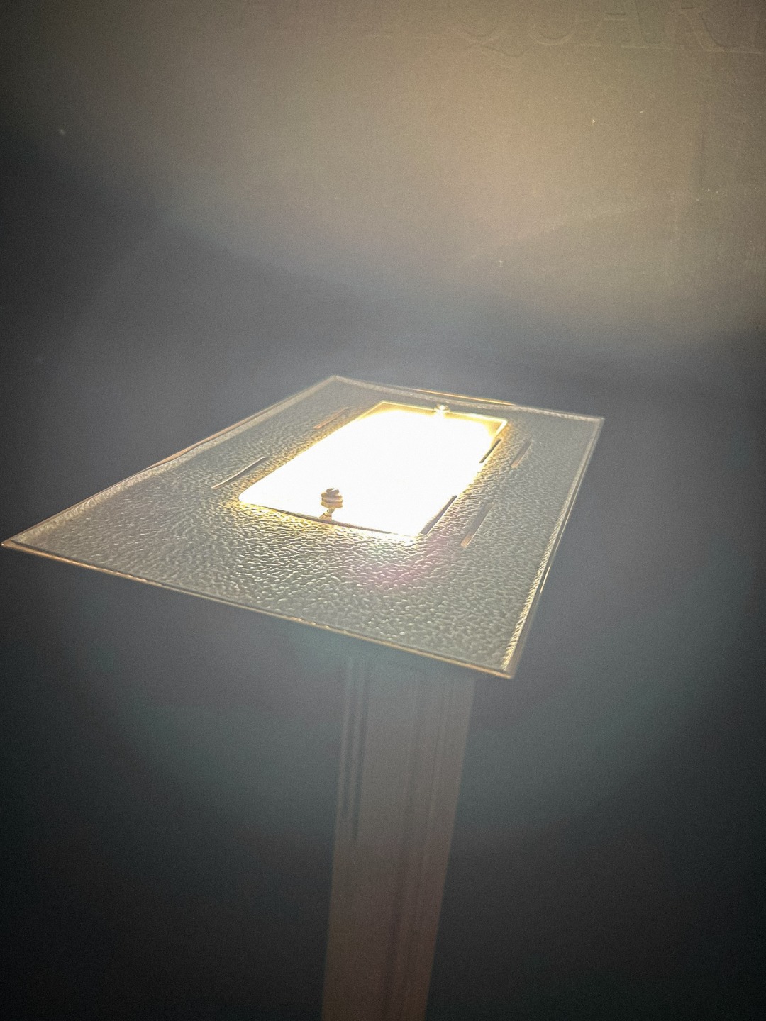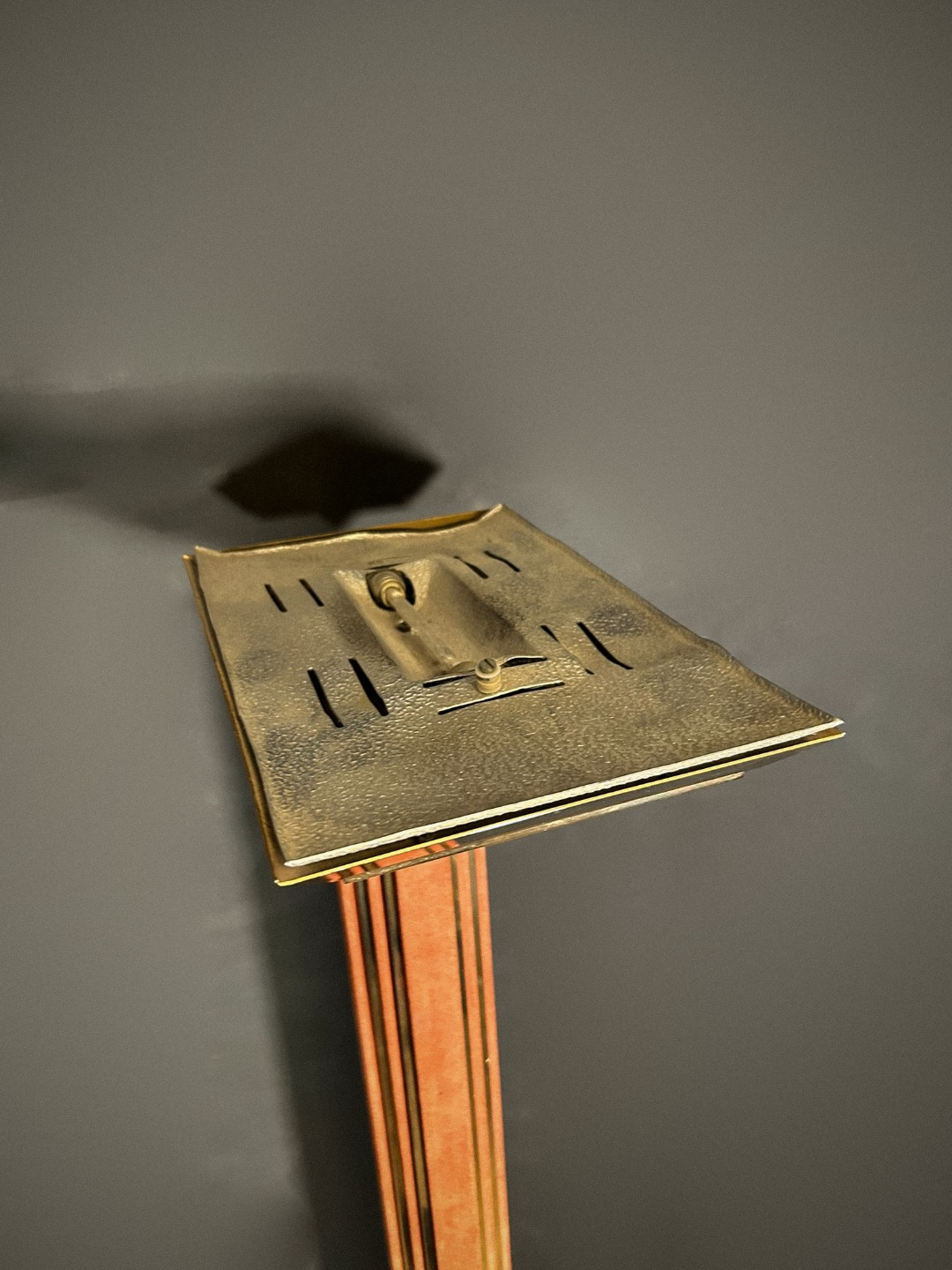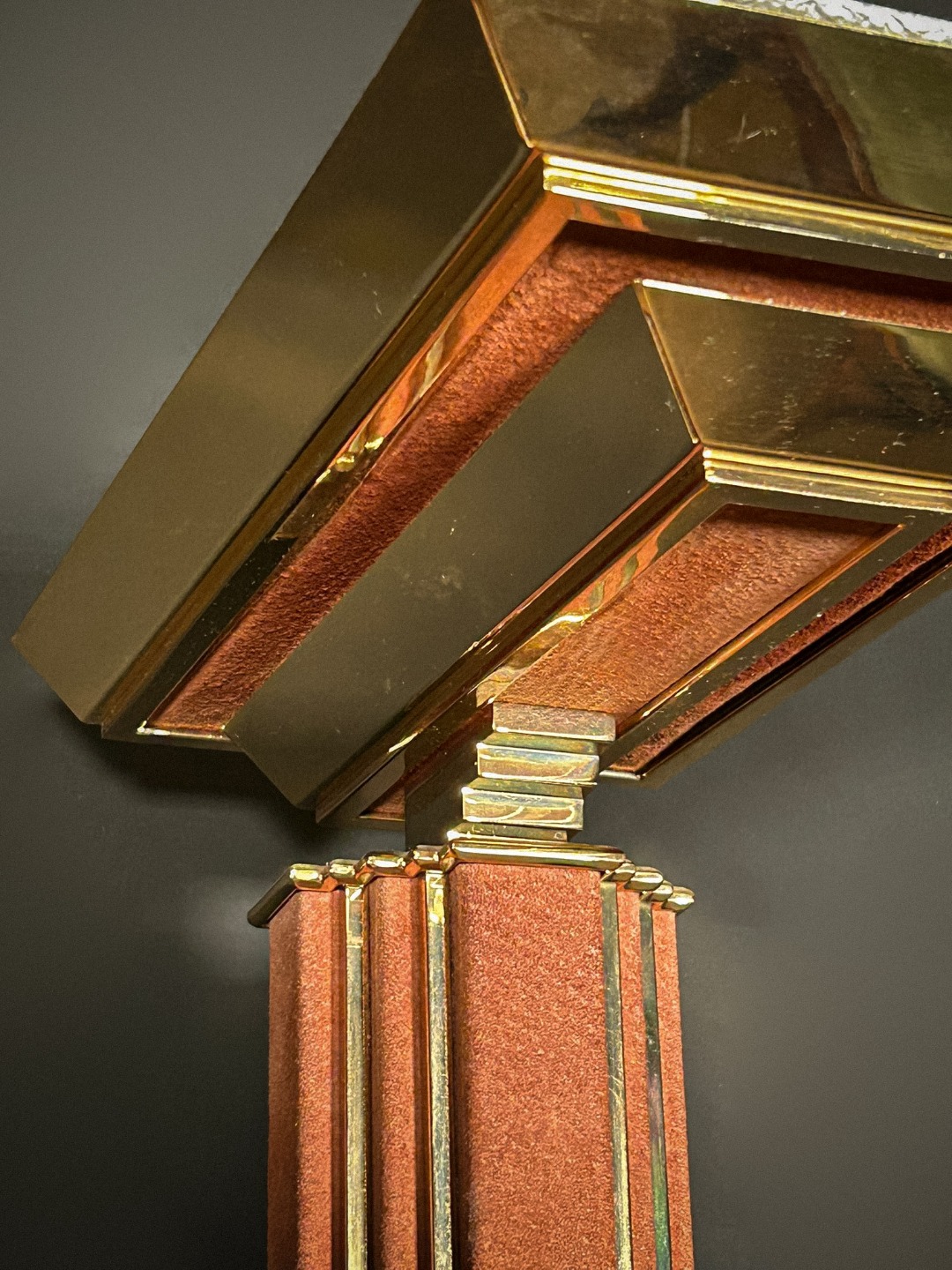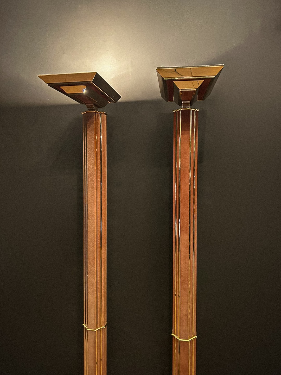 Elegante coppia di lampade da terra dal design vintage, caratterizzate da un raffinato rivestimento in alcantara color terracotta e da inserti e profili in ottone lucido, che conferiscono un aspetto lussuoso e scenografico.