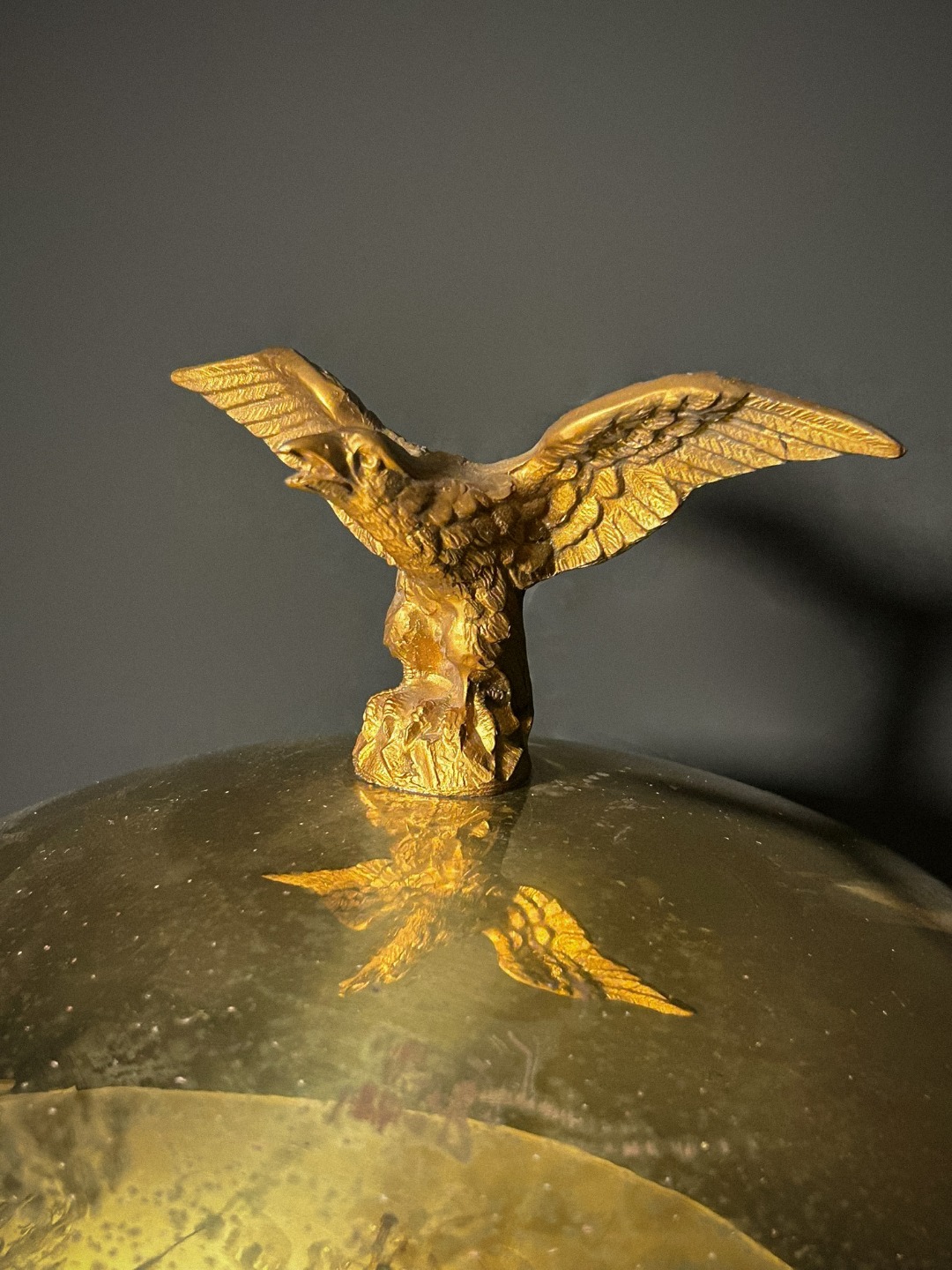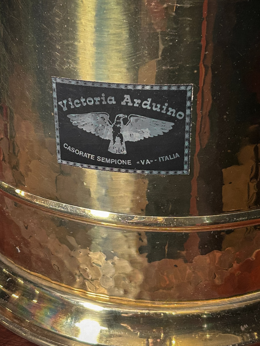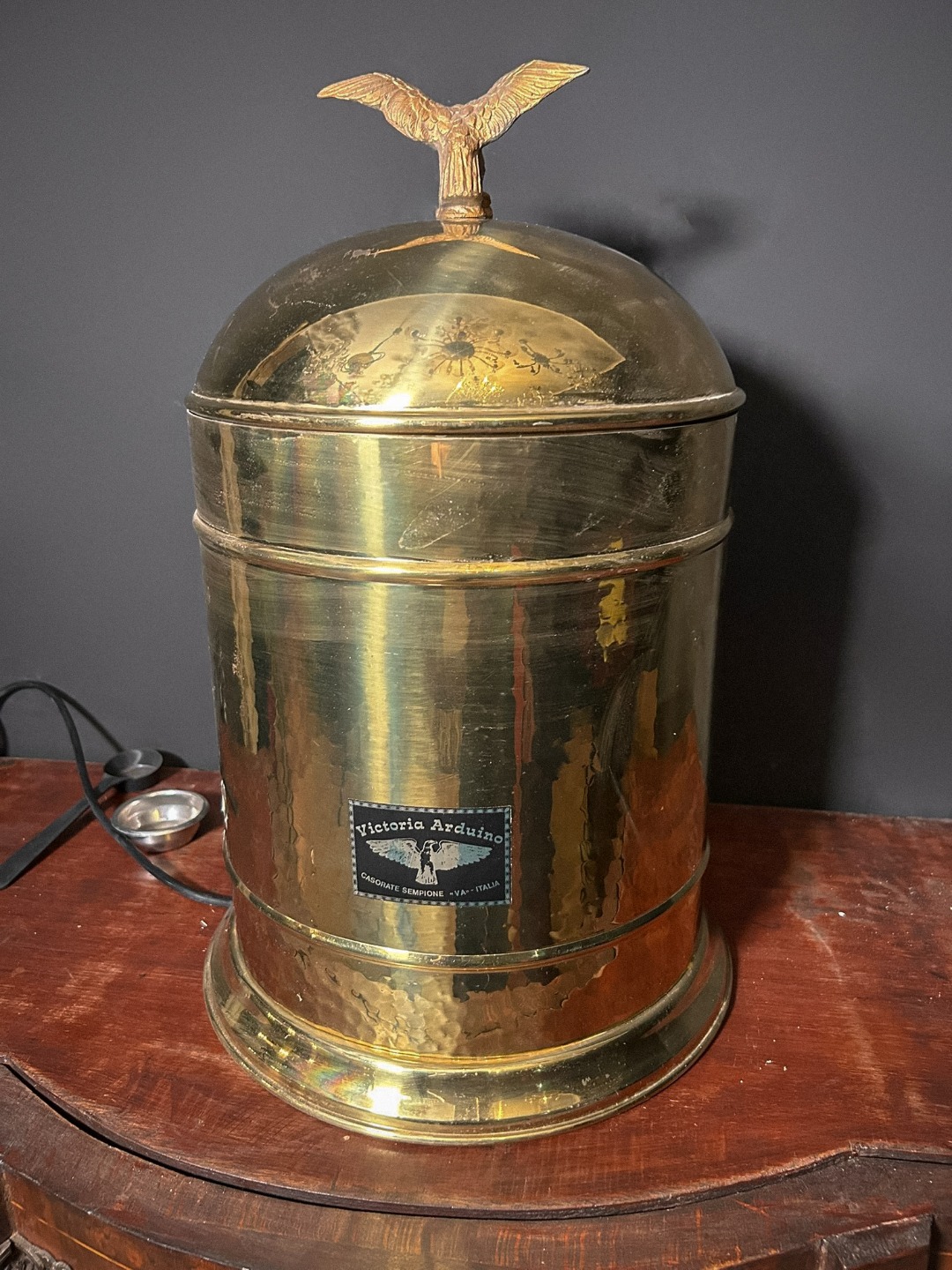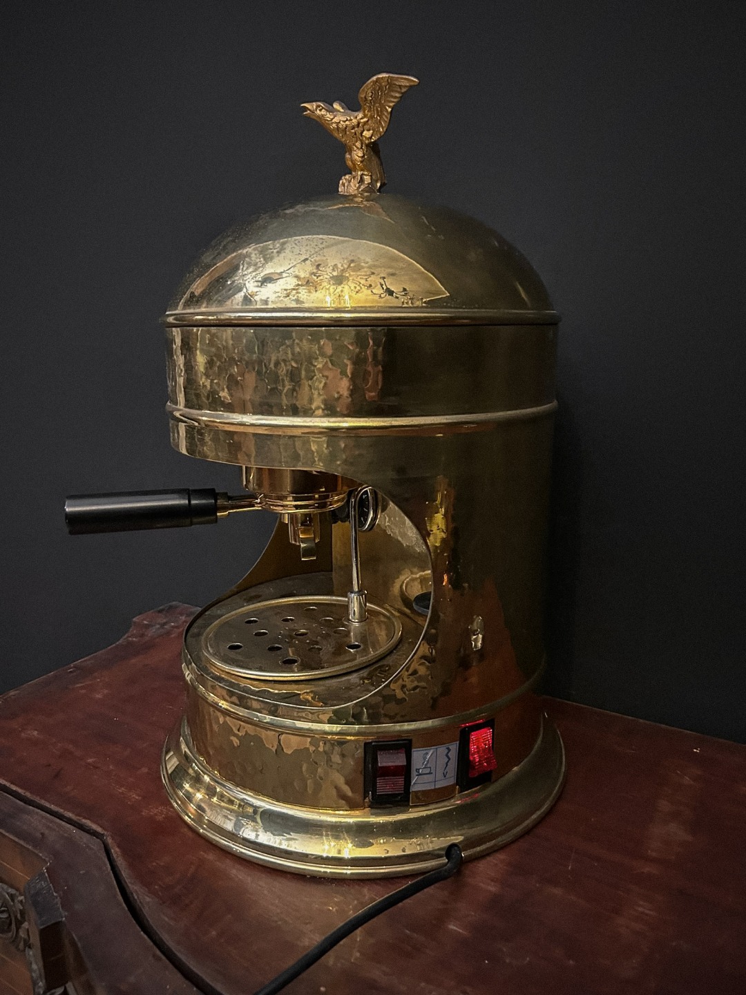 Affascinante macchina da caffè espresso Venus Family di Victoria Arduino, caratterizzata dalla sua iconica carrozzeria cilindrica in ottone martellato a mano, realizzata da esperti artigiani. L’estetica è impreziosita dalla grande cupola superiore, sormontata da un’aquila dorata modellata con finissime dettagliature, simbolo storico dell’azienda.