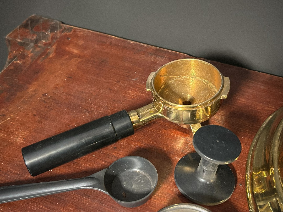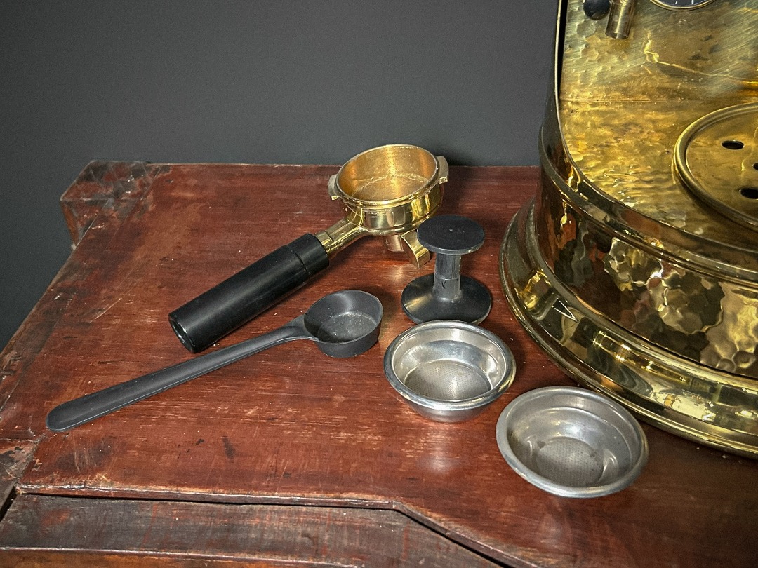 portafiltro in ottone, pressino, cucchiaino dosatore e filtri in acciaio.