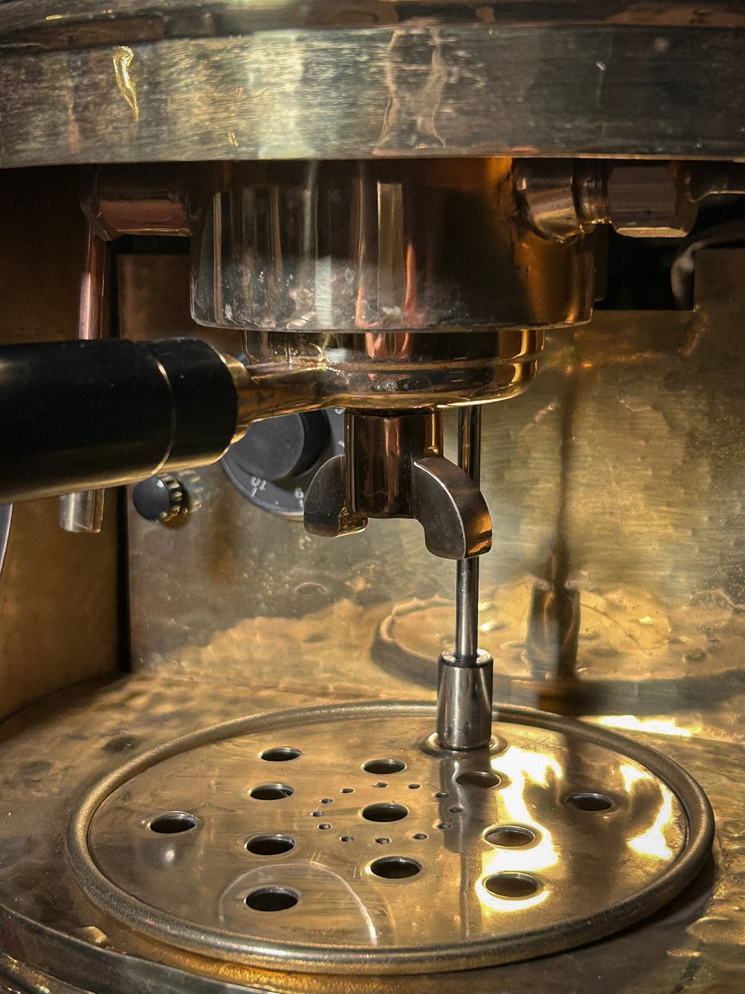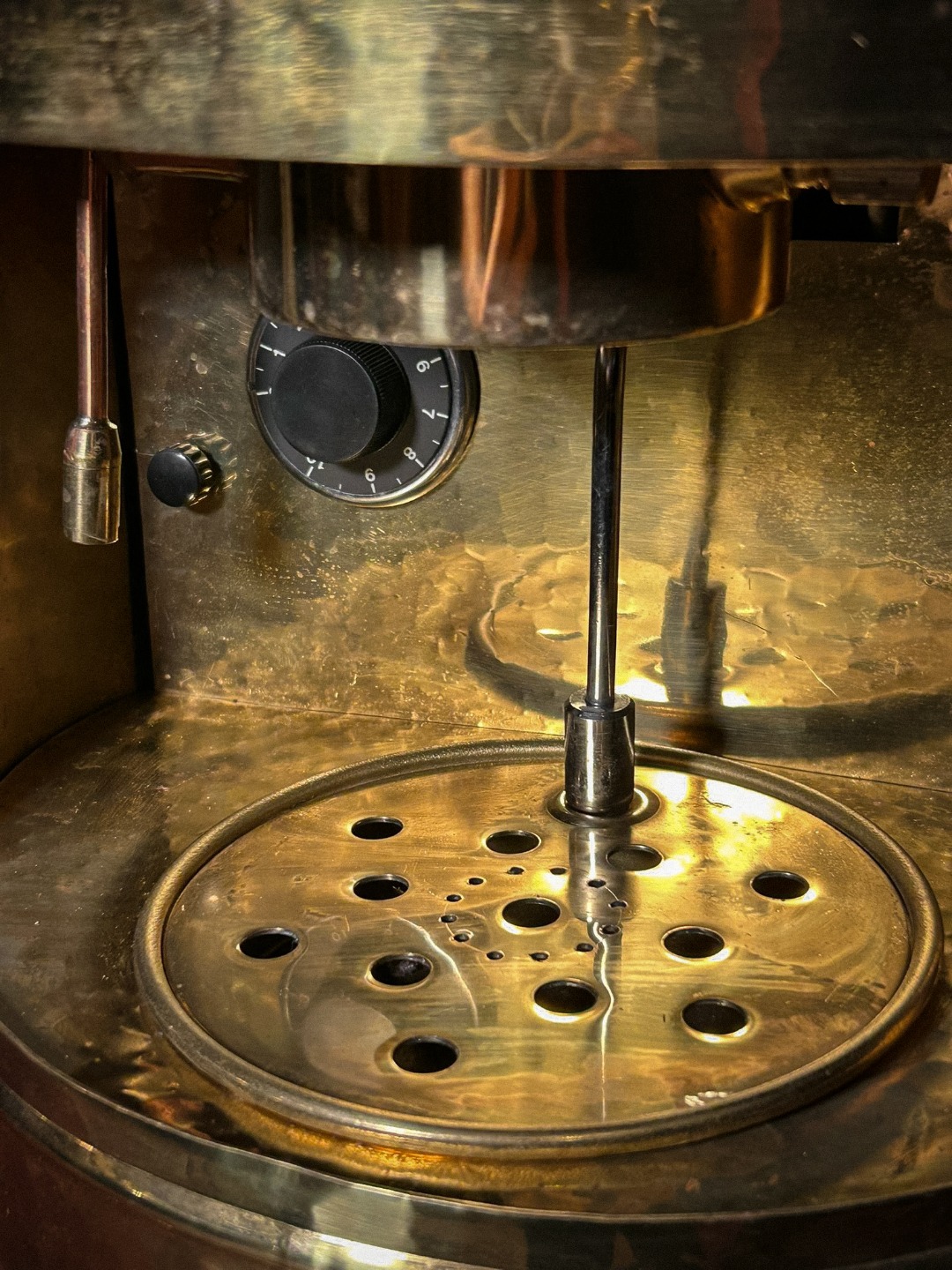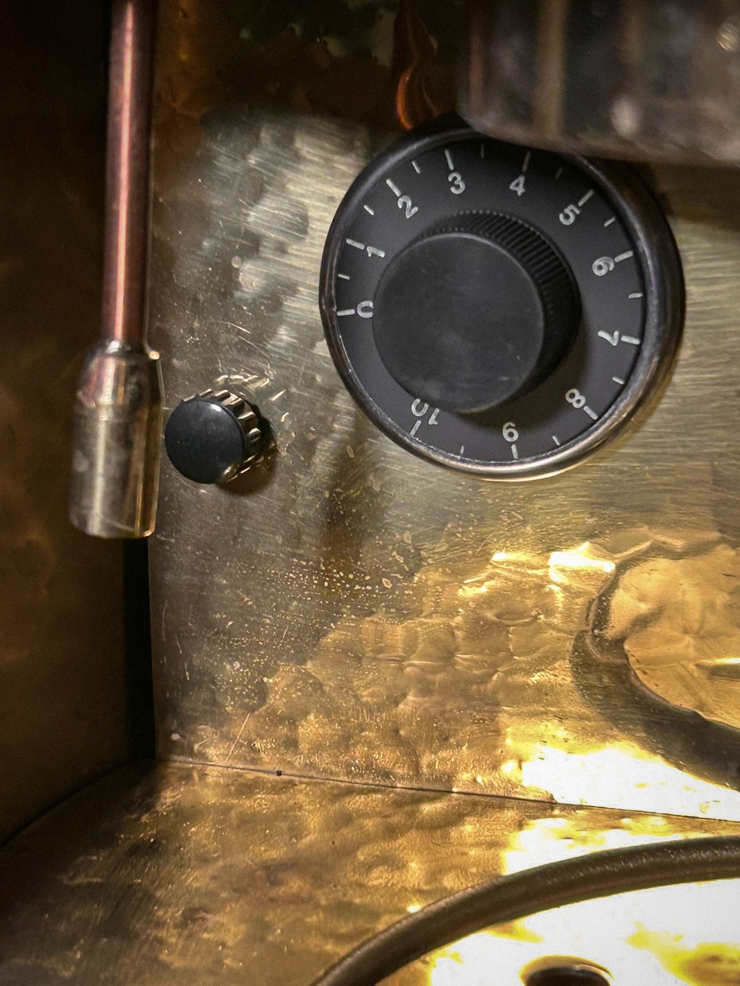 La macchina presenta un’apertura frontale che permette l’accesso diretto al gruppo erogatore professionale, completo di portafiltro, griglia poggia-tazze traforata e lancia vapore laterale. L’interno, completamente in ottone, valorizza la riflessione della luce e dona al pezzo un aspetto scenografico.