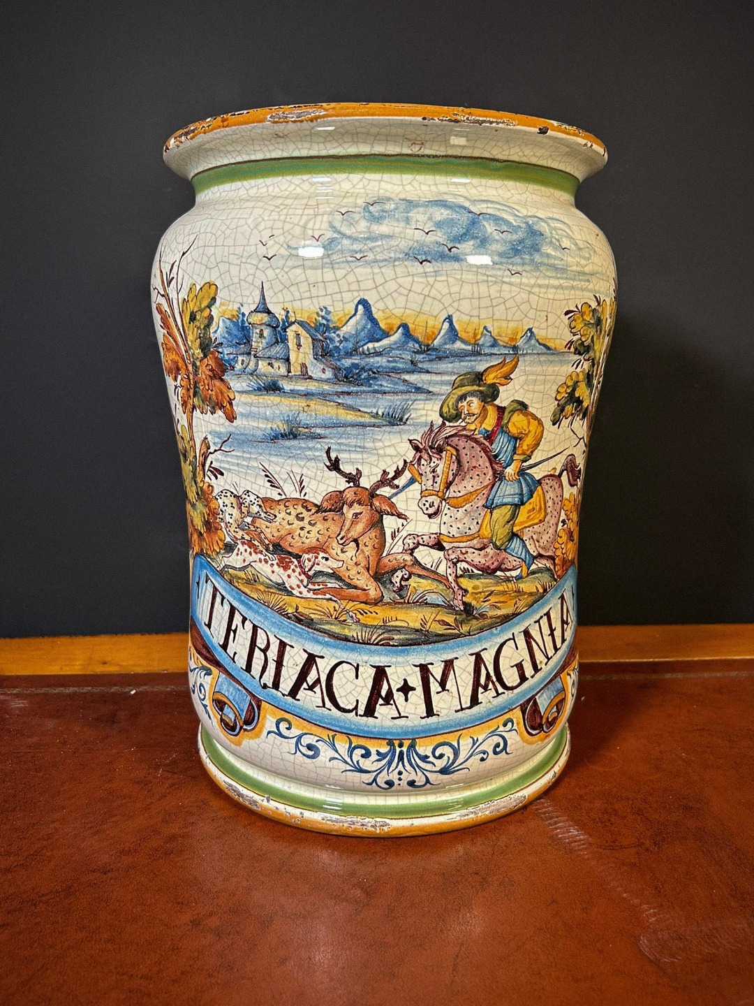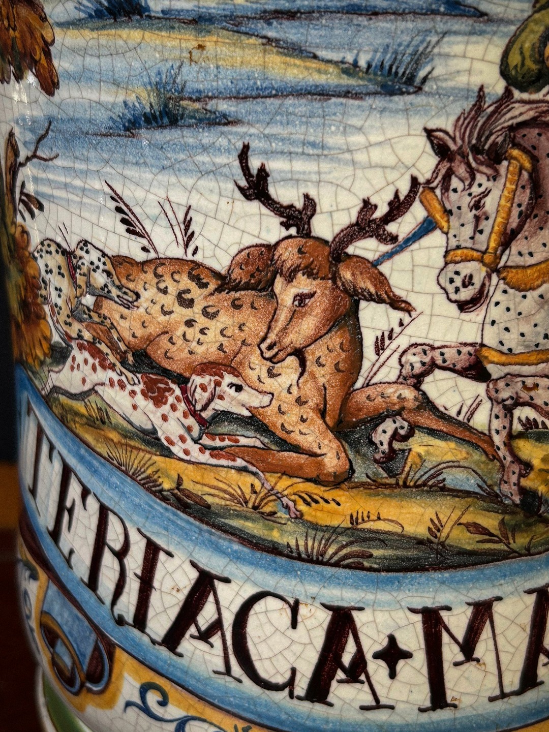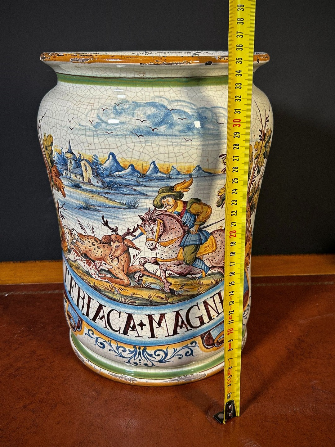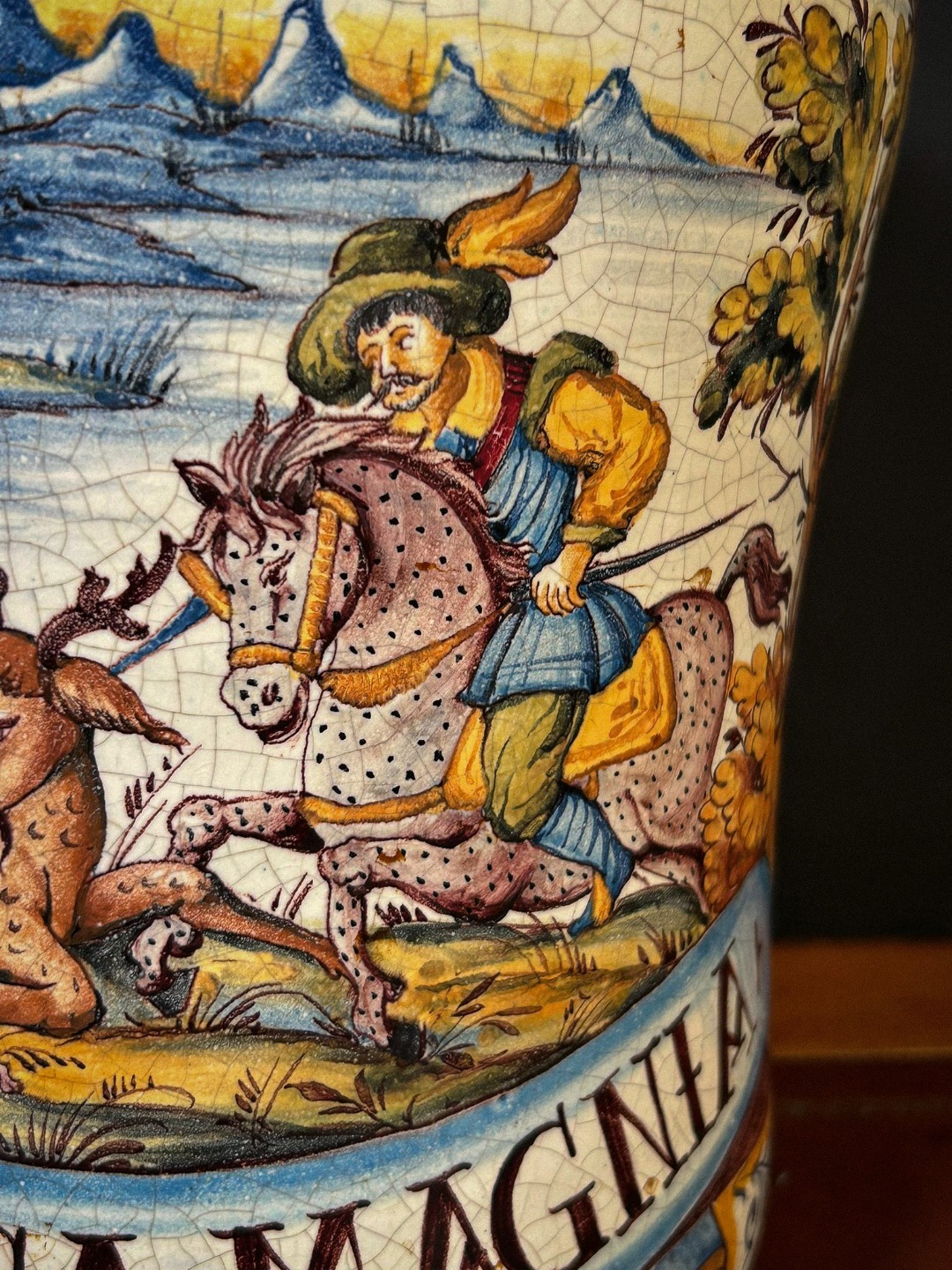 Importante albarello farmaceutico in maiolica decorata, caratterizzato da una vivace scena pittorica rinascimentale che raffigura un cacciatore a cavallo nell’atto di inseguire un cervo, ambientata in un paesaggio collinare con edifici e natura circostante. La superficie presenta una fitta craquelure che ne accentua il fascino antico.