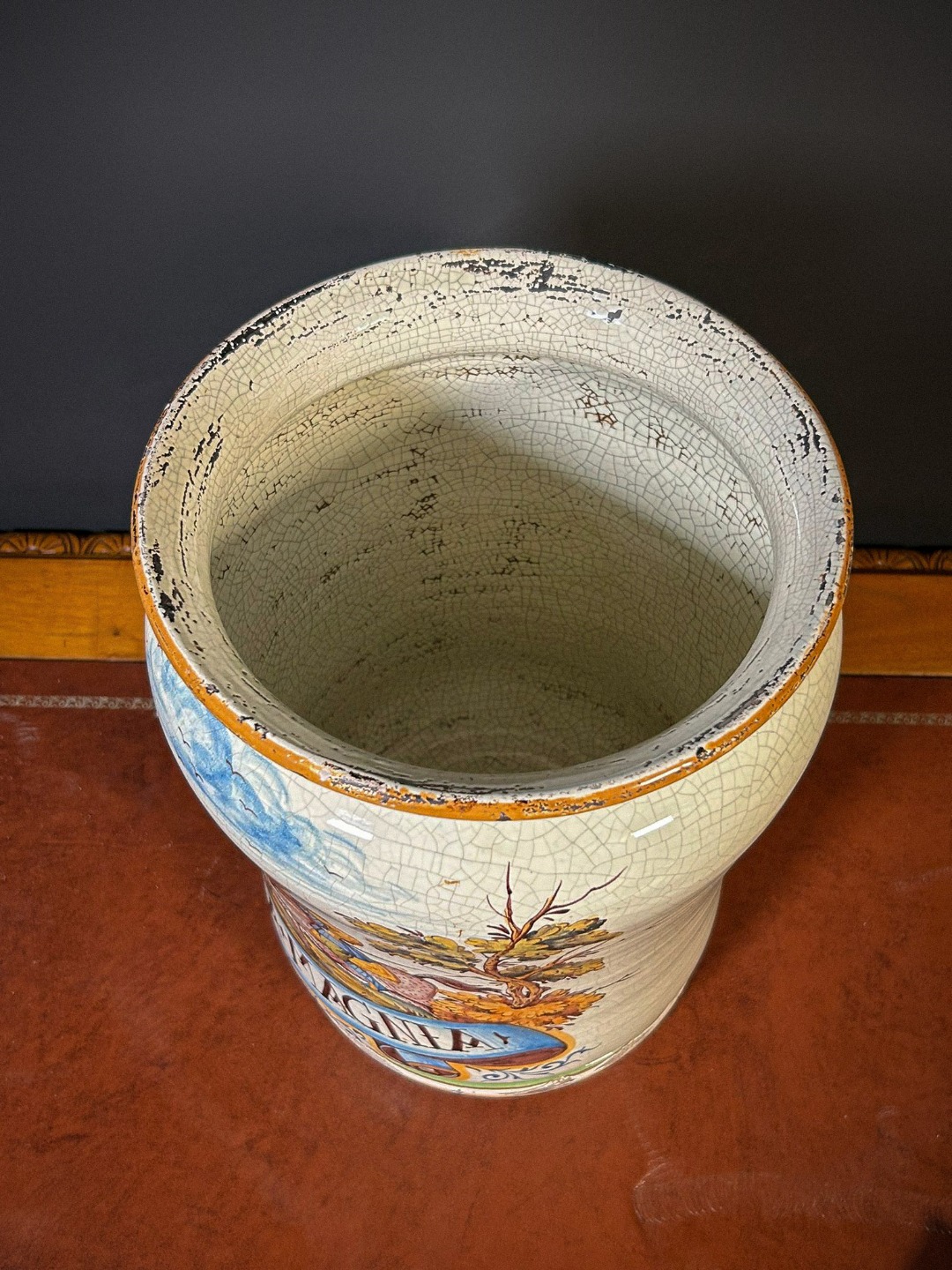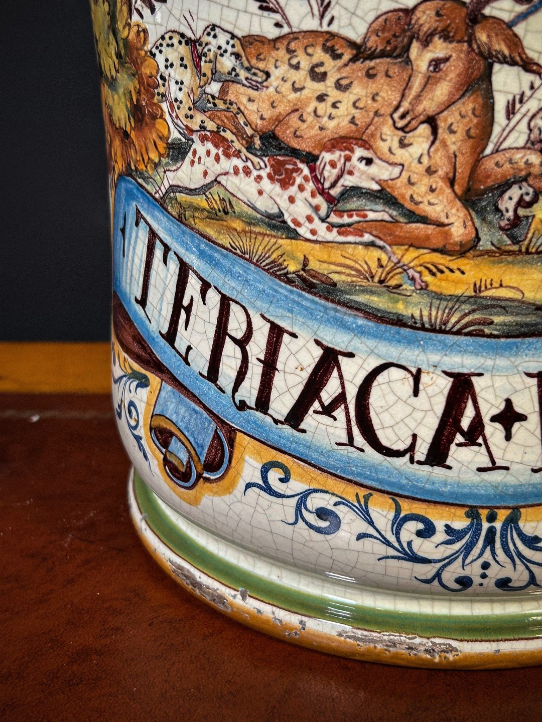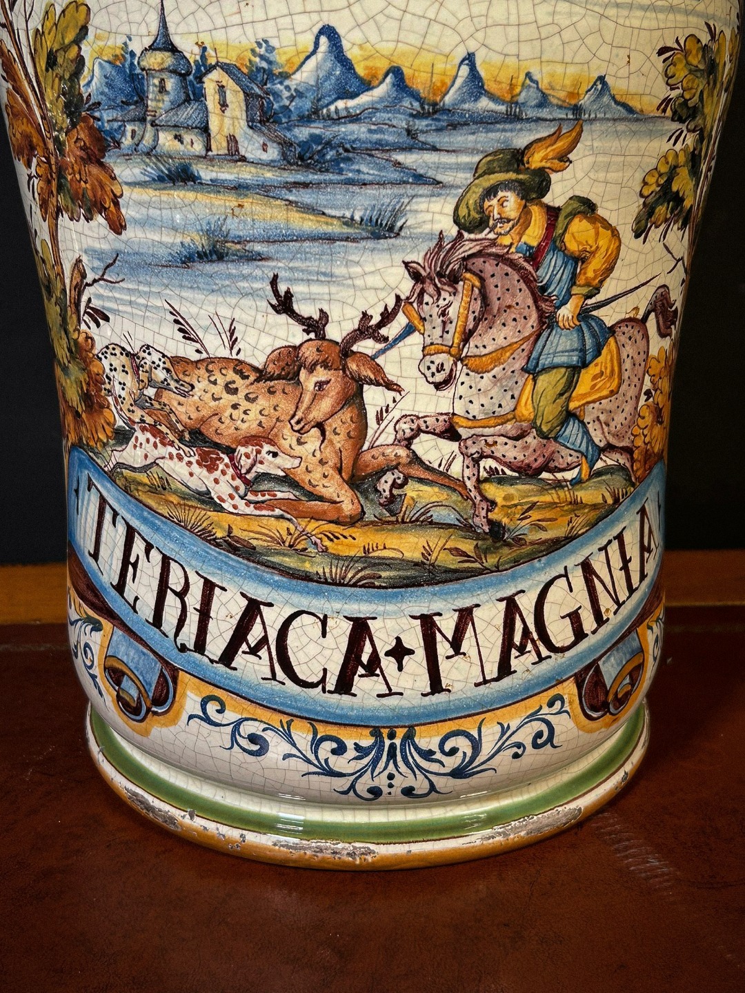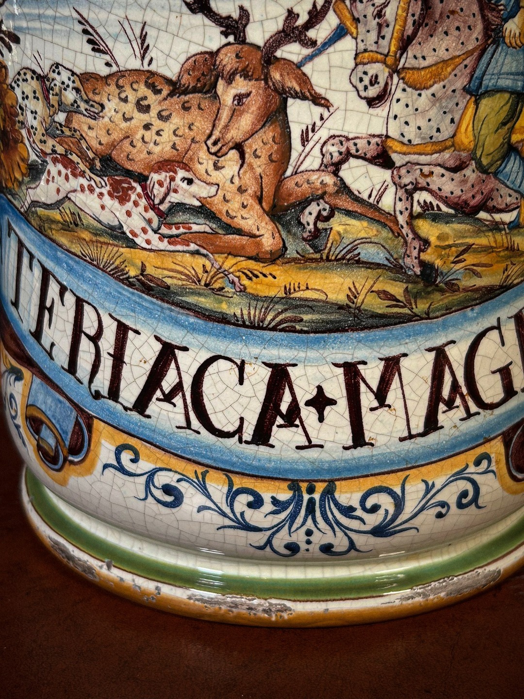 Importante albarello farmaceutico in maiolica decorata, caratterizzato da una vivace scena pittorica rinascimentale che raffigura un cacciatore a cavallo nell’atto di inseguire un cervo, ambientata in un paesaggio collinare con edifici e natura circostante. La superficie presenta una fitta craquelure che ne accentua il fascino antico.