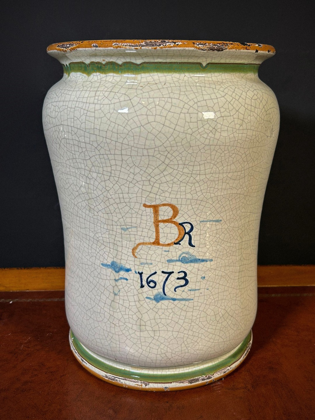 La parte frontale riporta la dicitura “Teriaca Magnia”, tipica denominazione di antichi rimedi medicamentosi. Il retro è marcato con la sigla “BR” e la data “1673”, elemento decorativo ispirato alle tradizioni delle antiche botteghe ceramiche italiane.