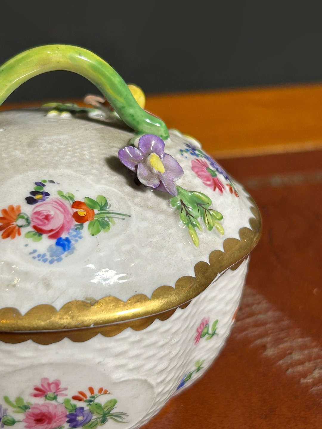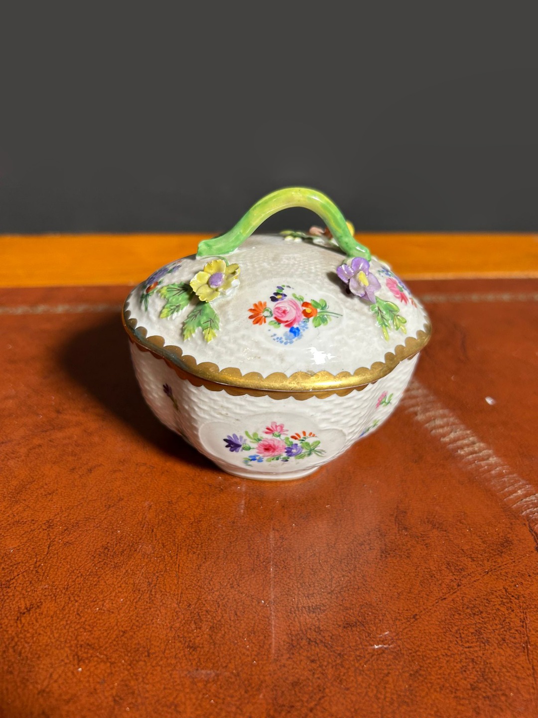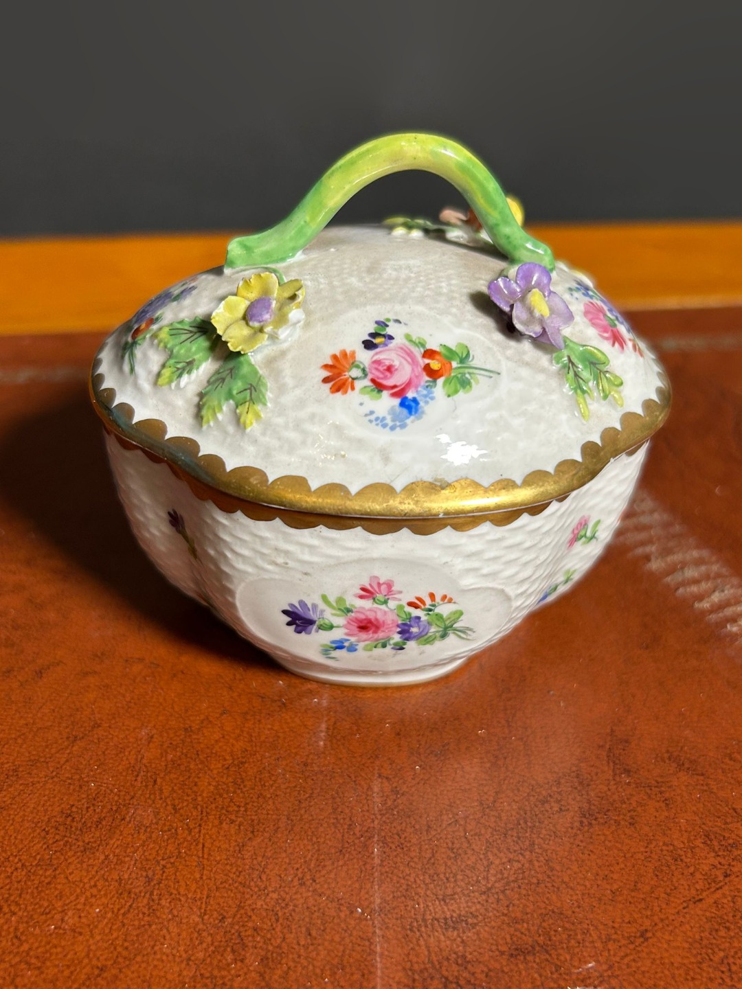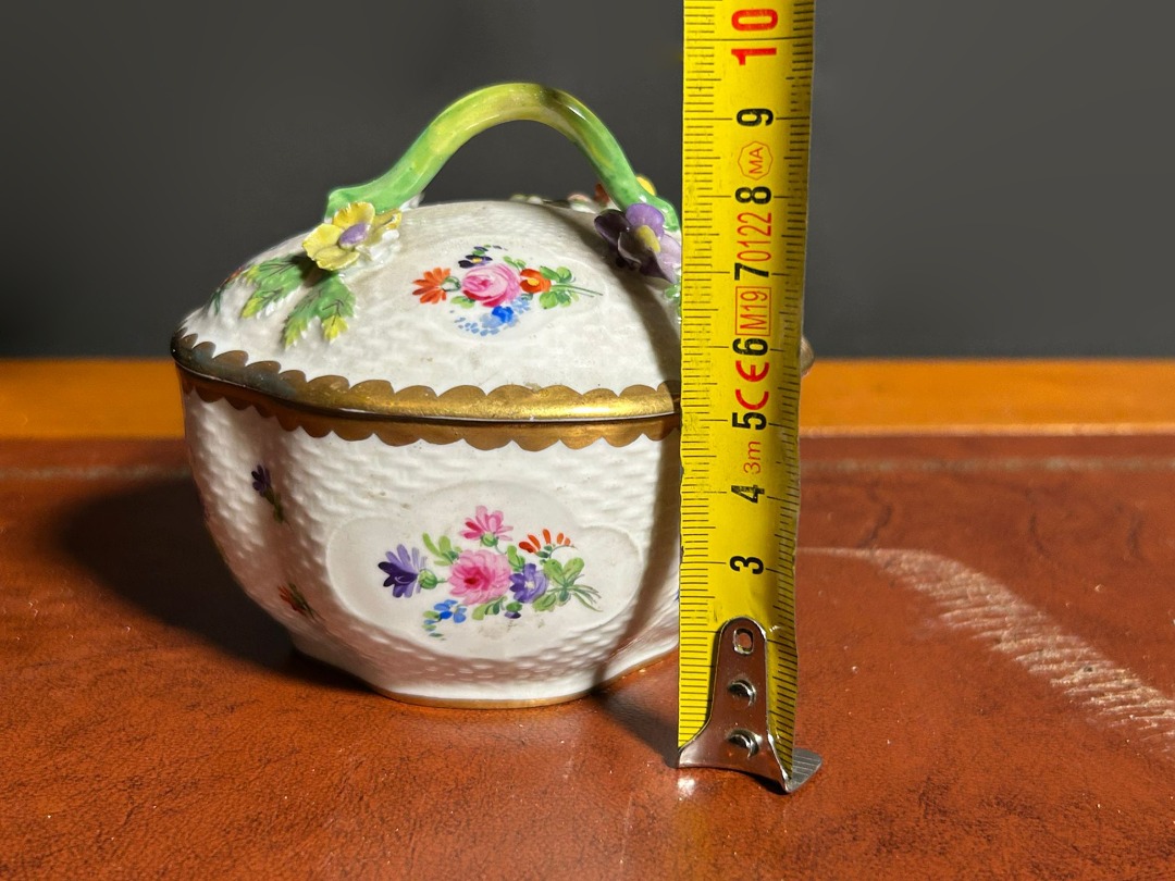 Il coperchio presenta una ricca decorazione floreale tridimensionale modellata e applicata a mano, con un manico verde a ramo ornato da fiori policromi, anch’essi modellati singolarmente. Internamente, sia il contenitore che il coperchio mostrano ulteriori piccole decorazioni floreali dipinte.