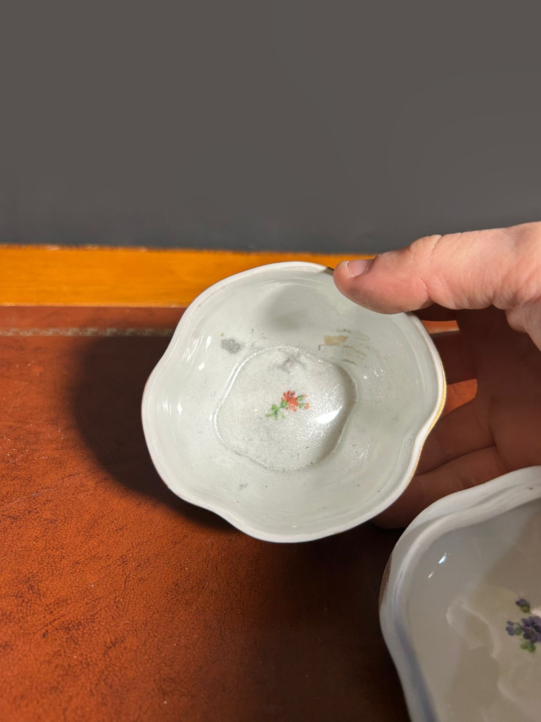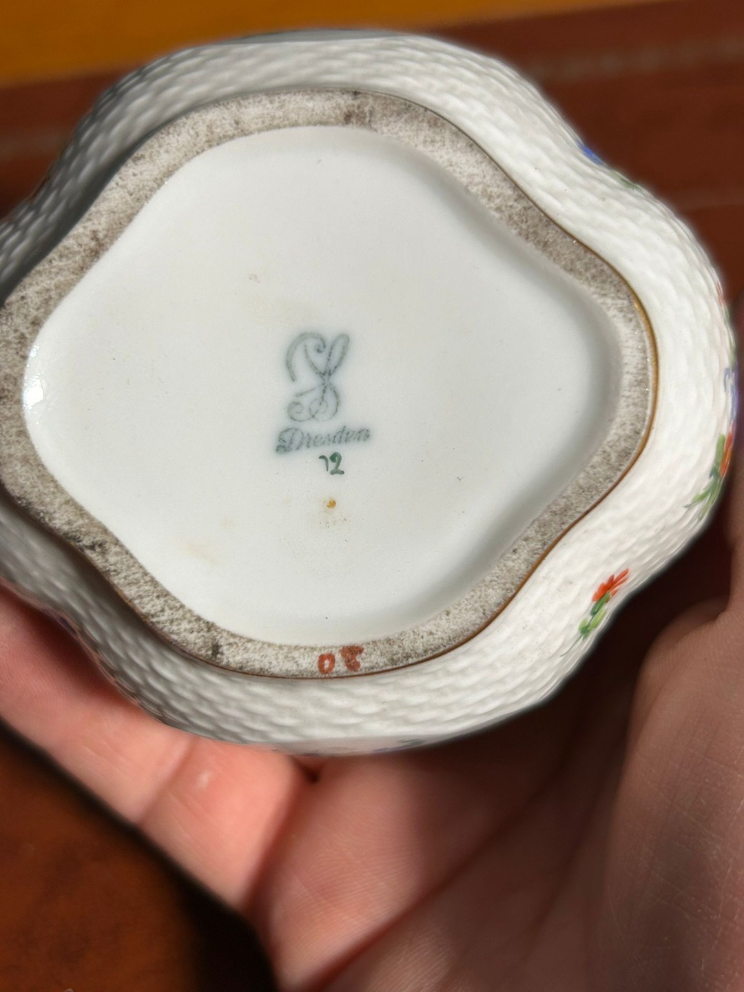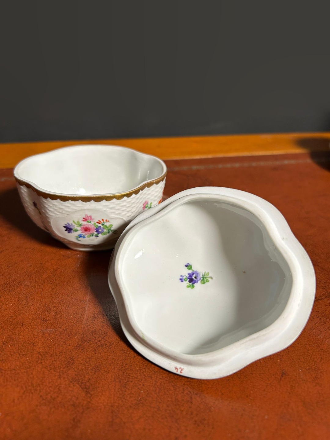 Il coperchio presenta una ricca decorazione floreale tridimensionale modellata e applicata a mano, con un manico verde a ramo ornato da fiori policromi, anch’essi modellati singolarmente. Internamente, sia il contenitore che il coperchio mostrano ulteriori piccole decorazioni floreali dipinte.