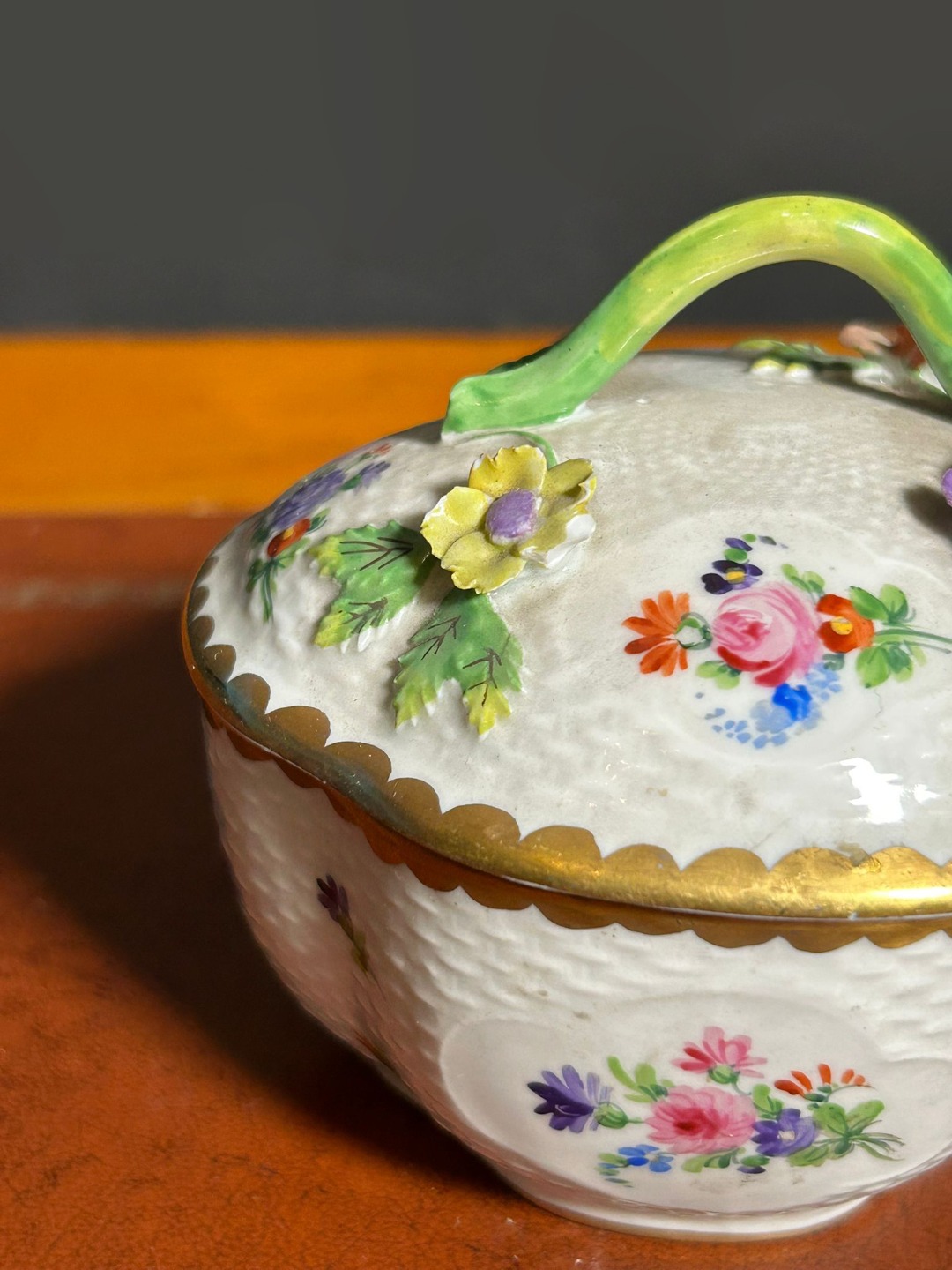 Deliziosa zuccheriera in porcellana finemente decorata, caratterizzata da una forma mossa a quattro lobi e da una superficie esterna con lavorazione a rilievo. L’intero corpo è impreziosito da mazzetti floreali policromi dipinti a mano, tipici della produzione ottocentesca, completati da eleganti profili in oro zecchino lungo il bordo.