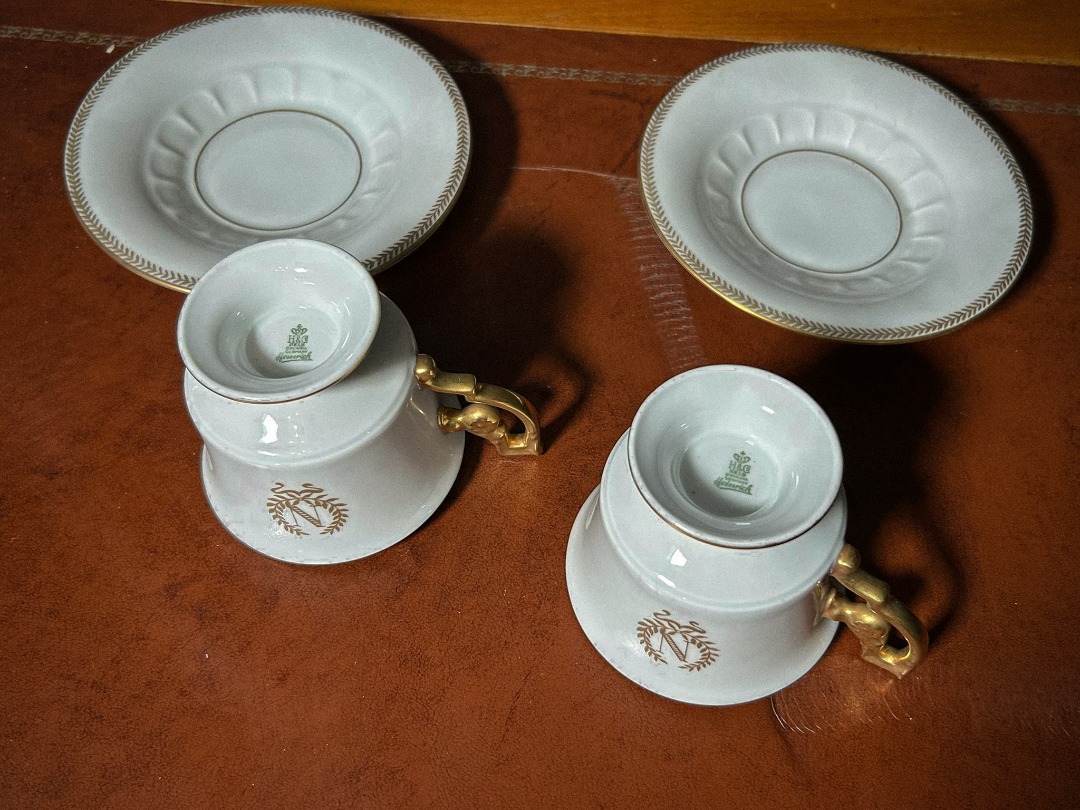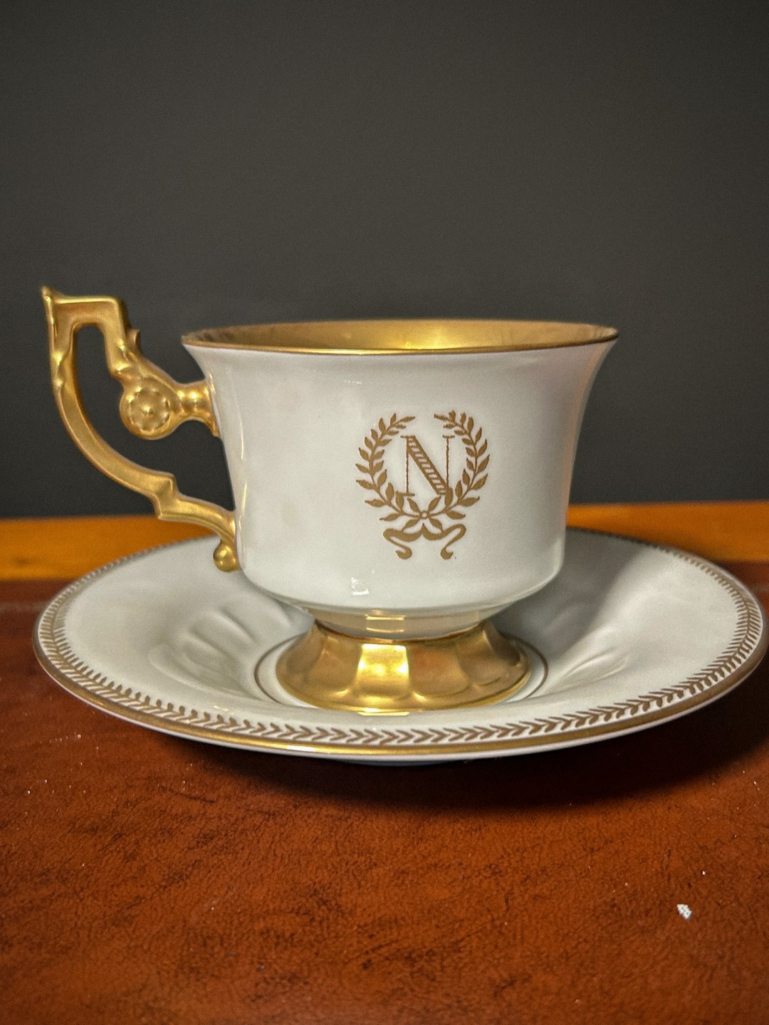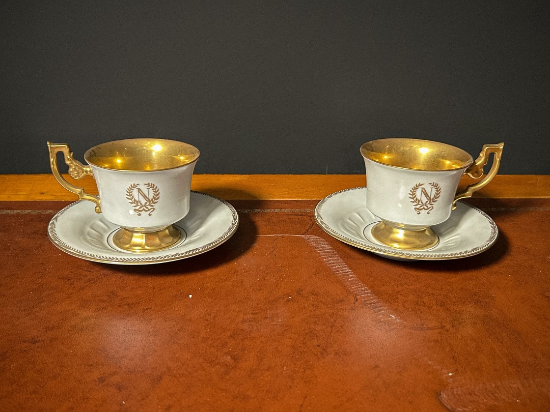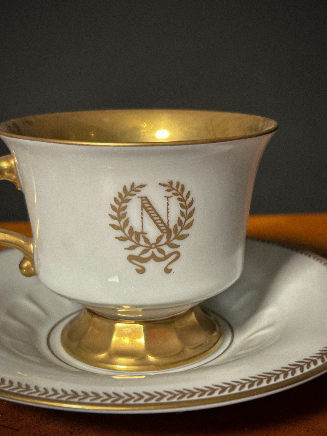 Il decoro frontale presenta un monogramma “N” incorniciato da una corona d’alloro dorata, eseguito con grande precisione ed eleganza, dettaglio che conferisce un carattere celebrativo e ornamentale al servizio. I manici, finemente modellati e completati da doratura piena, presentano un design geometrico d’ispirazione neoclassica.
