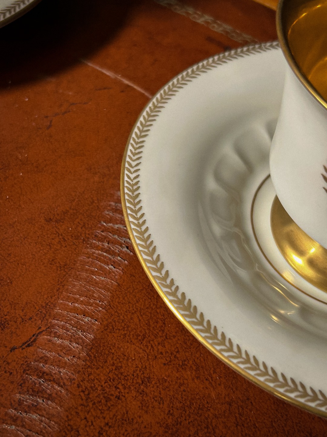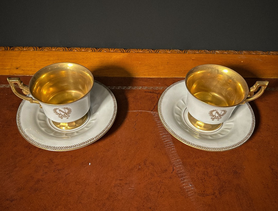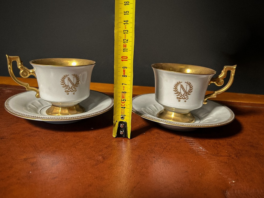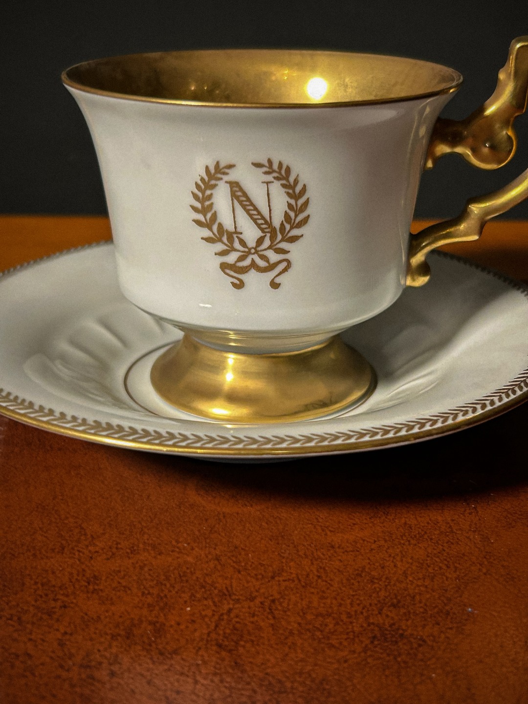 Il decoro frontale presenta un monogramma “N” incorniciato da una corona d’alloro dorata, eseguito con grande precisione ed eleganza, dettaglio che conferisce un carattere celebrativo e ornamentale al servizio. I manici, finemente modellati e completati da doratura piena, presentano un design geometrico d’ispirazione neoclassica.