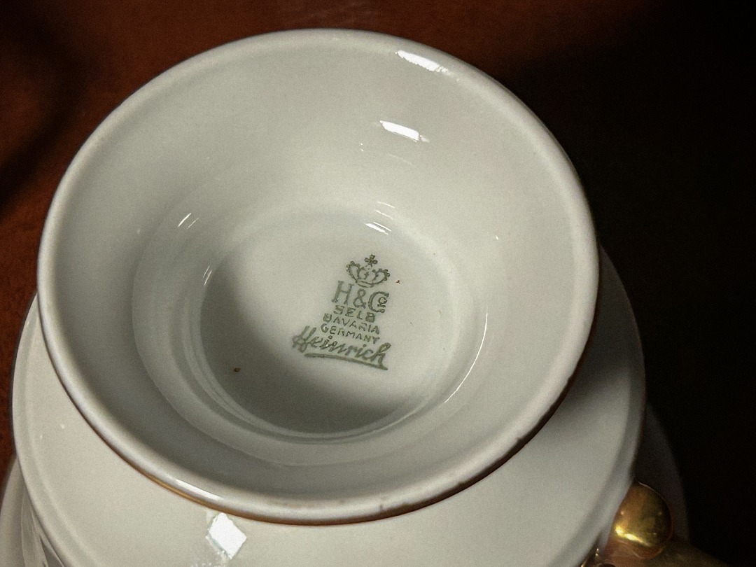 Elegante coppia di tazze in porcellana prodotte dalla manifattura tedesca Heinrich (H&C Selb, Bavaria), finemente decorate con applicazioni dorate interne ed esterne. La forma leggermente svasata si unisce a una base sagomata interamente dorata, creando un contrasto raffinato con il bianco puro della porcellana.