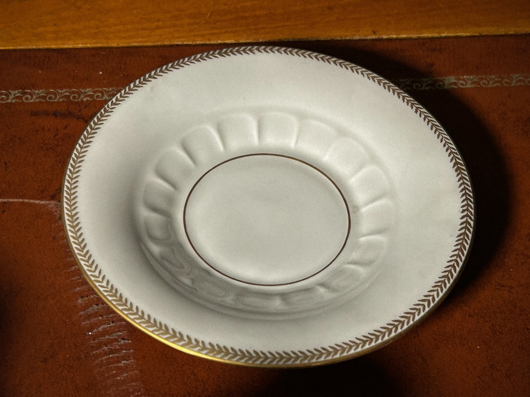 I piattini coordinati ripropongono la stessa sobrietà formale, arricchiti da una bordatura a greca dorata eseguita a mano.