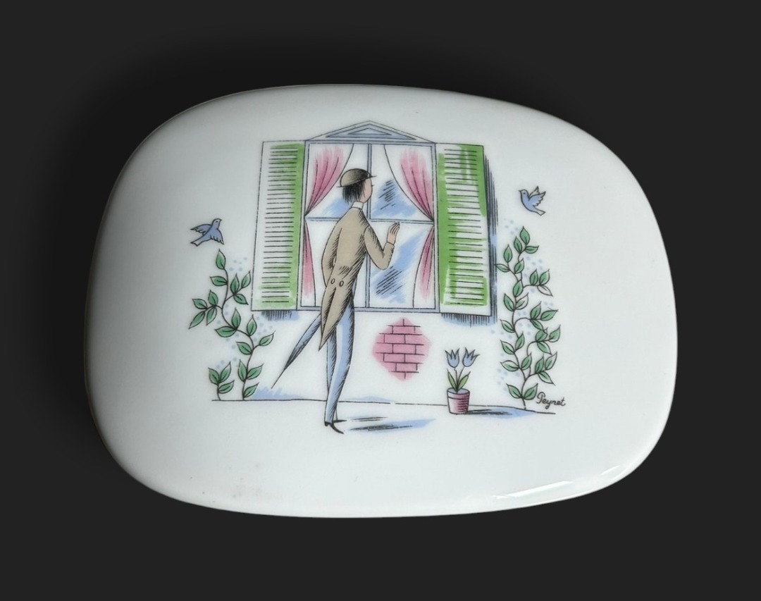 La scatola presenta una forma morbida e leggermente asimmetrica, con delicata decorazione policroma dai toni pastello. Le scene raffigurano le tipiche figure poetiche di Peynet: linee sottili, atmosfera sognante e stile inconfondibile.