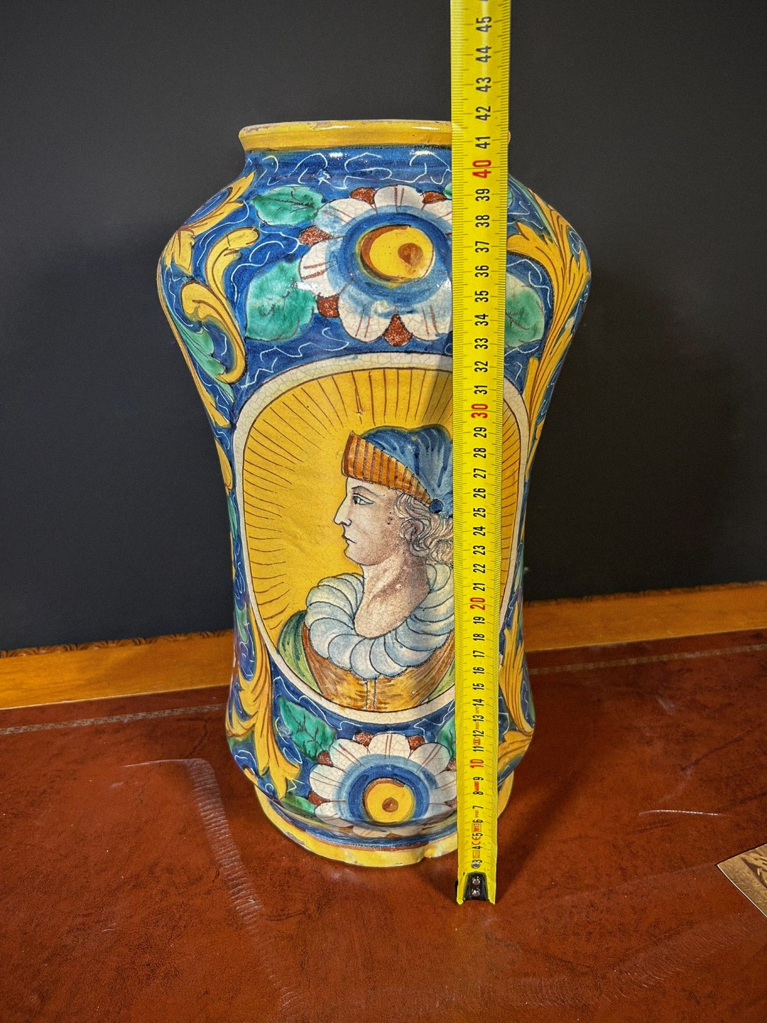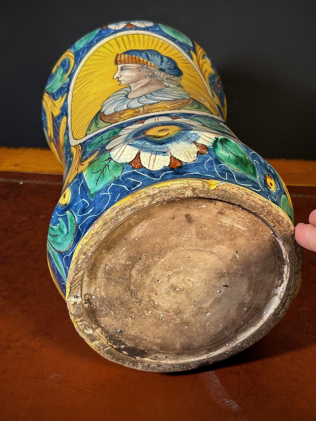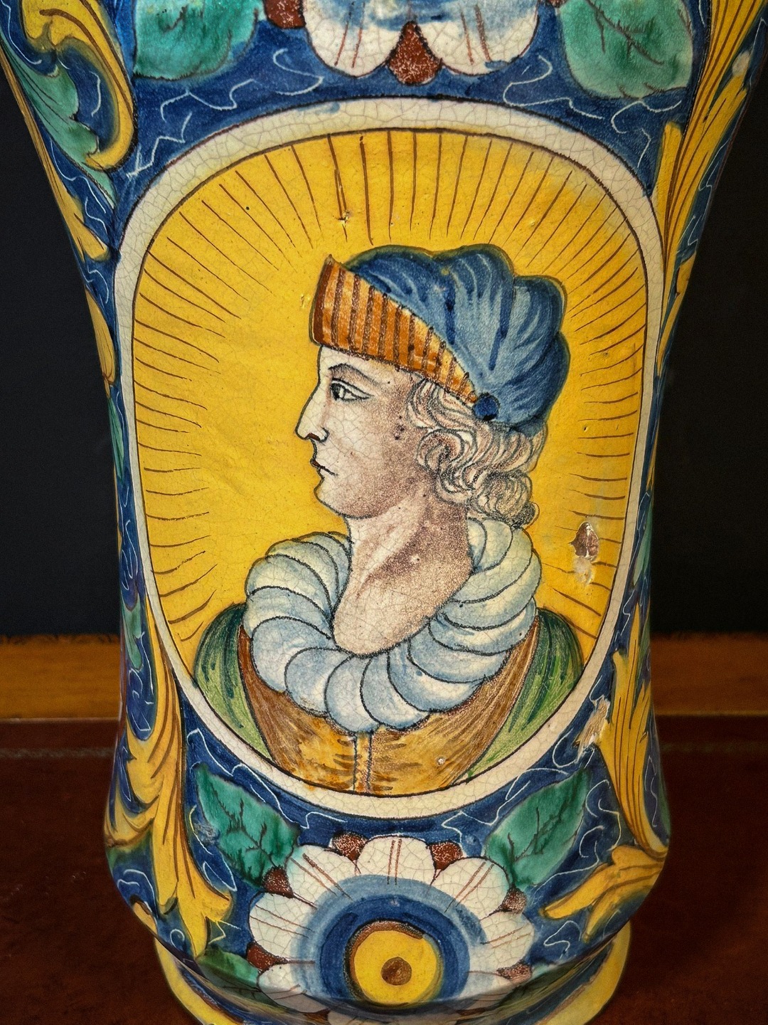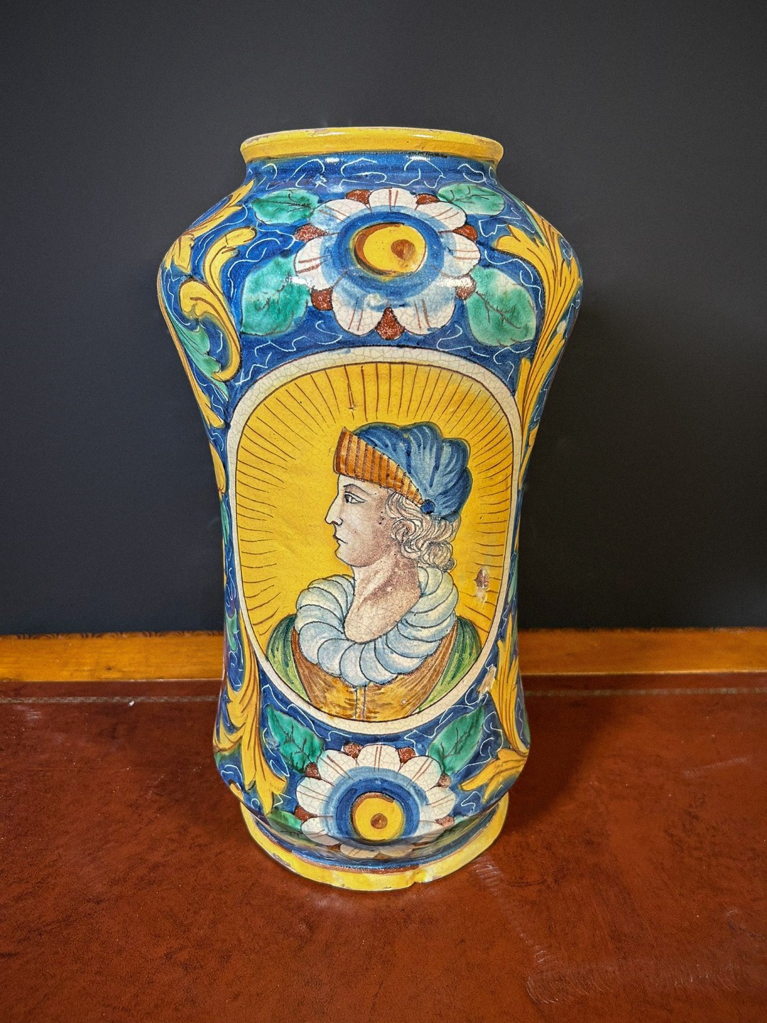 Importante vaso da farmacia in maiolica dipinta, caratterizzato da una decorazione policroma estremamente vivace e ricca. Su due lati opposti presenta grandi medaglioni con ritratti maschili stilizzati, uno coronato e l’altro con copricapo rinascimentale, entrambi immersi in un fondale giallo raggiato che ne esalta la presenza scenica.